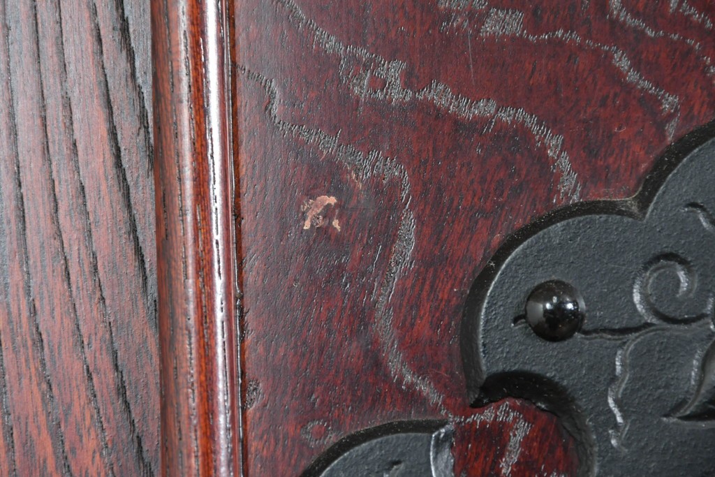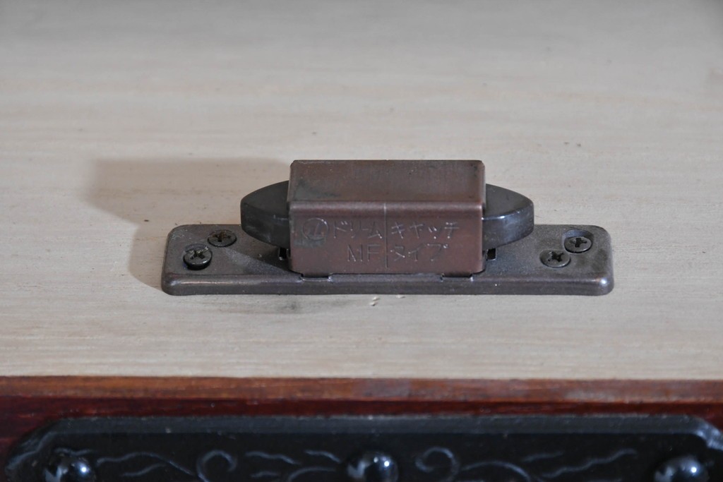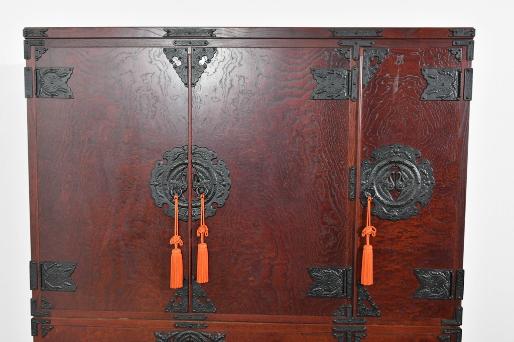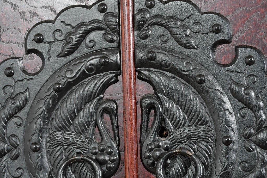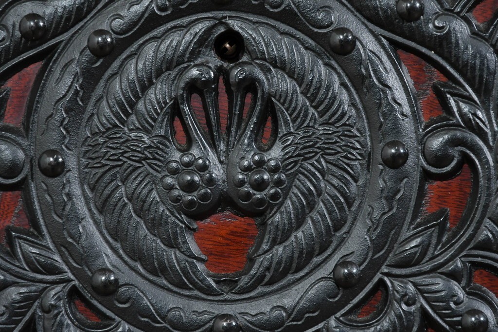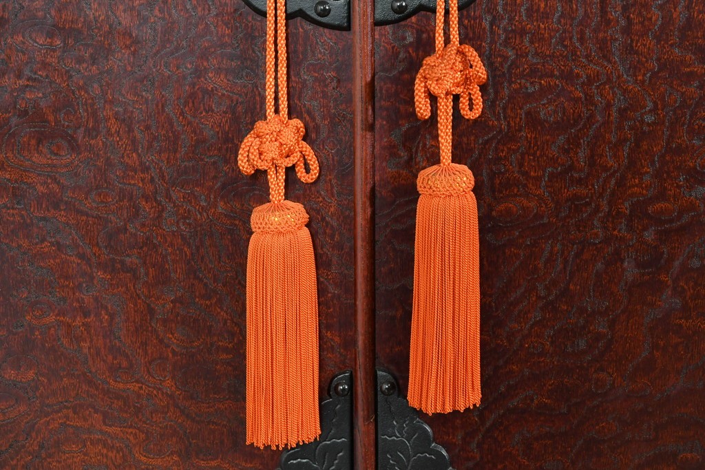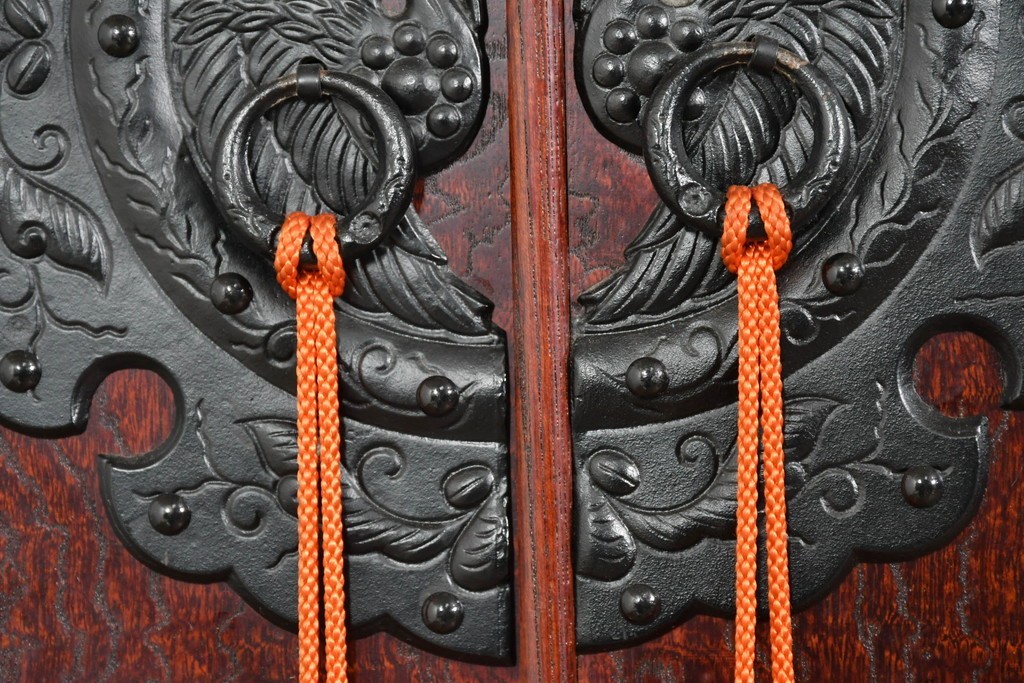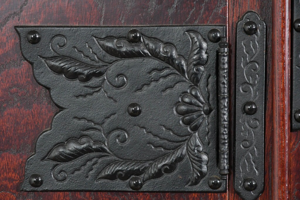 深みのある木肌に、細やかな文様を施した重厚な金具がよく映え、和家具ならではの落ち着いた品格を感じさせる佇まいが魅力です。収納としての使い勝手に優れつつ、空間に置くだけで雰囲気を整えてくれる存在感があり、和の住まいにも現代のインテリアにも自然に調和します。