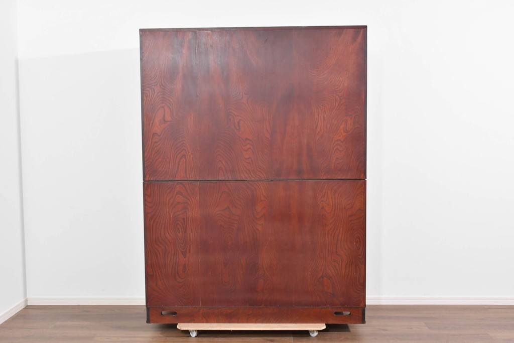 上段には和服の整理に便利な衣装盆が並び、下段には幅広の引き出しが配されています。内部に設けられた棚や小引き出しなど、用途に合わせて使い分けられるつくりが特徴で、衣類や小物をきれいに収められます。