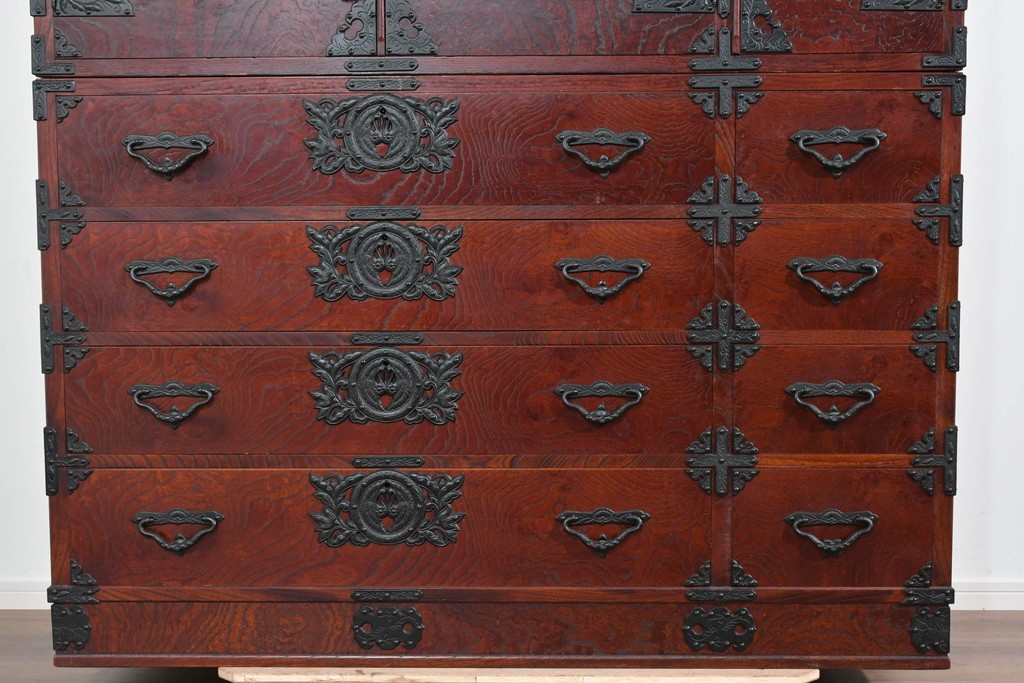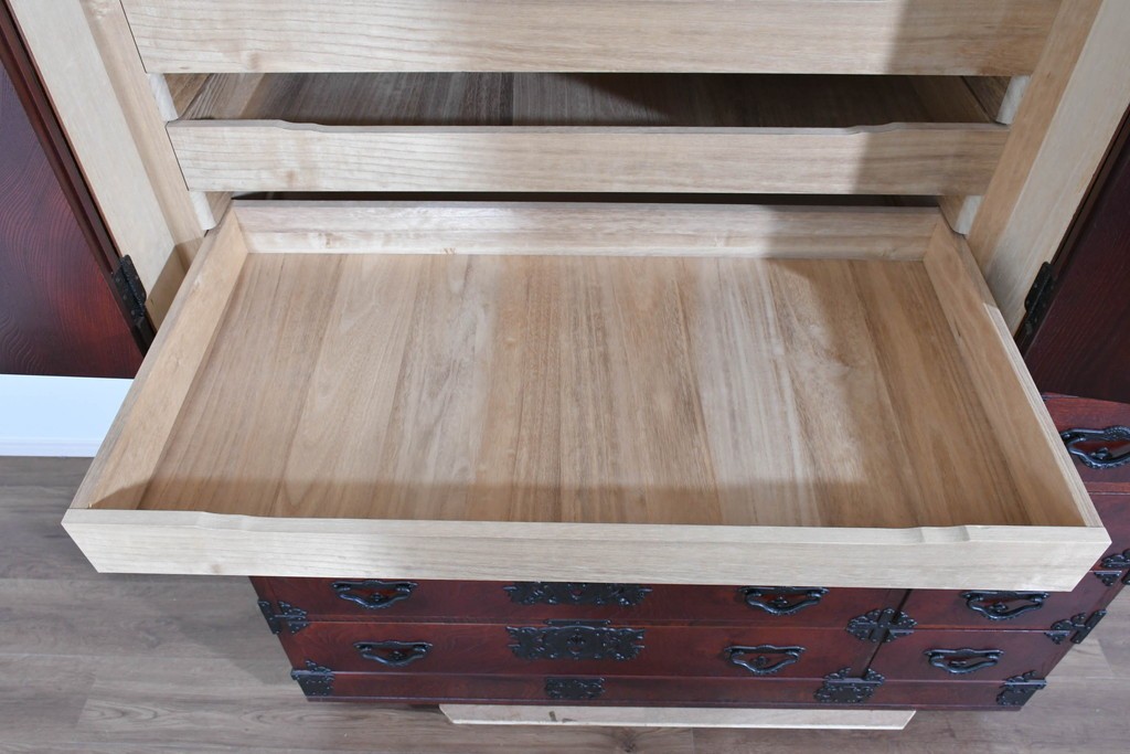 岩谷堂箪笥ならではの、木目の美しい木地と存在感のある金具が魅力の一台です。手仕事による意匠を要所に取り入れつつ、現代の住まいでも使いやすい収納力を備えており、上質な和の空気感を自然に添えてくれます。