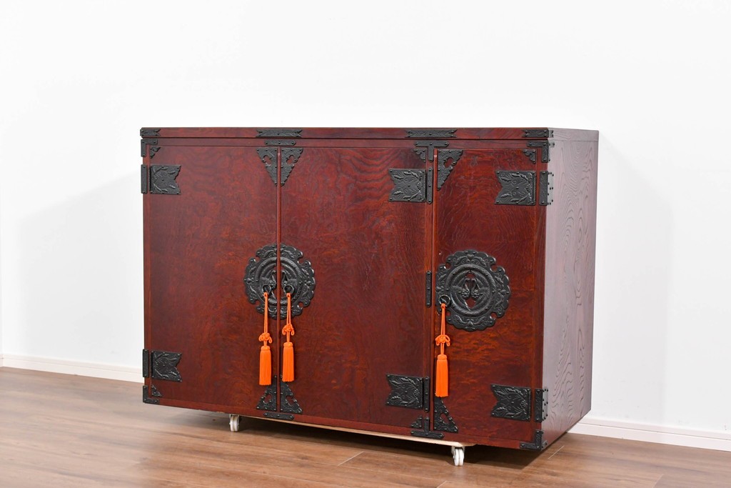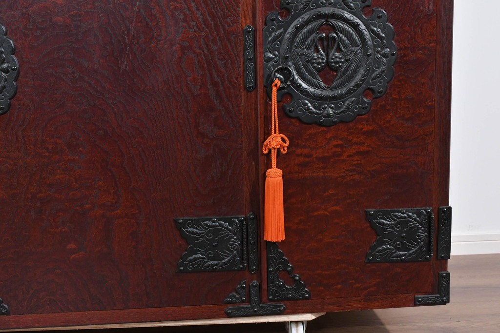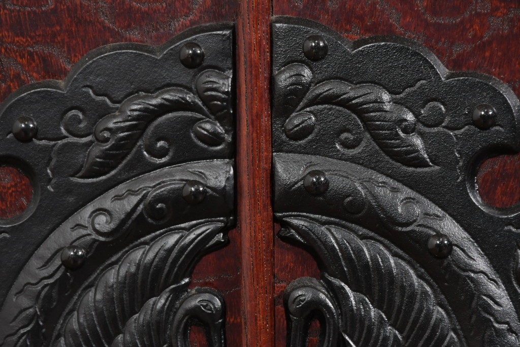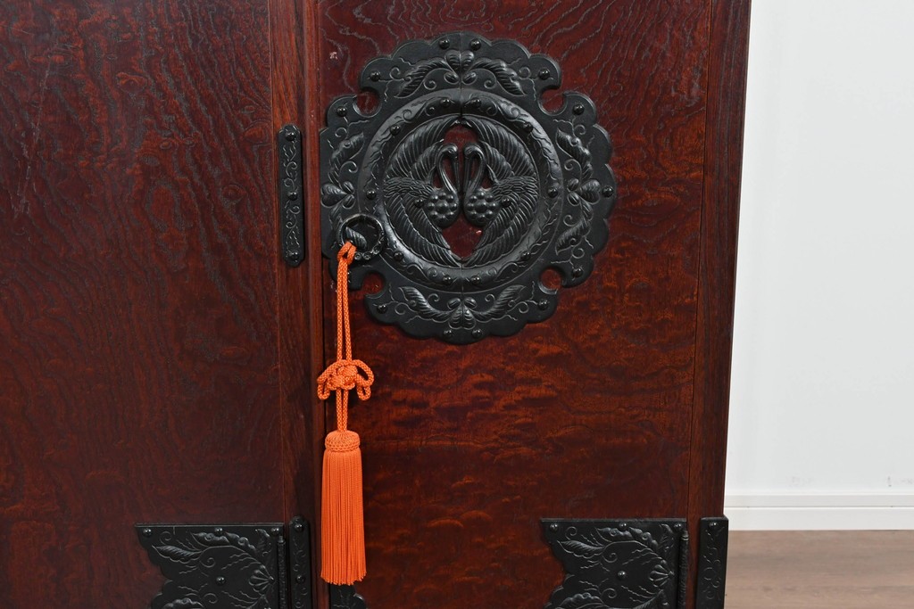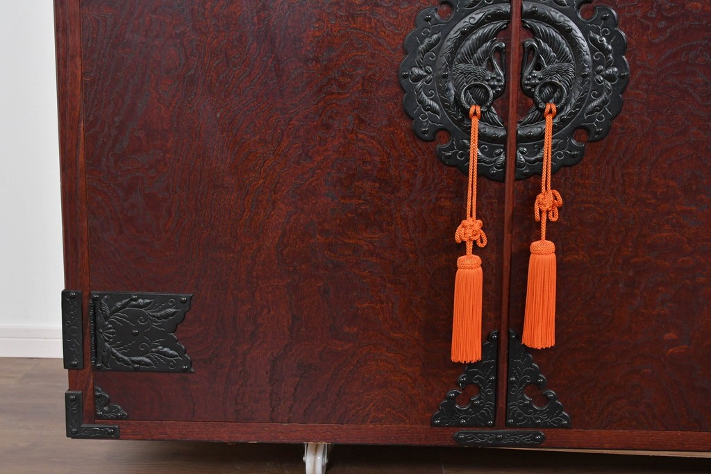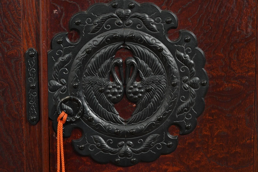 前面には重厚感のある飾金具があしらわれ、伝統的な意匠が家具全体の品格を高めています。
