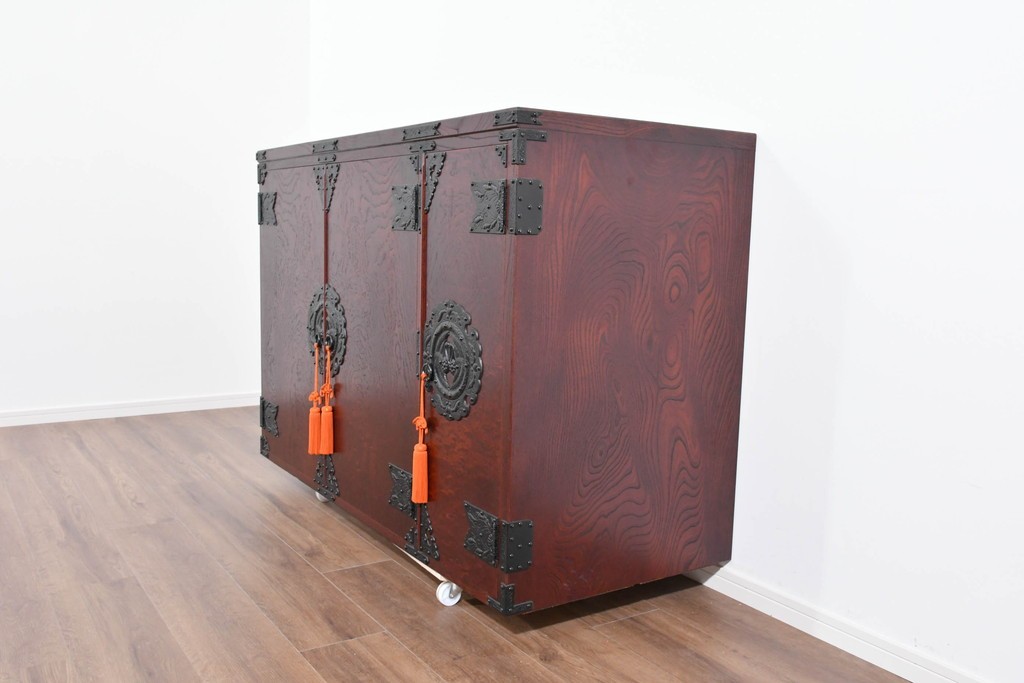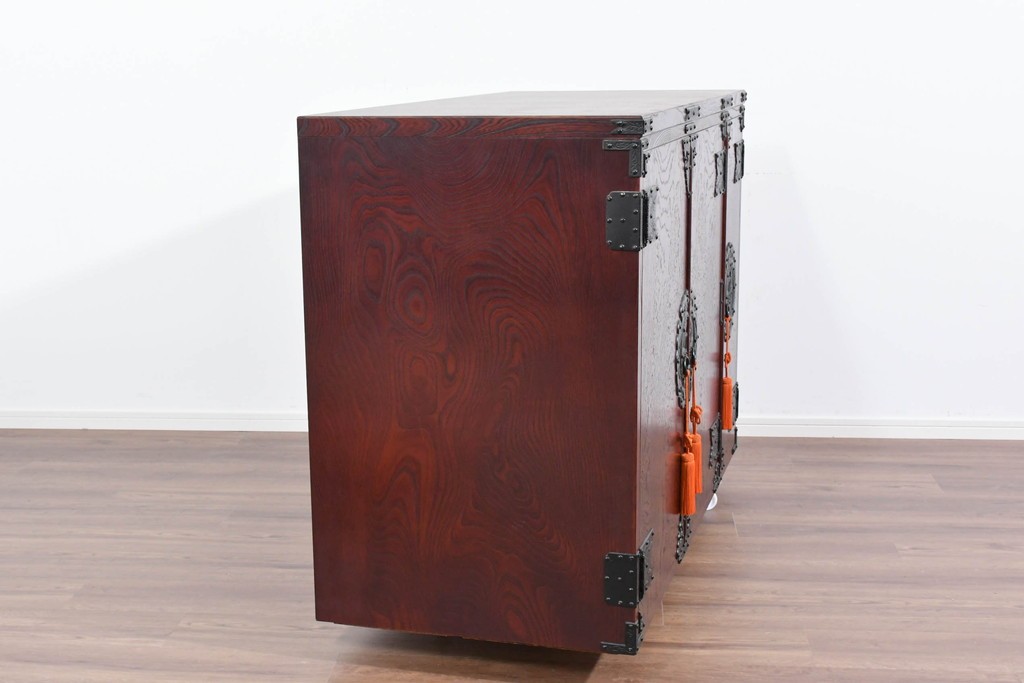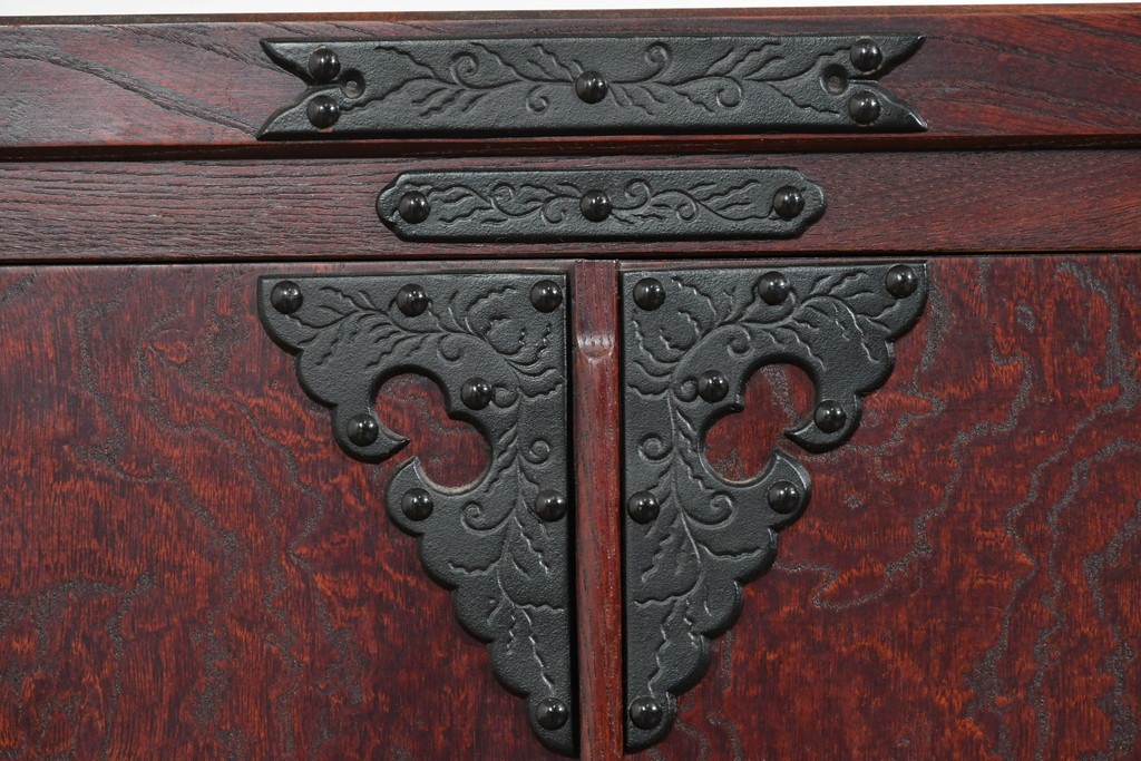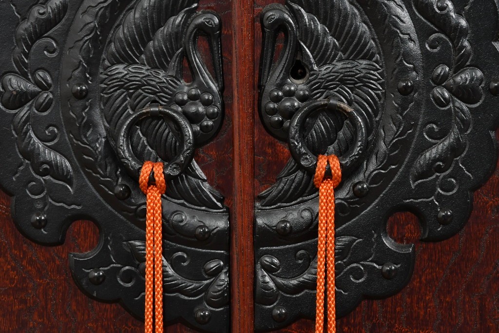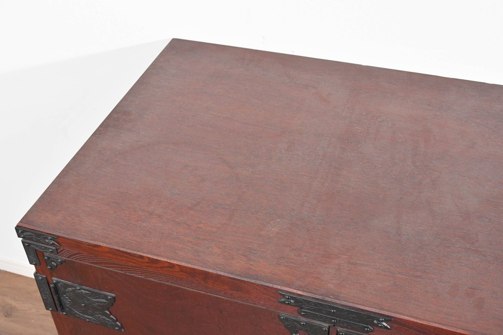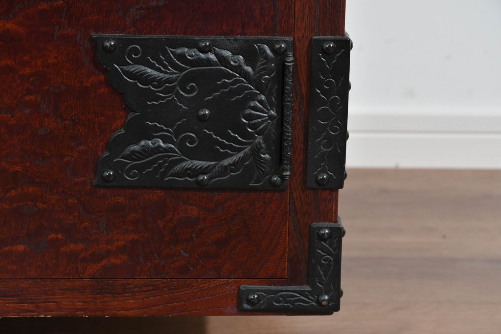 前面には重厚感のある飾金具があしらわれ、伝統的な意匠が家具全体の品格を高めています。