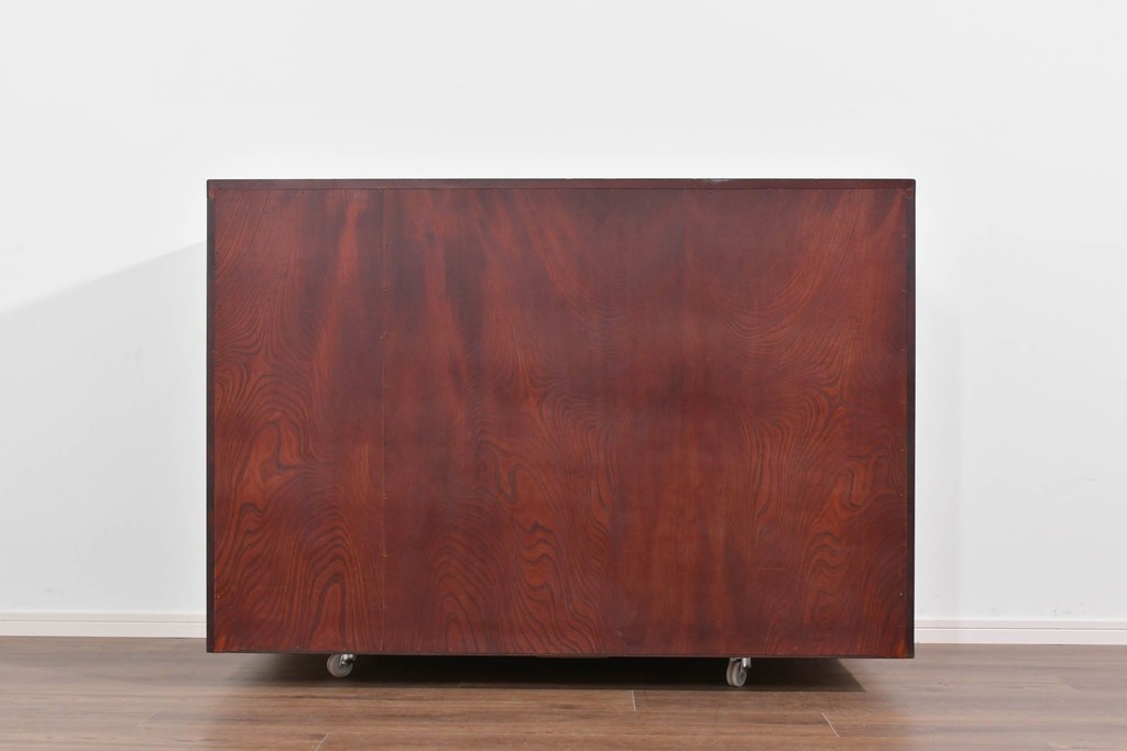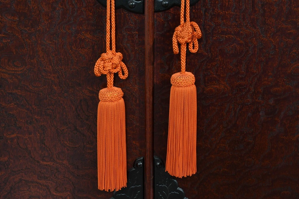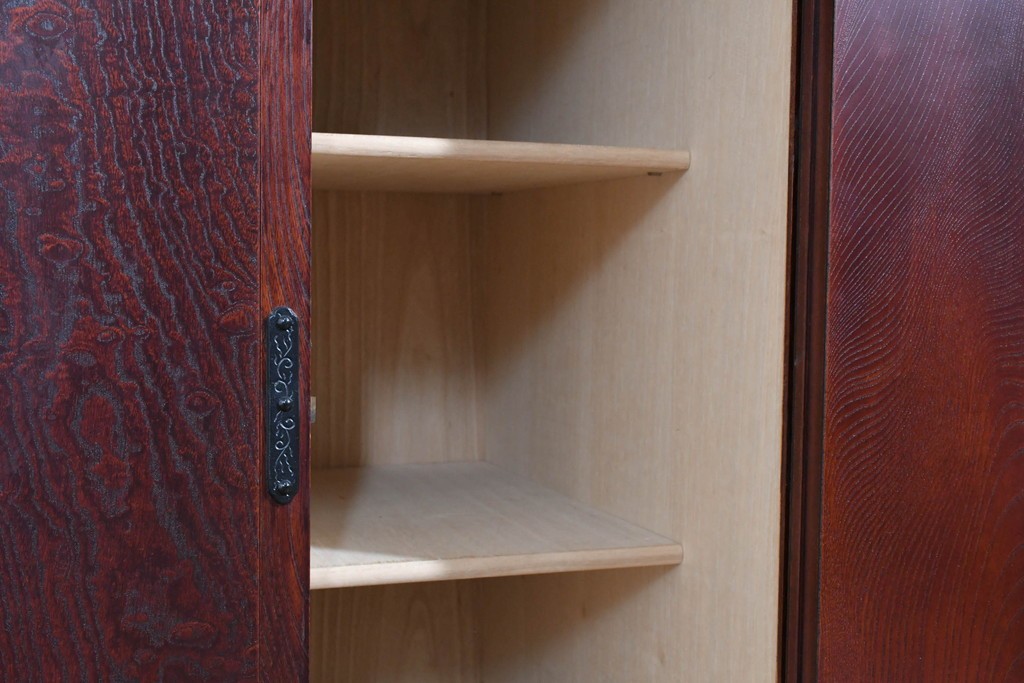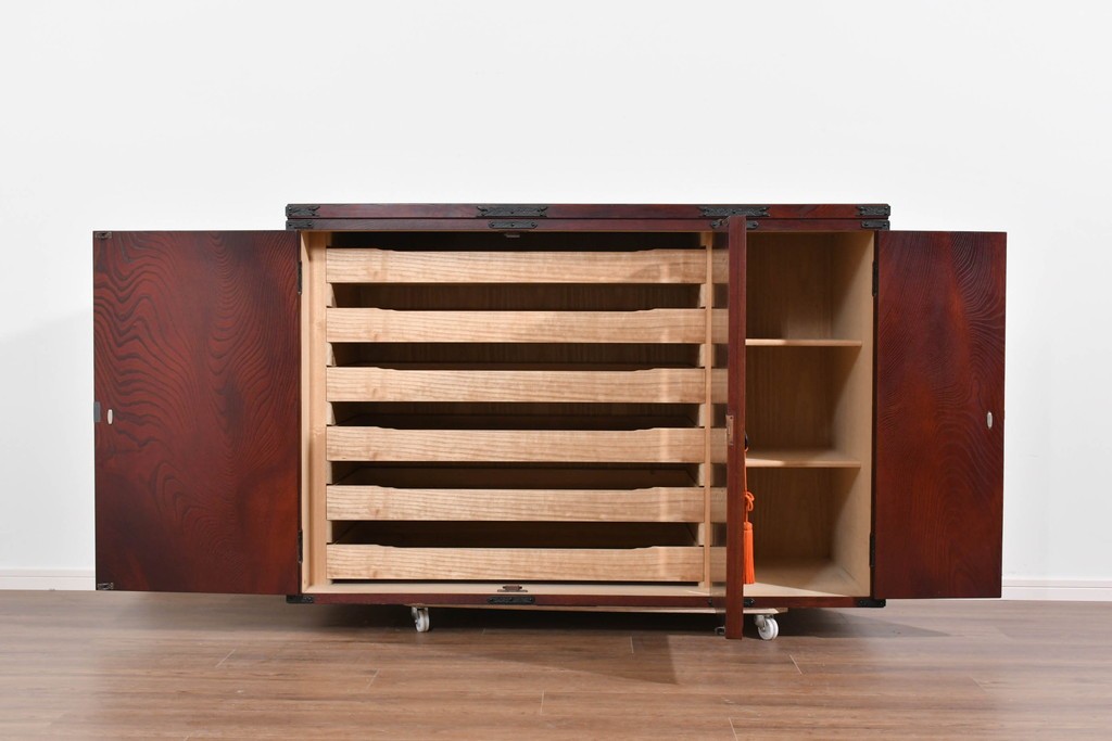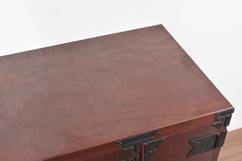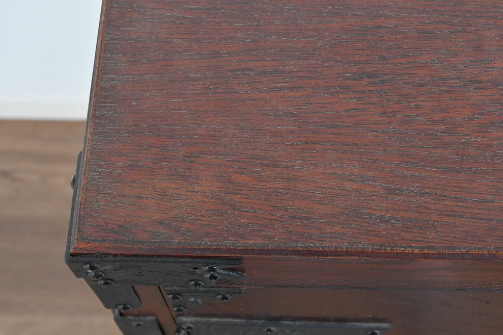 前面には重厚感のある飾金具があしらわれ、伝統的な意匠が家具全体の品格を高めています。