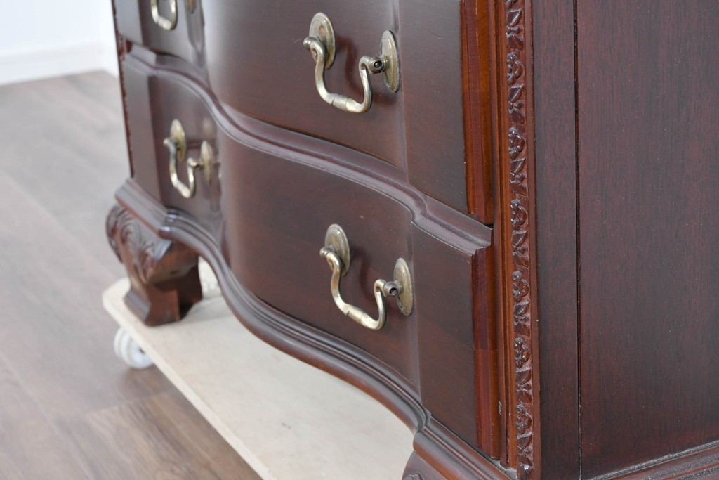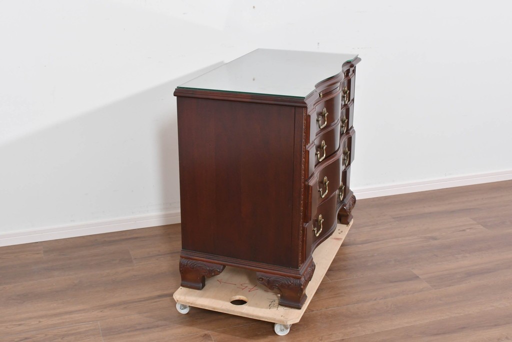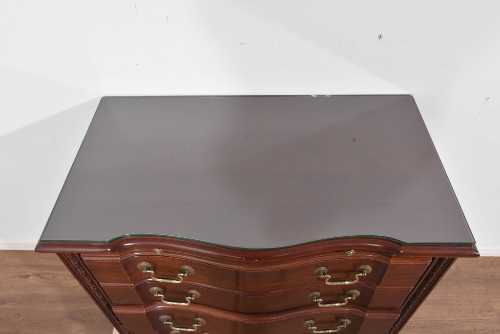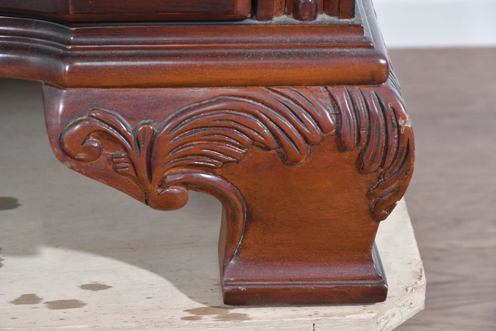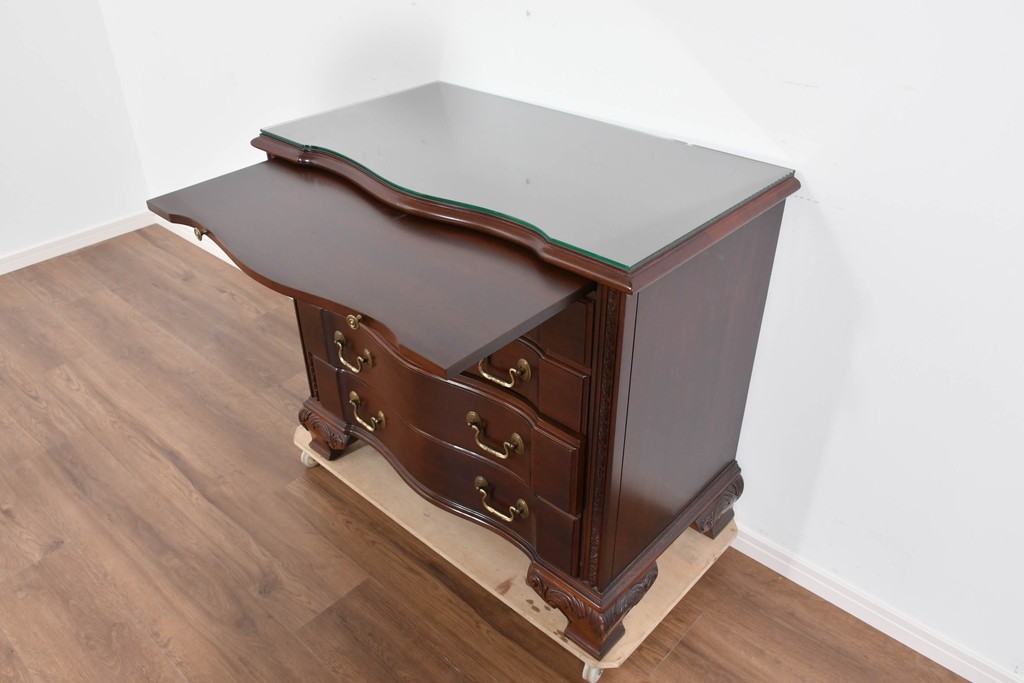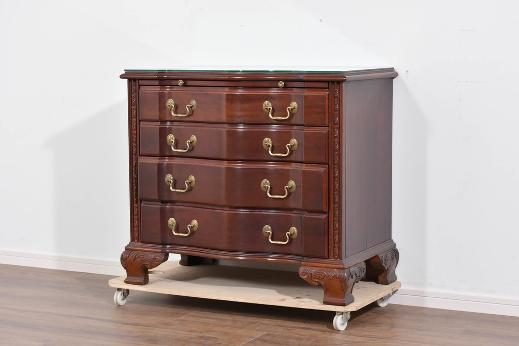 優美な曲線を描く前板と、脚部や側面に施された彫刻がクラシックな雰囲気を演出します。