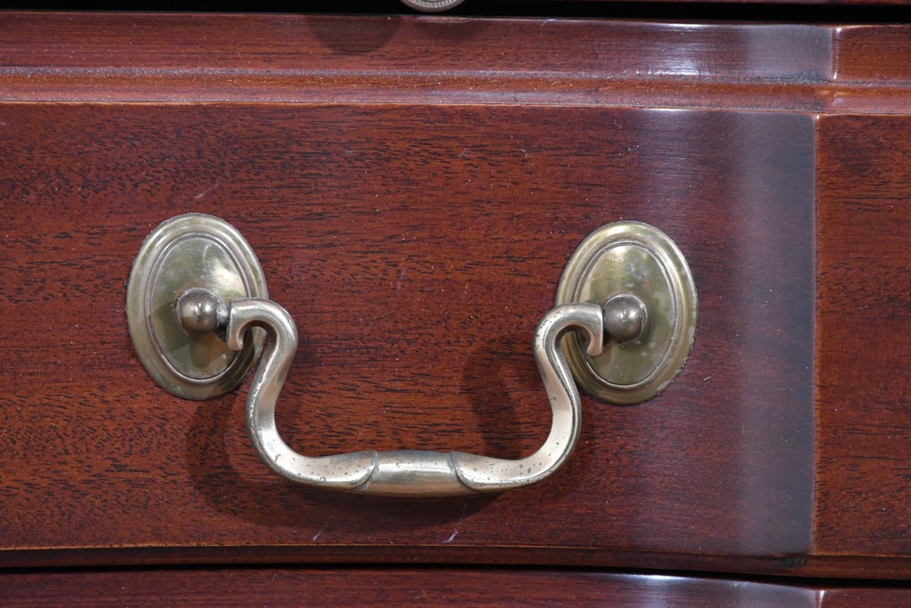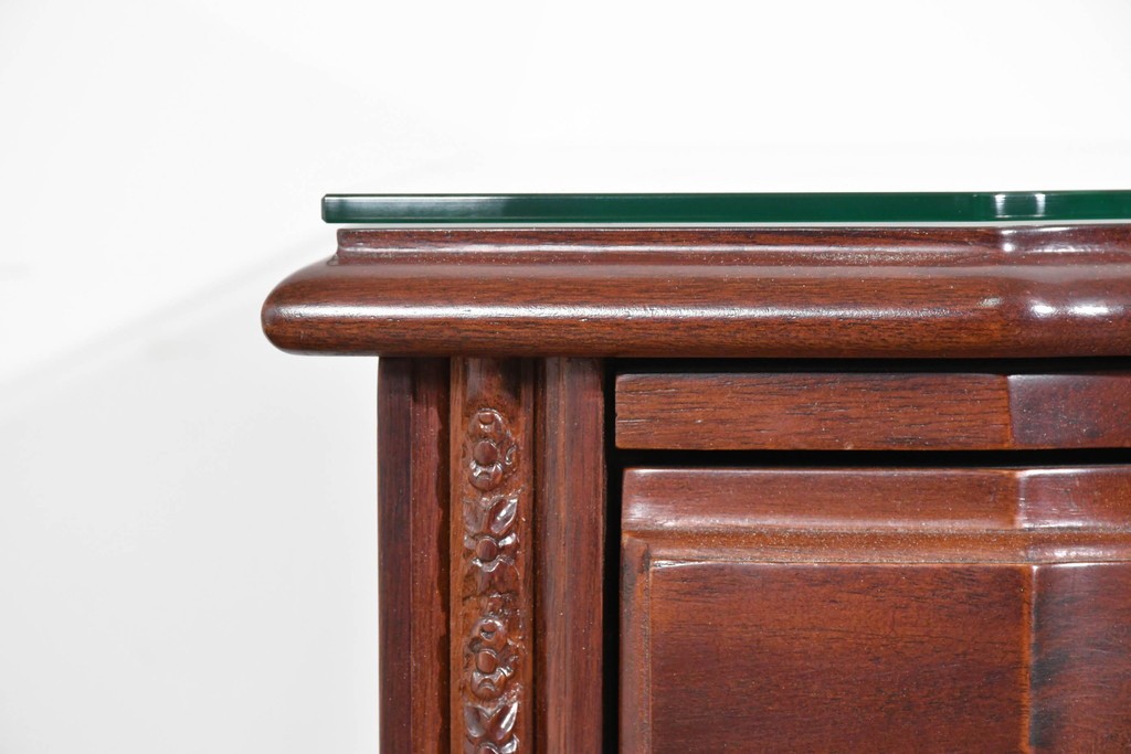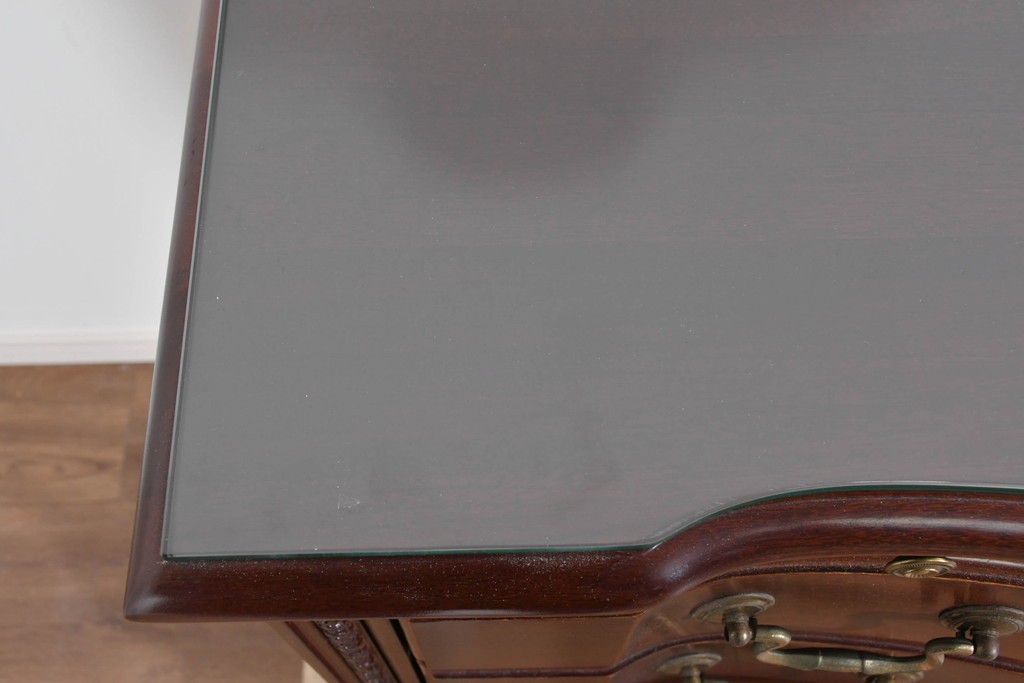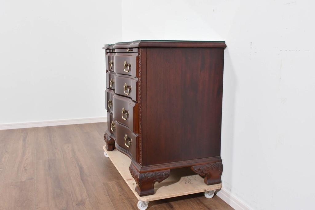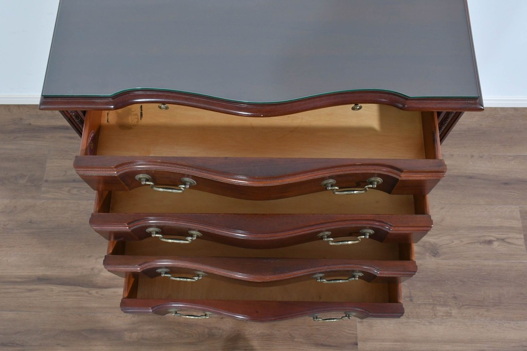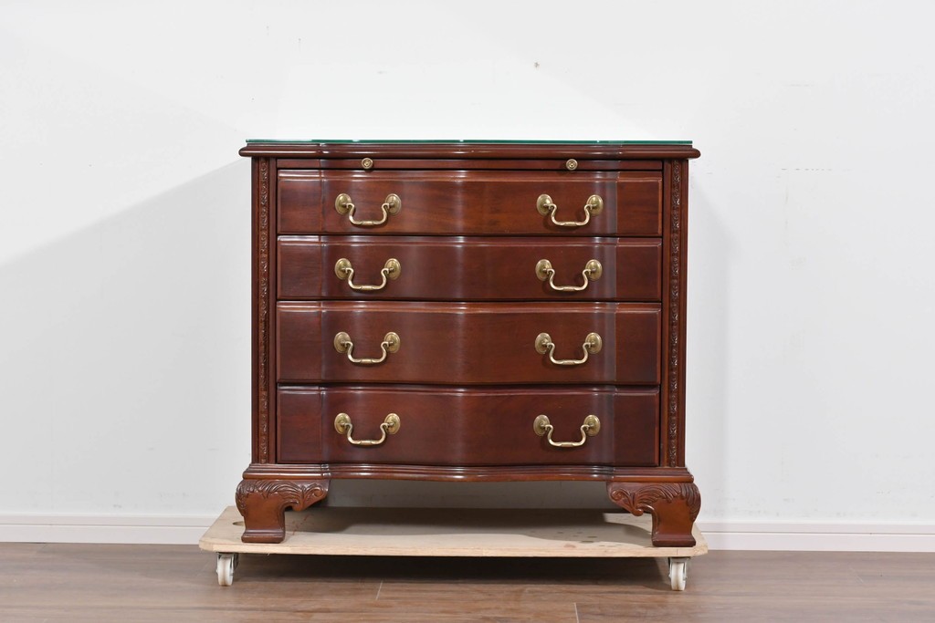 優美な曲線を描く前板と、脚部や側面に施された彫刻がクラシックな雰囲気を演出します。