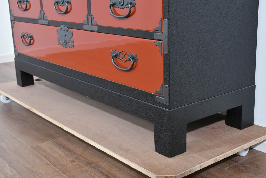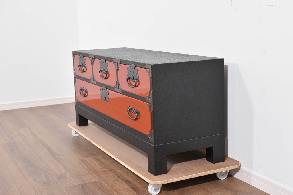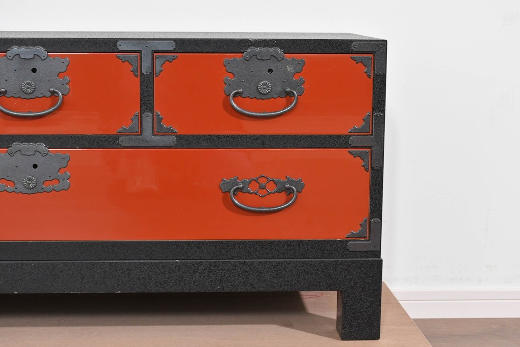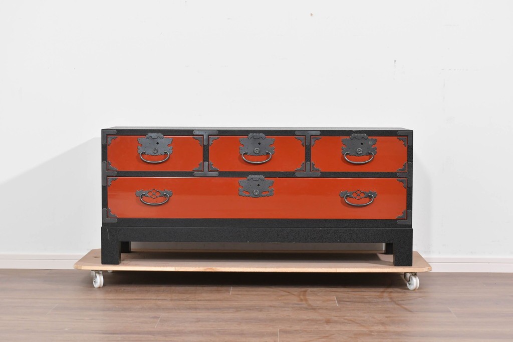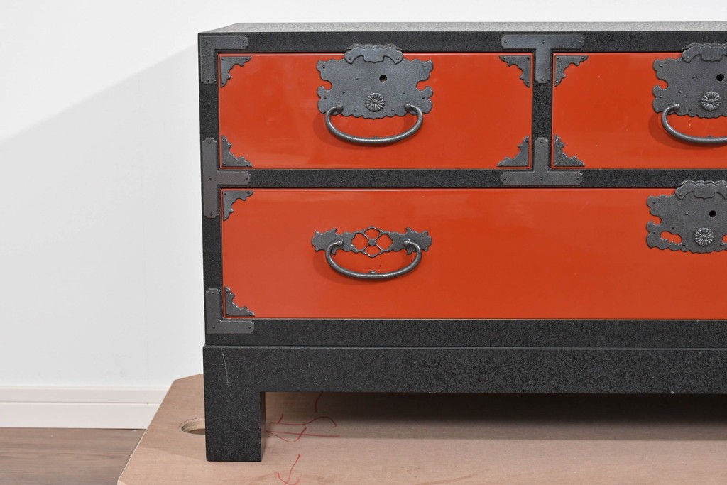 前板に朱塗りを施し、石目乾漆仕上げの質感が際立つ加茂箪笥のローチェストです。