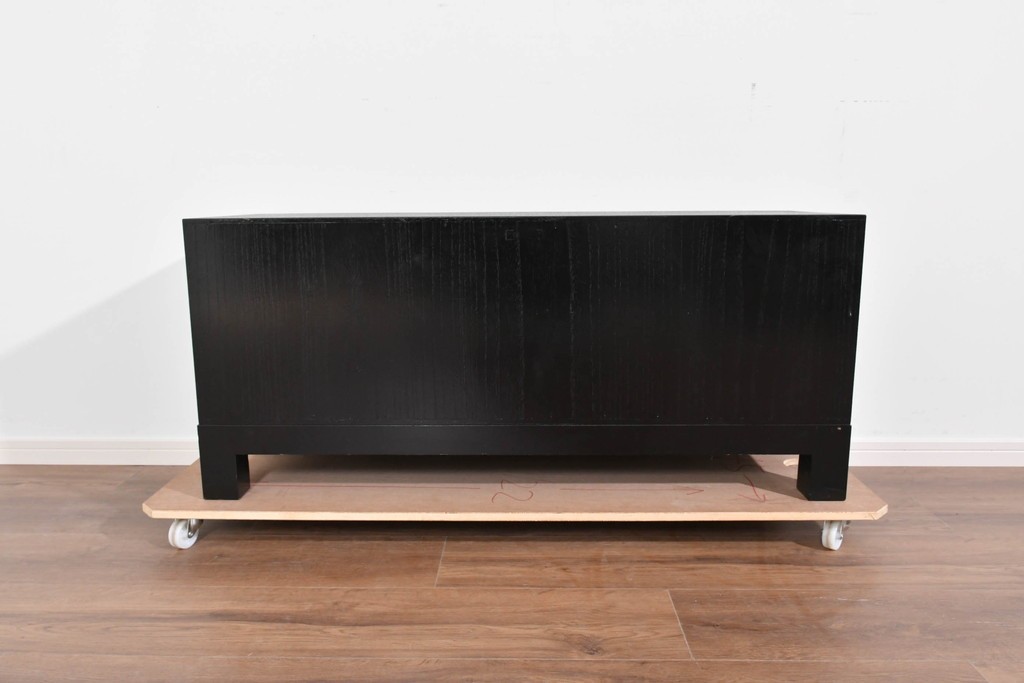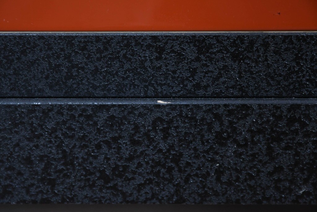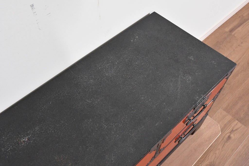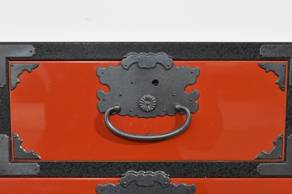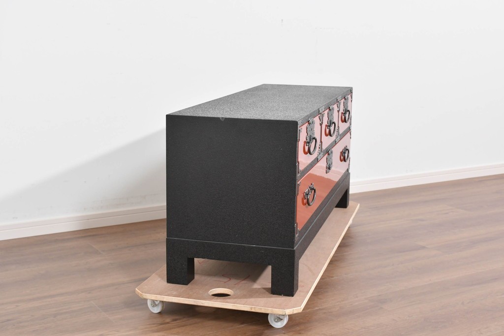 前板に朱塗りを施し、石目乾漆仕上げの質感が際立つ加茂箪笥のローチェストです。