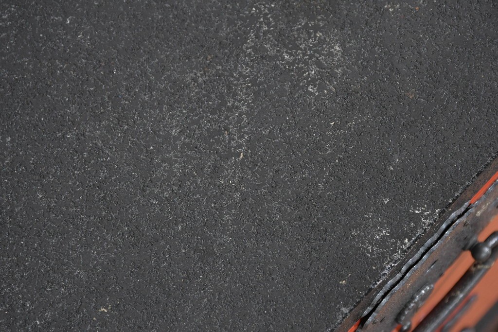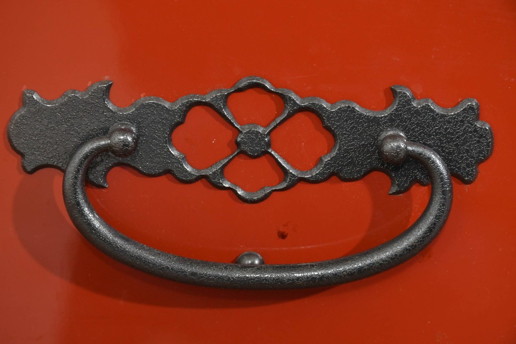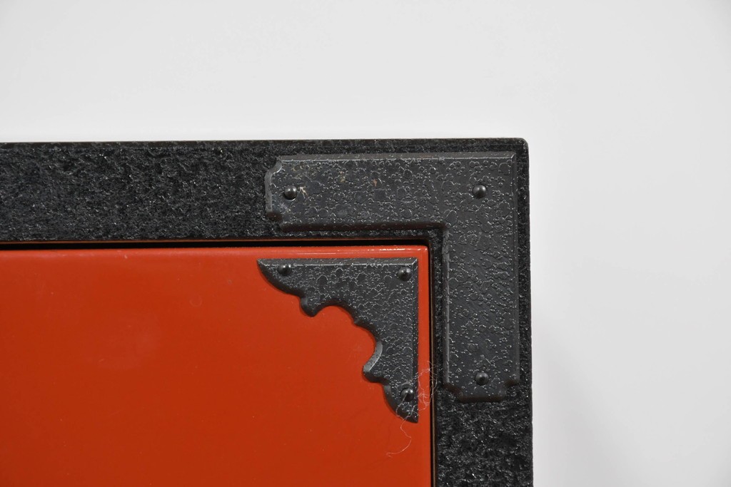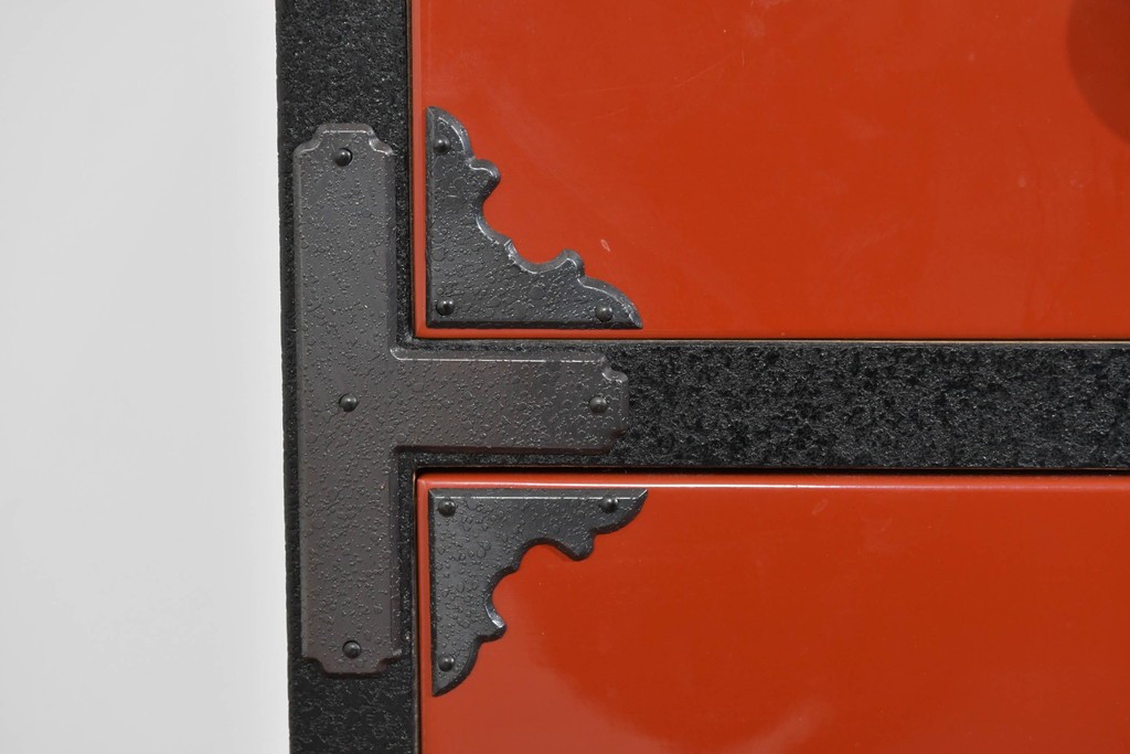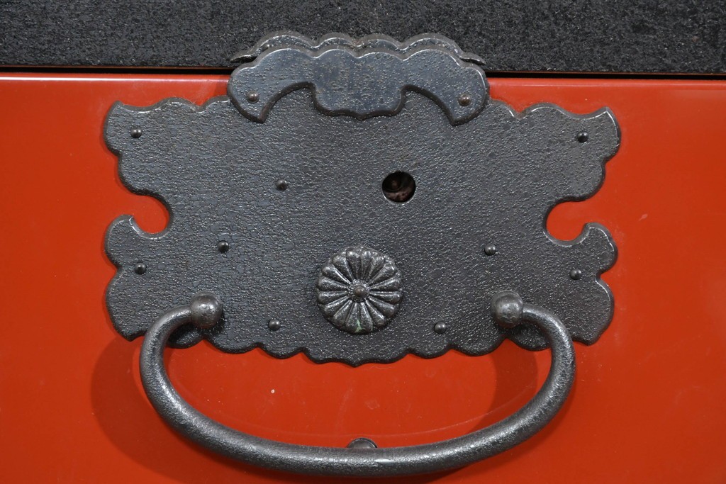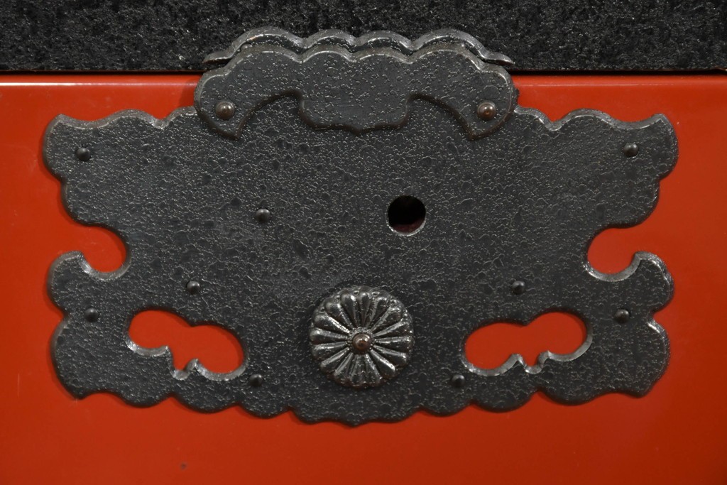 重厚な鉄金具と鮮やかな朱色の対比が美しく、存在感を引き立てています。