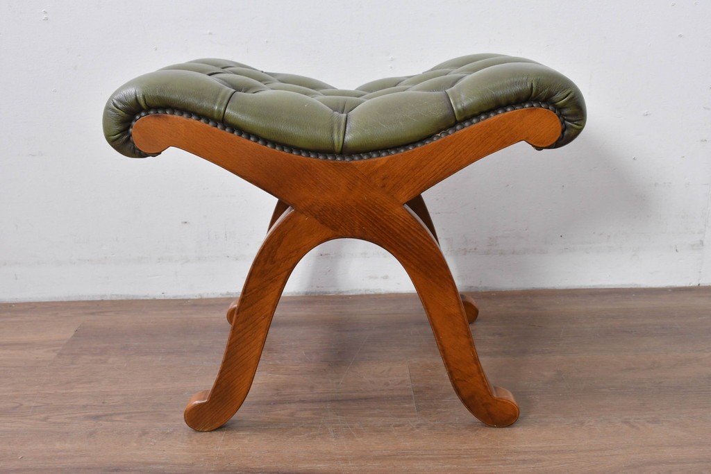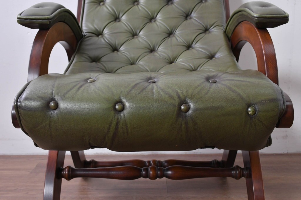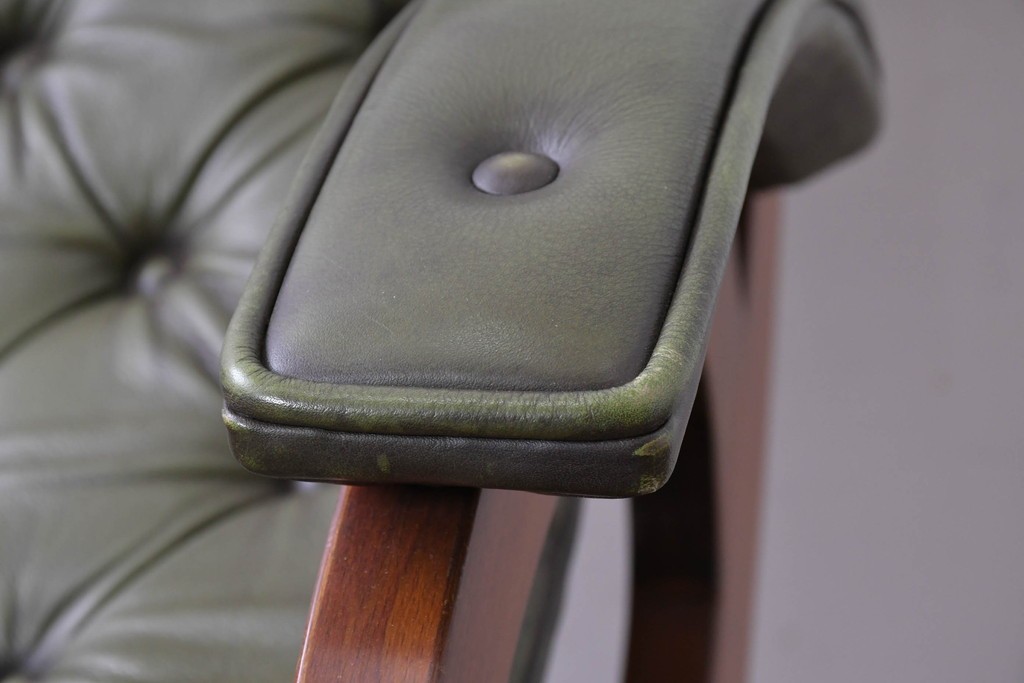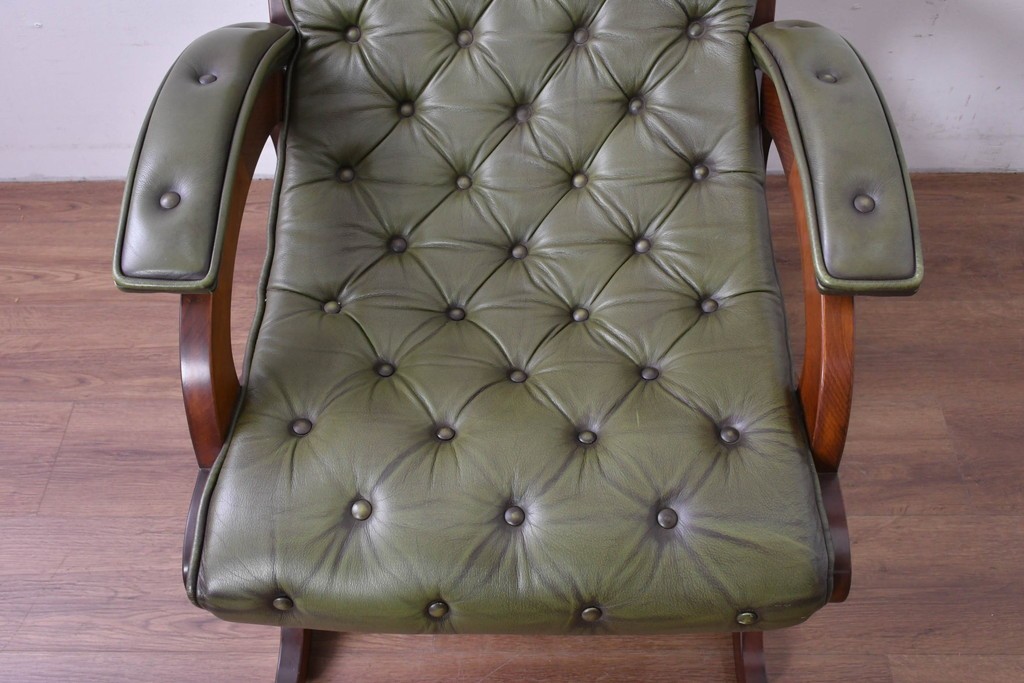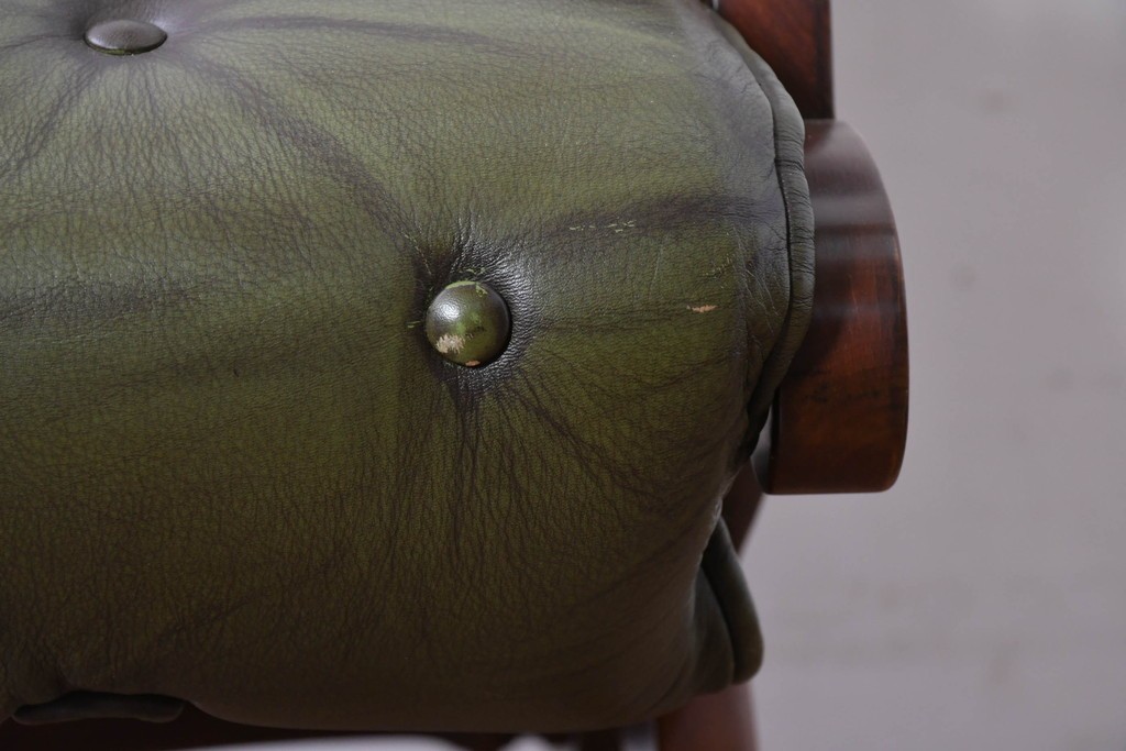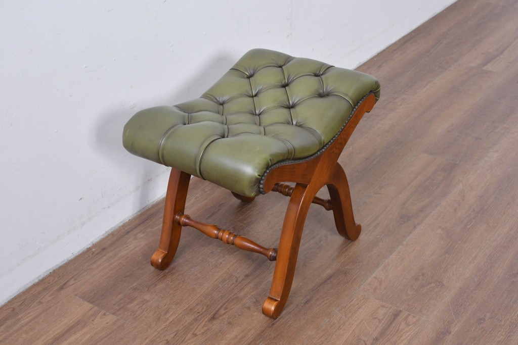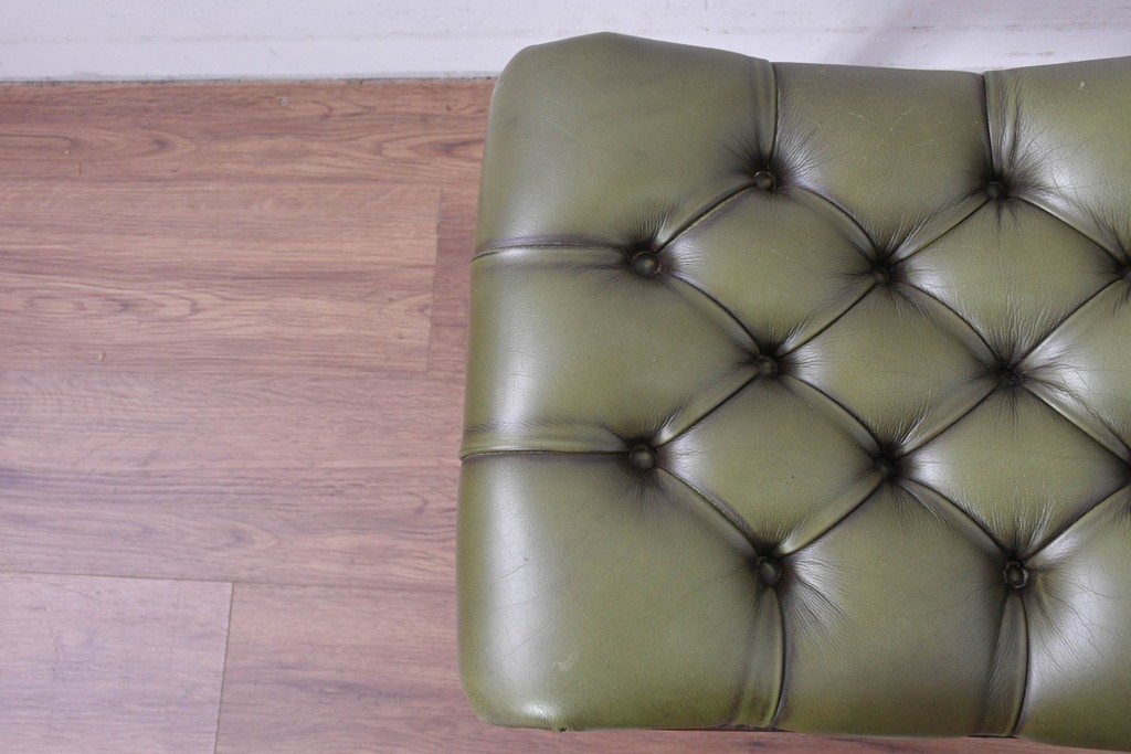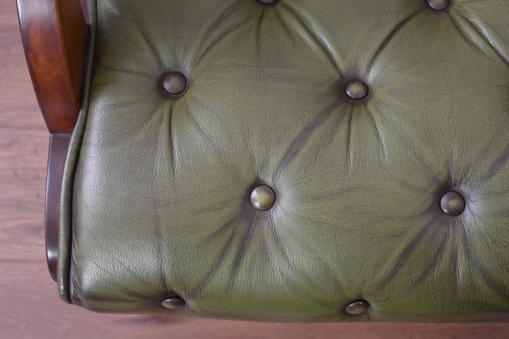 深みのあるグリーンレザーには丁寧なボタン留めが施され、クラシックな上品さを感じさせます。