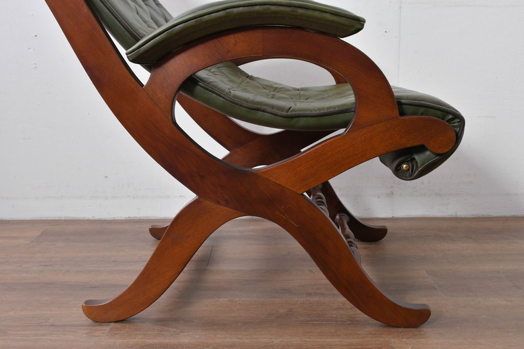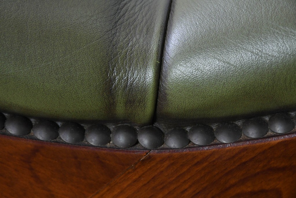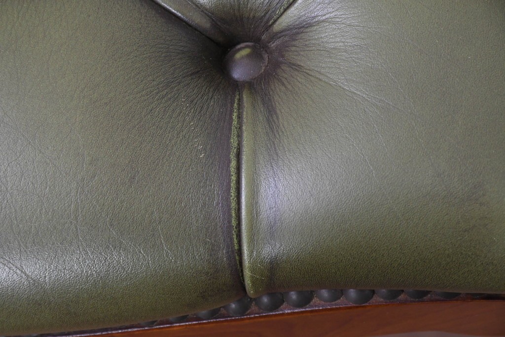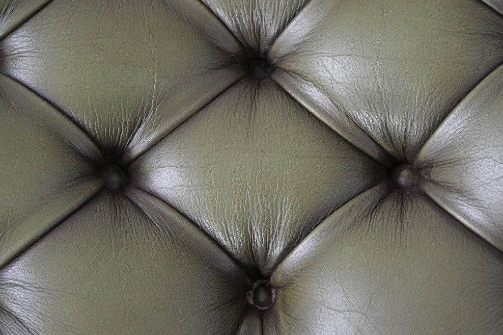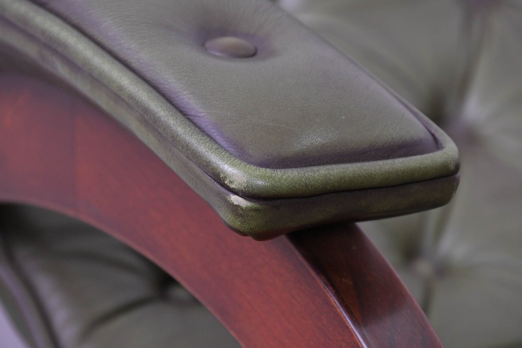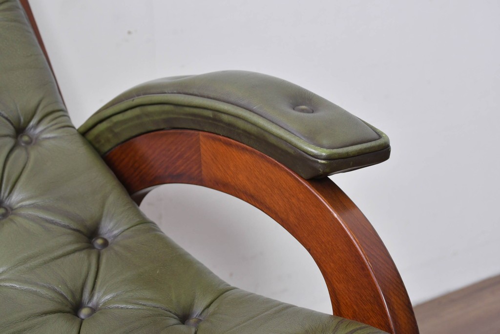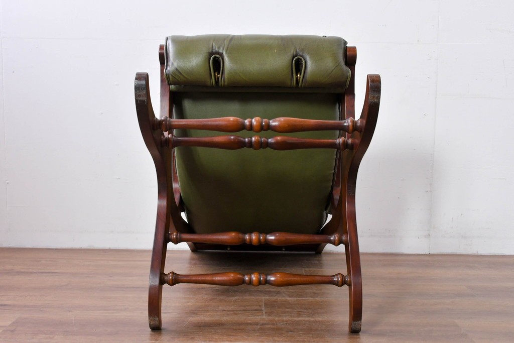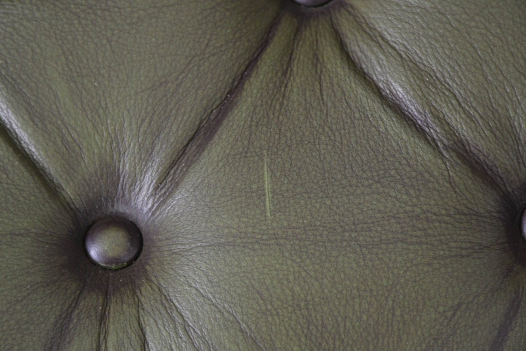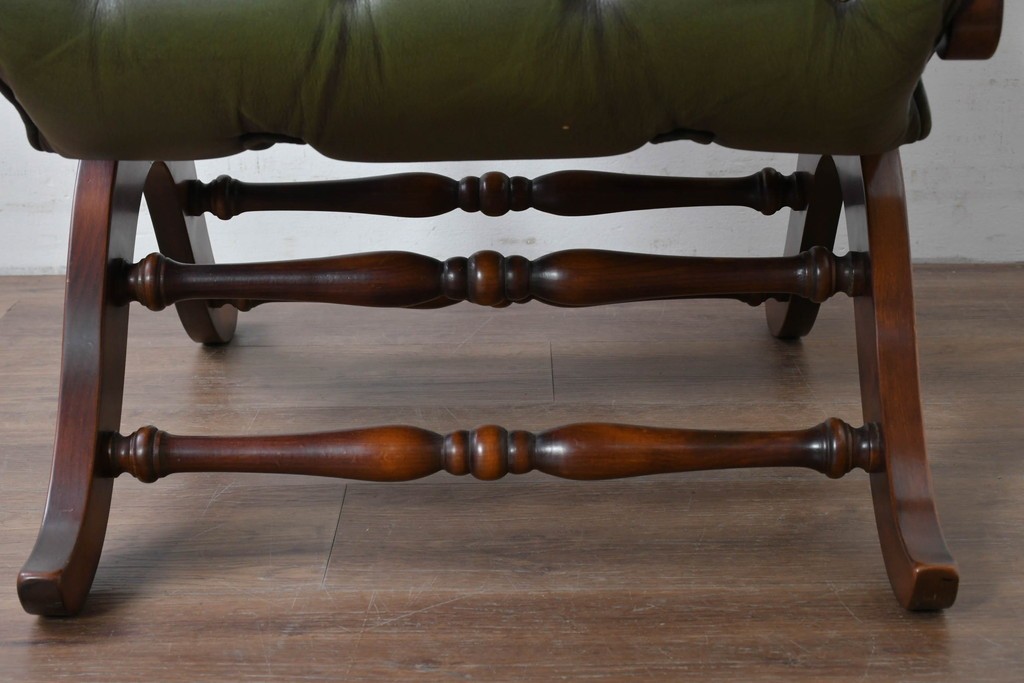 深みのあるグリーンレザーには丁寧なボタン留めが施され、クラシックな上品さを感じさせます。