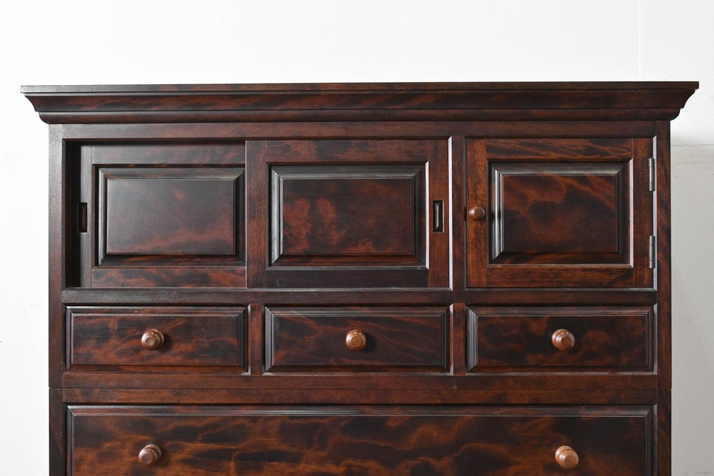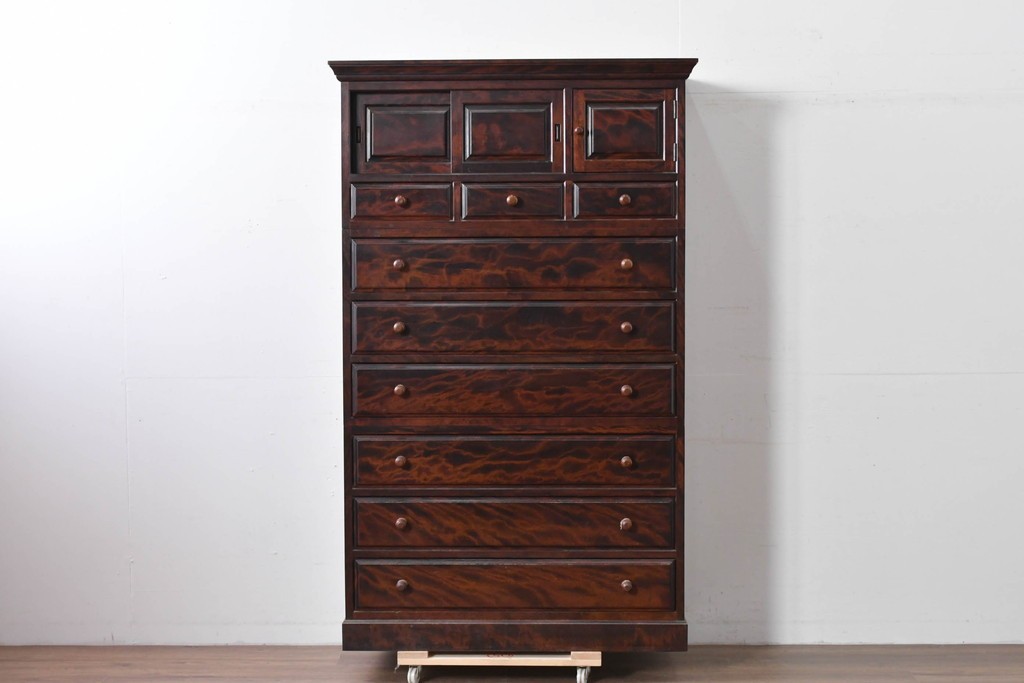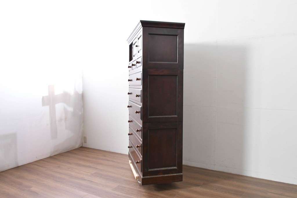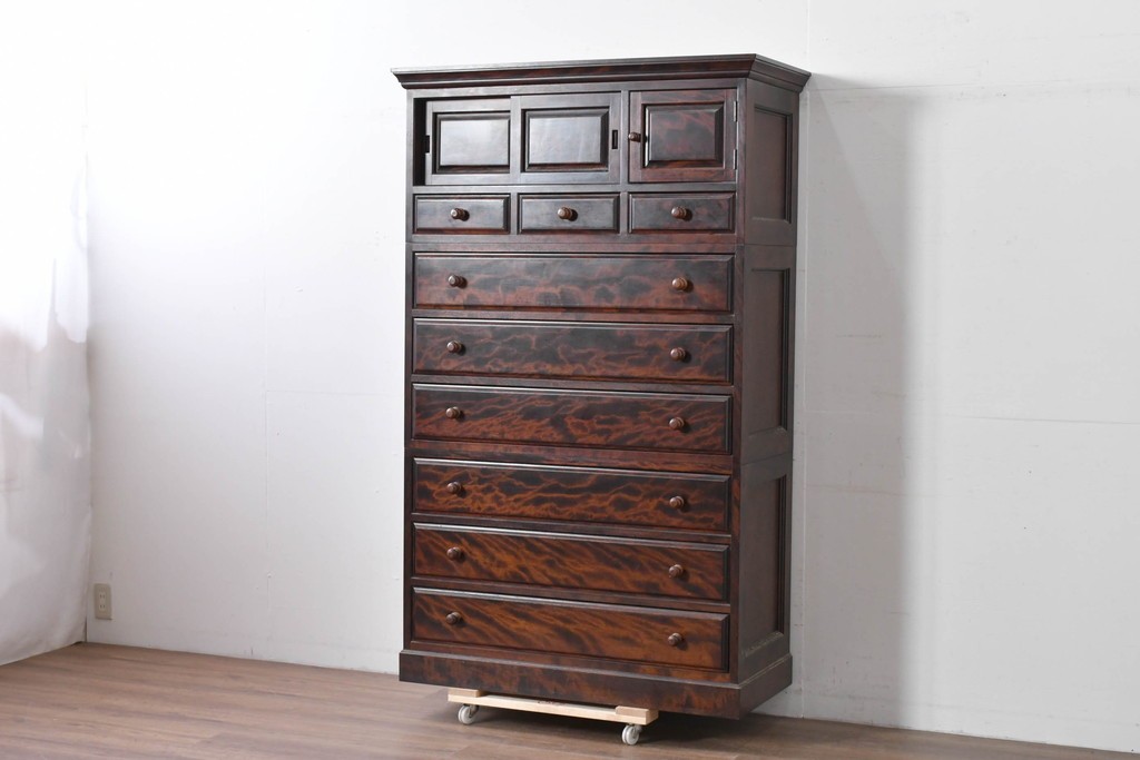 長い年月を通して愛される松本民芸家具の代表的なA型和タンスです。落ち着いた濃色仕上げに端正な框組みの扉や引き出しが重なり、品のある佇まいを演出しています。