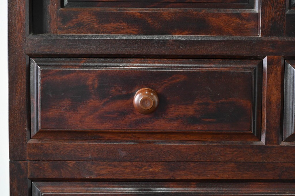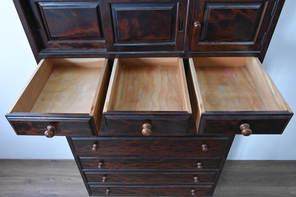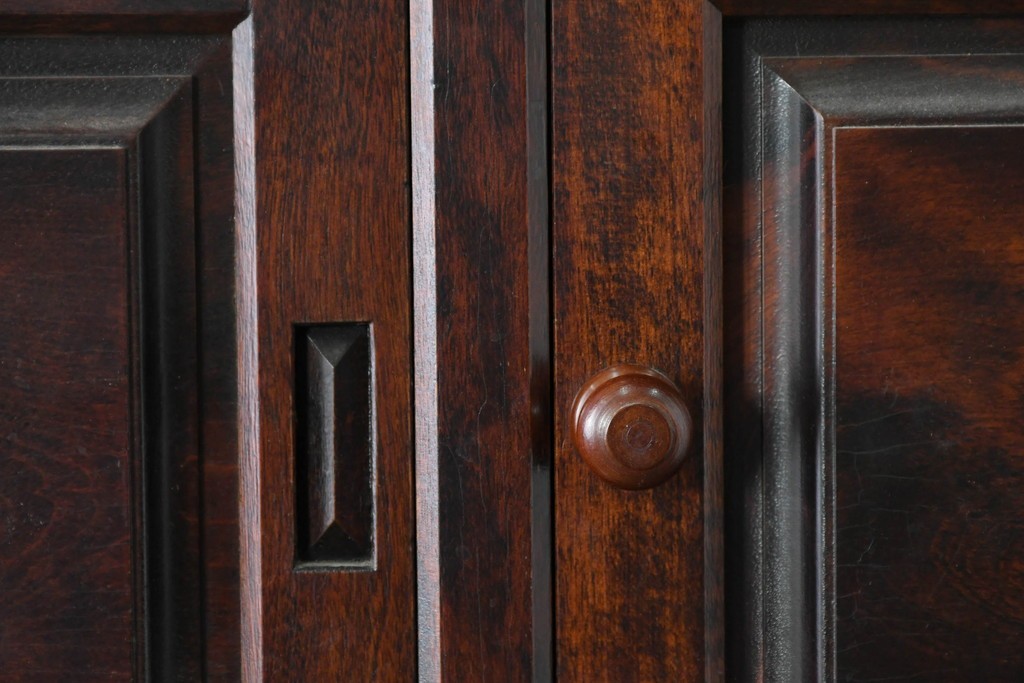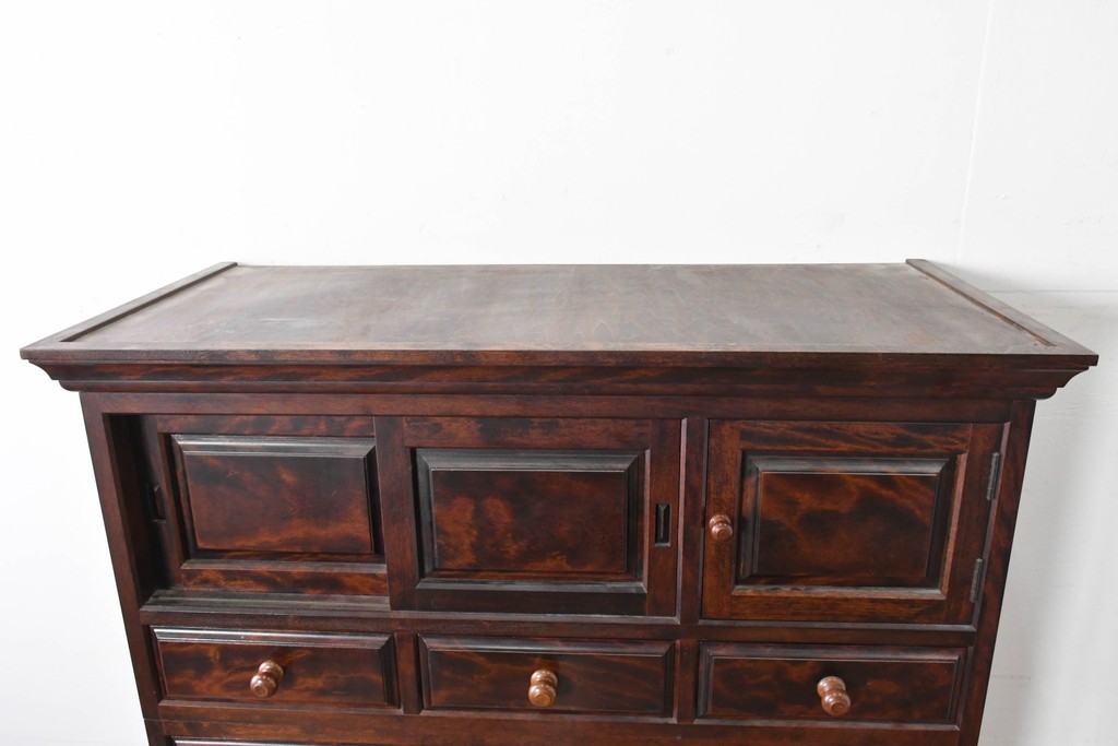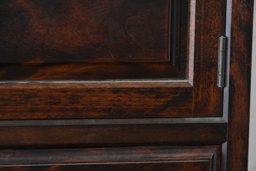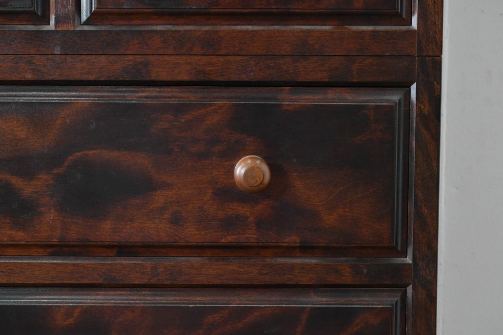深みのある色調の中に、柔らかく揺らぐ木目模様が浮かび上がり、素材の豊かな表情を楽しめます。均整の取れた面取りや、引き手の丸みを帯びたノブなど、職人の端正な手仕事が細部にまで息づくつくりです。