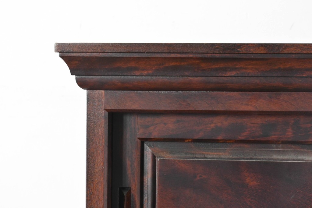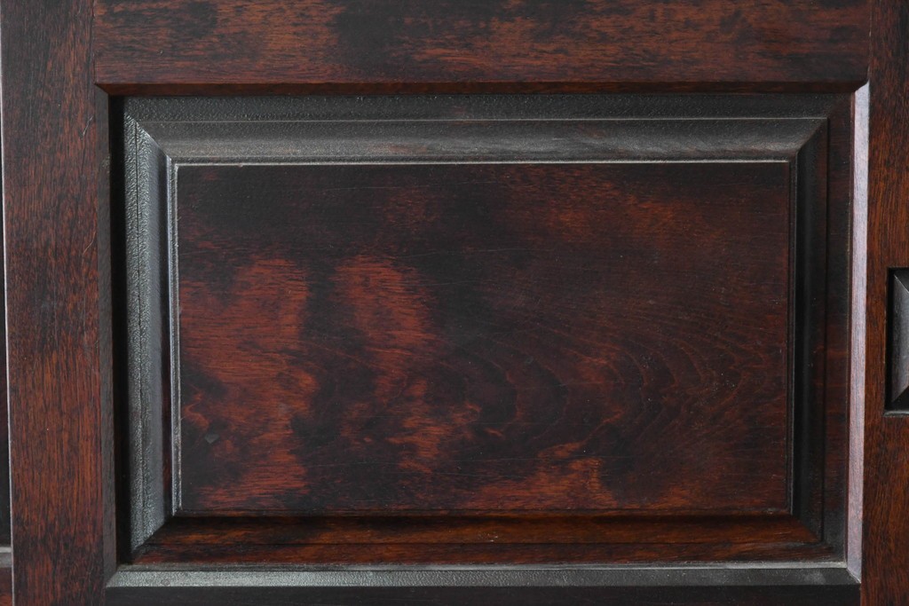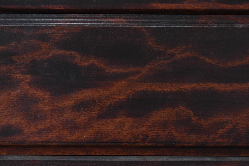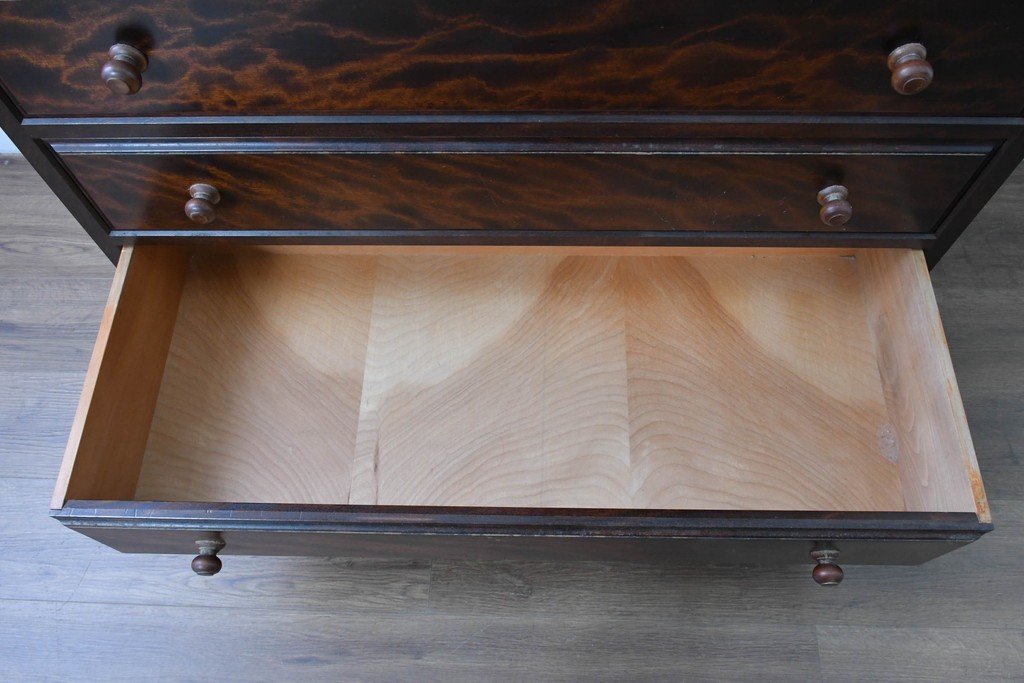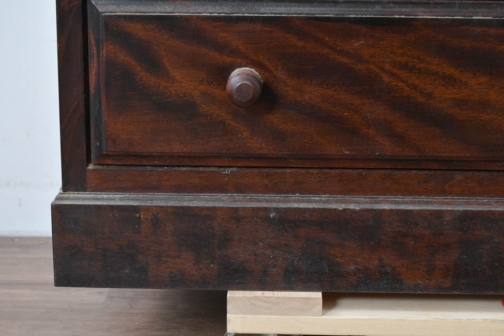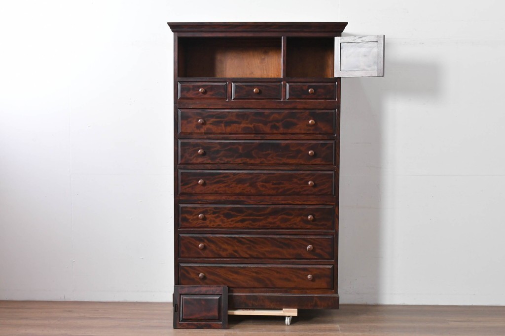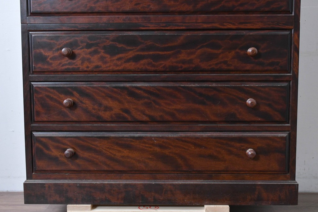 深みのある色調の中に、柔らかく揺らぐ木目模様が浮かび上がり、素材の豊かな表情を楽しめます。均整の取れた面取りや、引き手の丸みを帯びたノブなど、職人の端正な手仕事が細部にまで息づくつくりです。