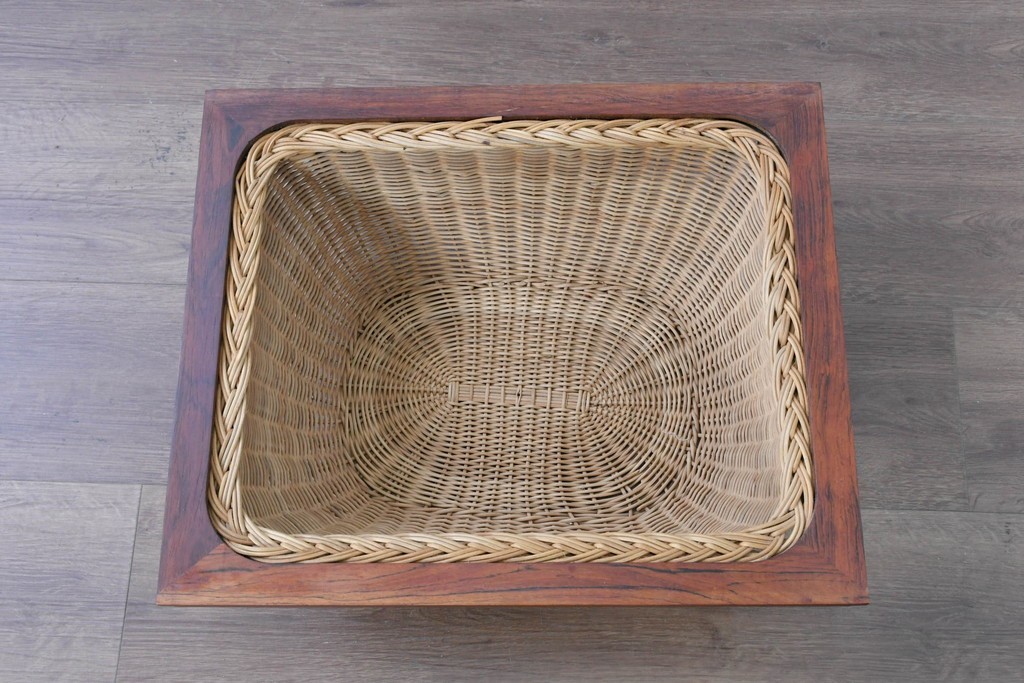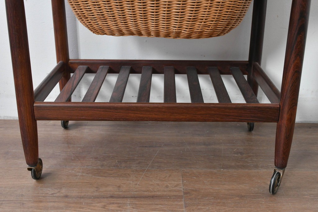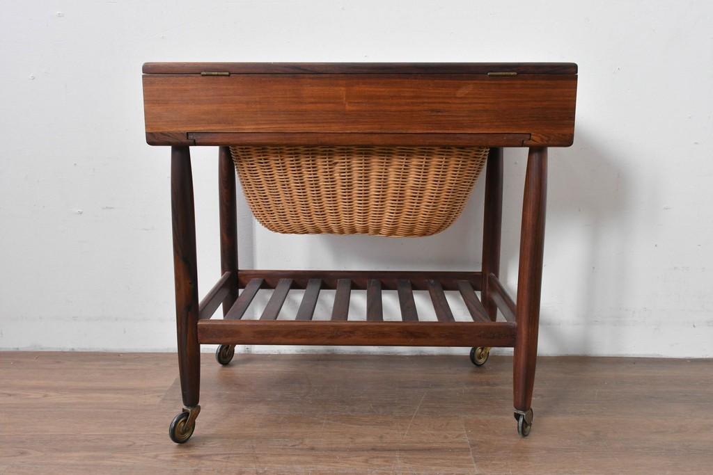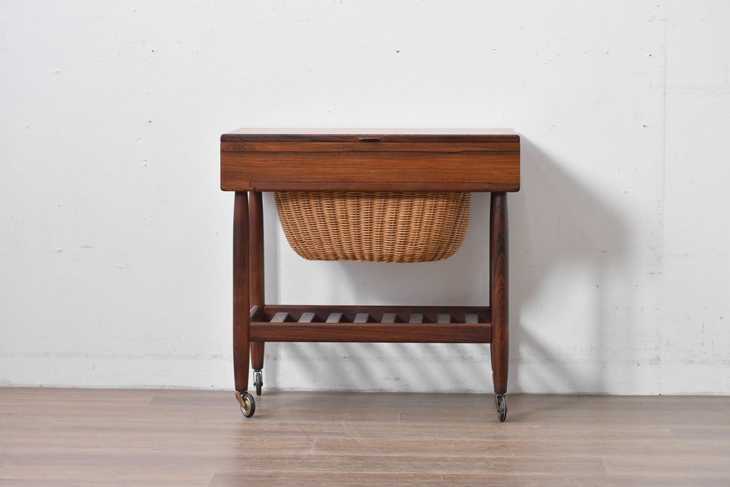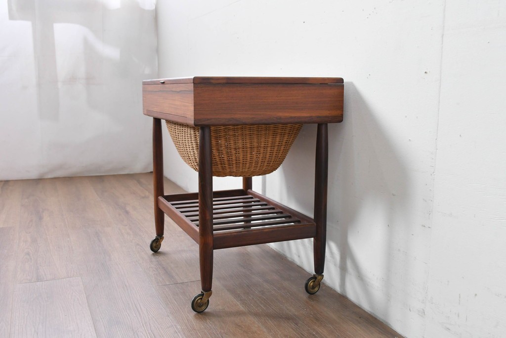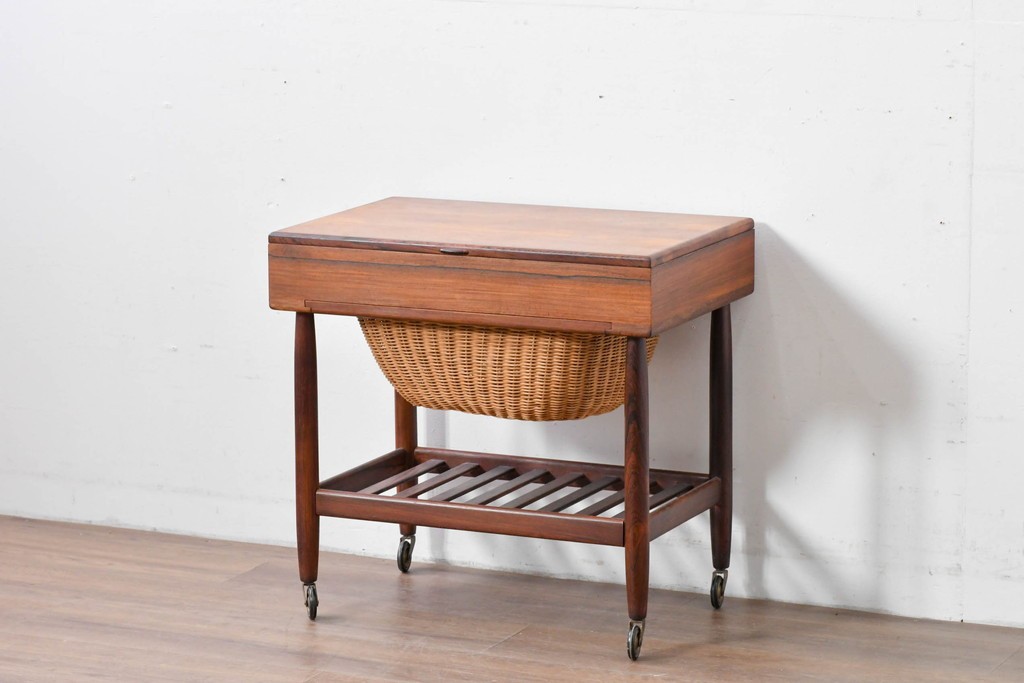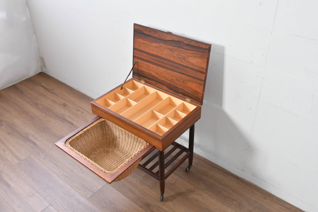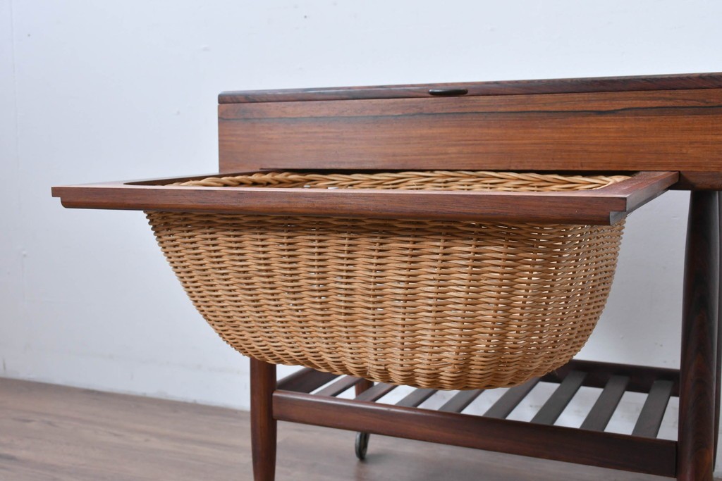 内部は細かな仕切りを設けた収納構造になっており、裁縫道具や小物類をすっきり整理できます。下段のラタンバスケットと合わせることで、多用途に使える利便性を備えています。素材の美しさや手仕事の温かみが調和し、実用家具でありながら造形としても楽しめる北欧ミッドセンチュリーデザインの魅力が詰まった一台です。