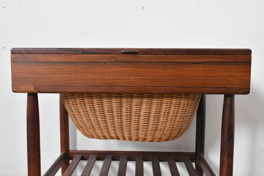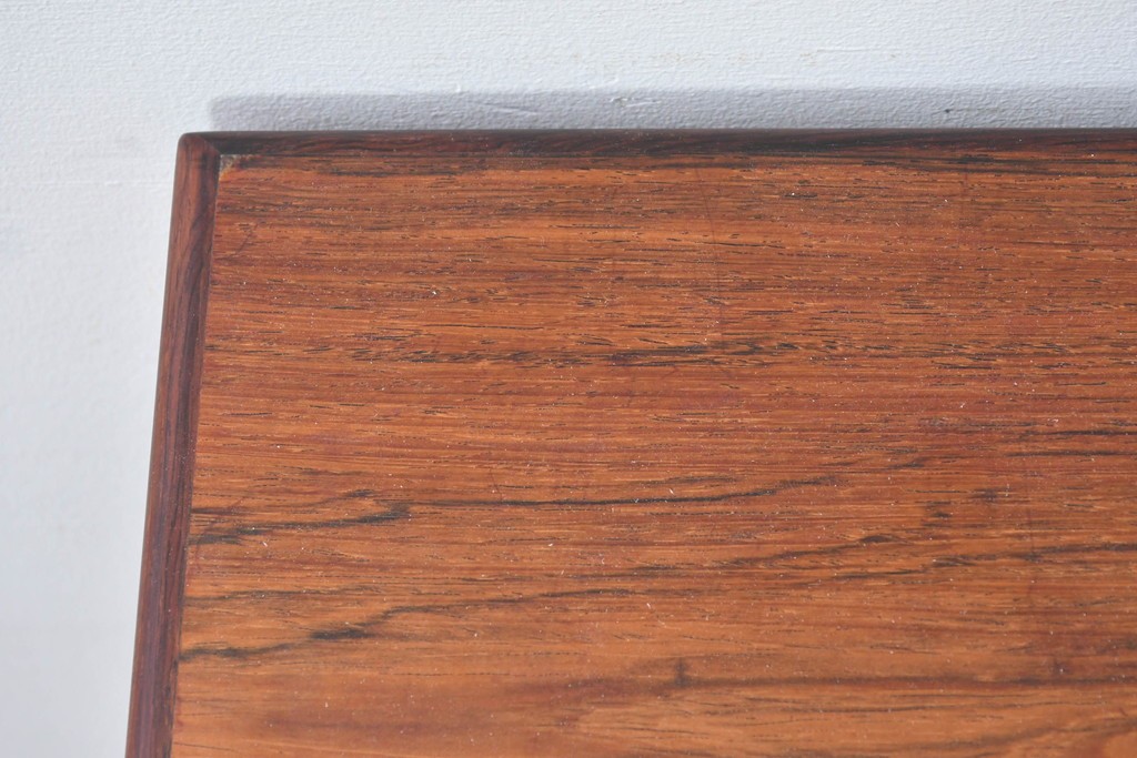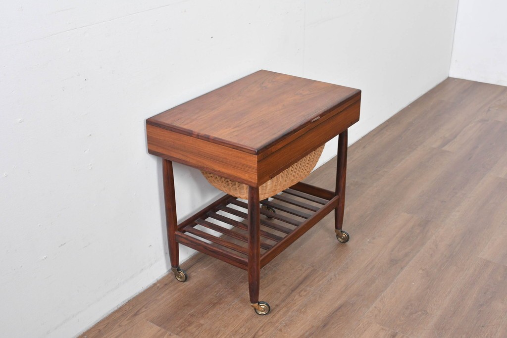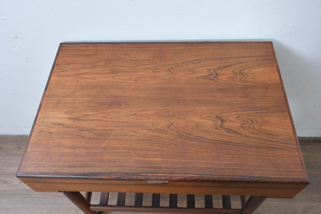 ローズウッド材を用い、突板張りの天板や精巧な木組みで仕上げられたソーイングテーブルです。均整のとれたフォルムには、デンマーク木工職人の高度な技術が息づき、北欧ミッドセンチュリーらしい端正な意匠が漂います。細部まで行き届いたつくりは、実用品でありながら工芸品のような佇まいを感じさせます。