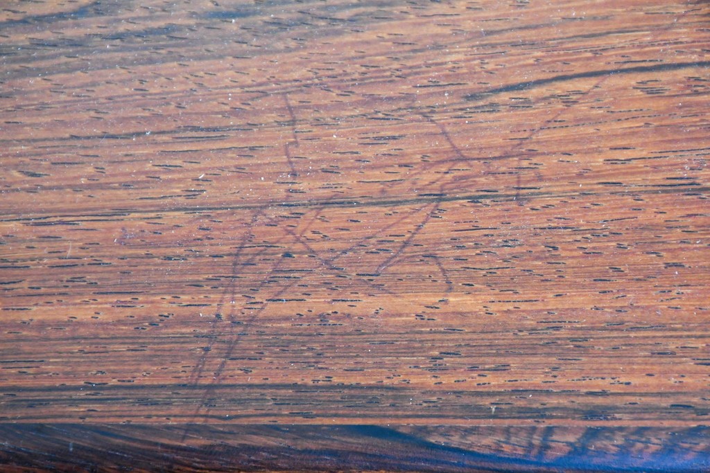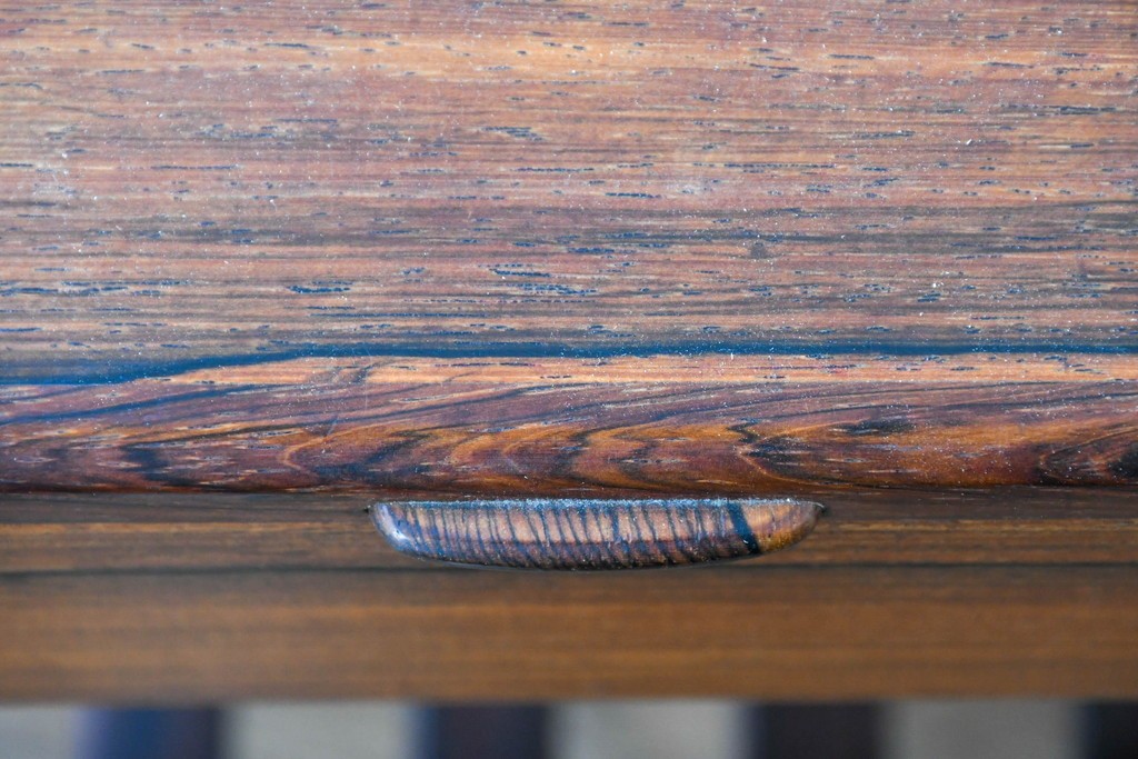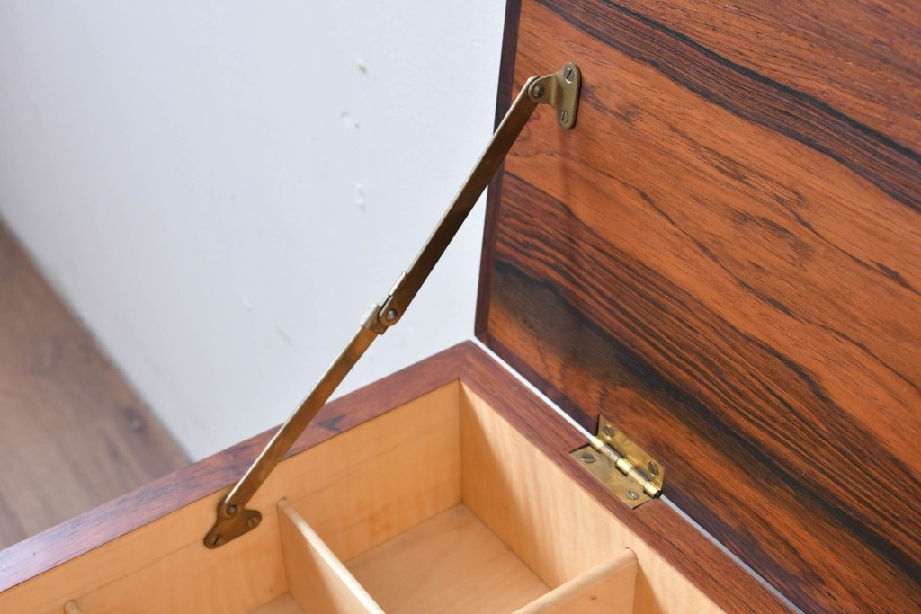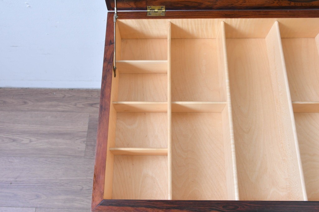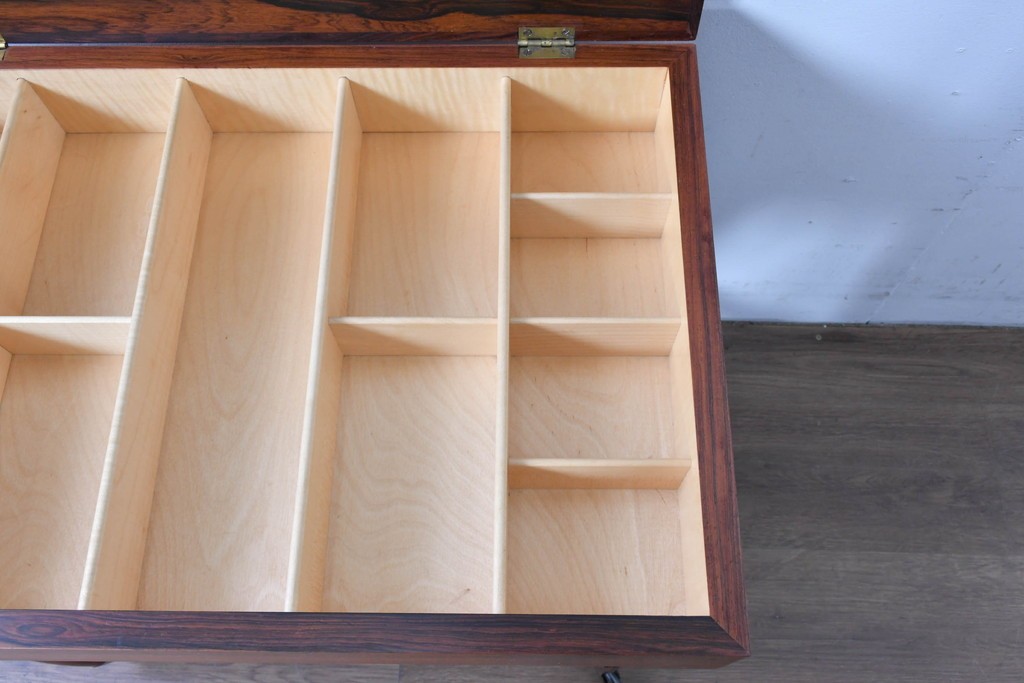 ローズウッド材を用い、突板張りの天板や精巧な木組みで仕上げられたソーイングテーブルです。均整のとれたフォルムには、デンマーク木工職人の高度な技術が息づき、北欧ミッドセンチュリーらしい端正な意匠が漂います。細部まで行き届いたつくりは、実用品でありながら工芸品のような佇まいを感じさせます。