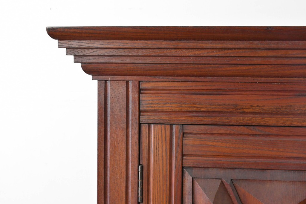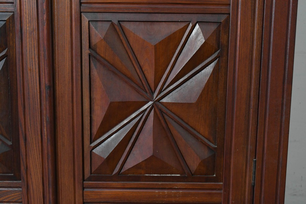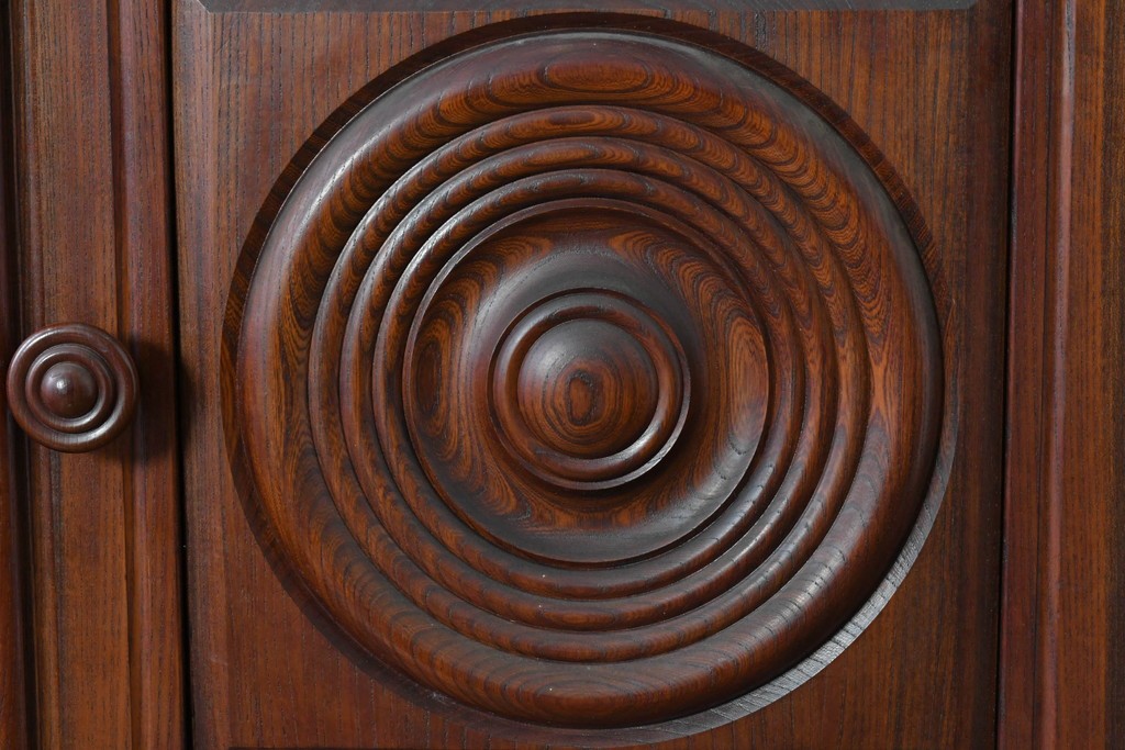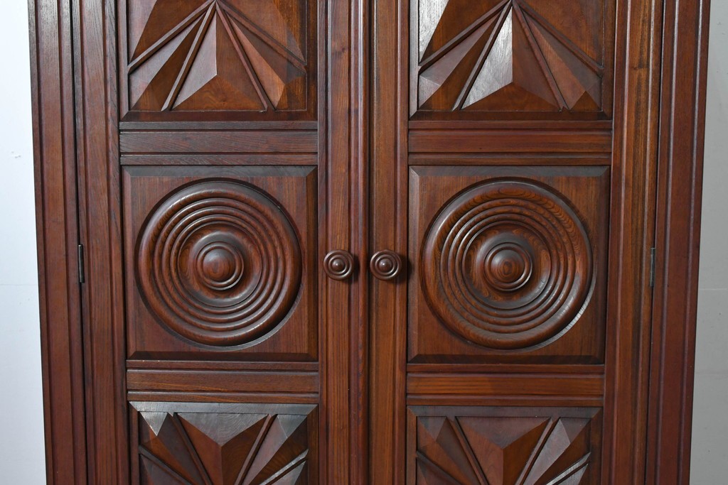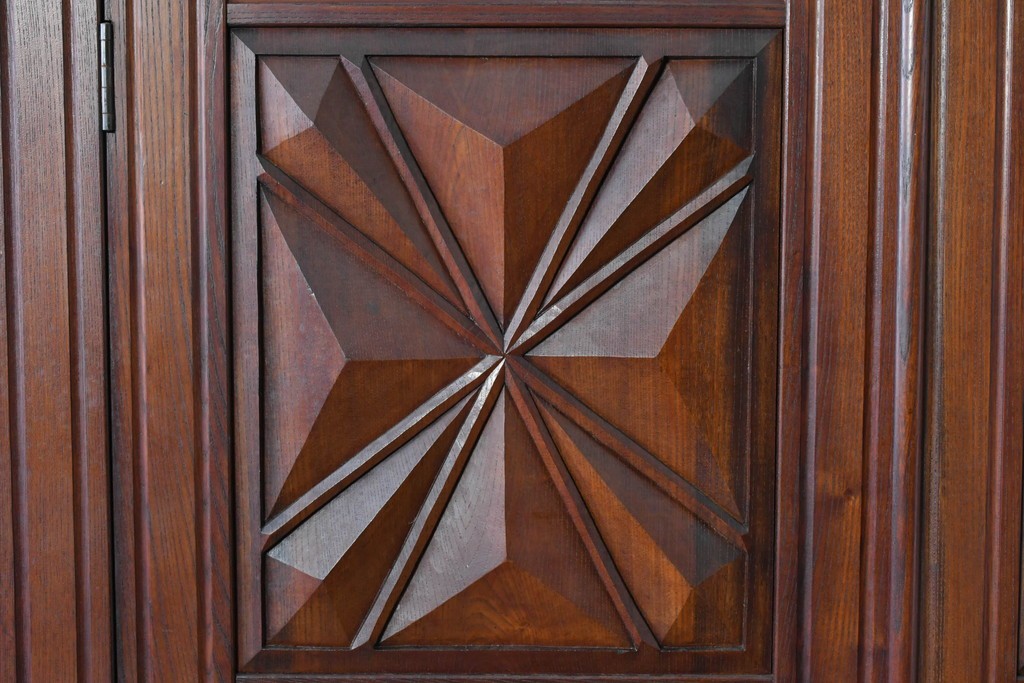 扉一面に施された幾何学的な彫刻が印象的で、松本民芸家具ならではの重厚な雰囲気を楽しめます。立体感のある深い彫りが欅材の力強い木目と調和し、空間の主役になる佇まいを感じさせます。