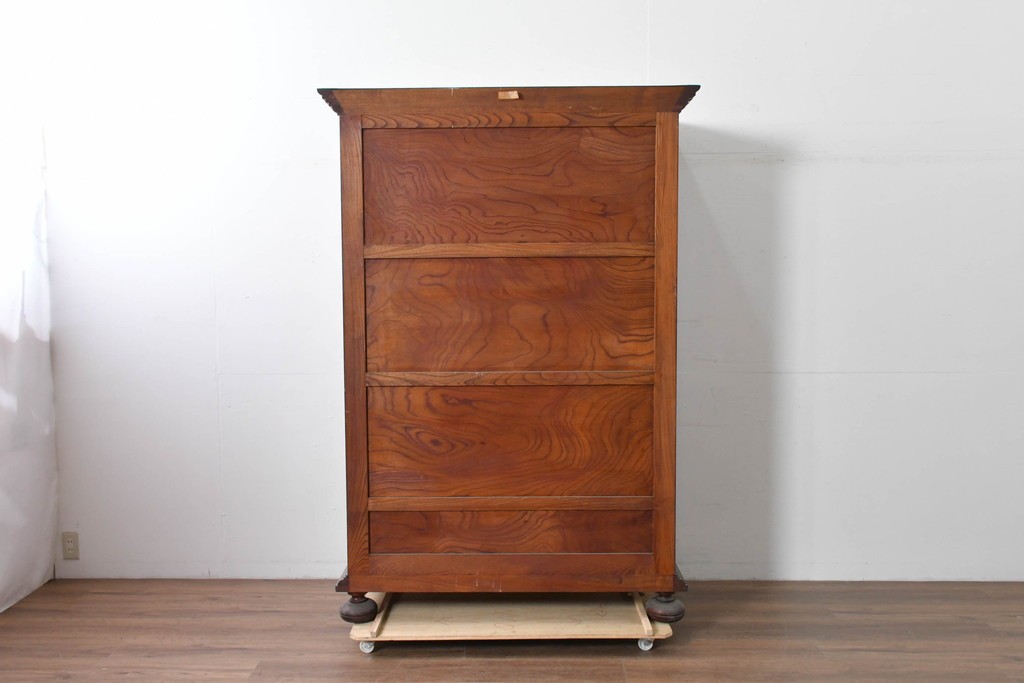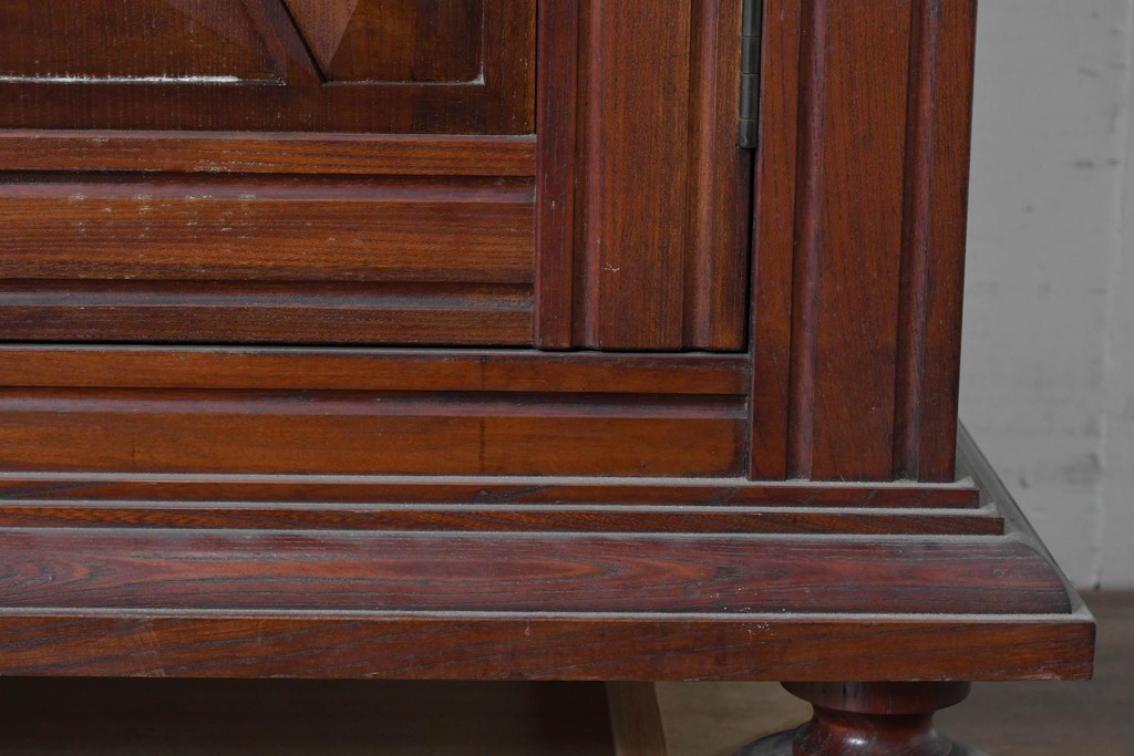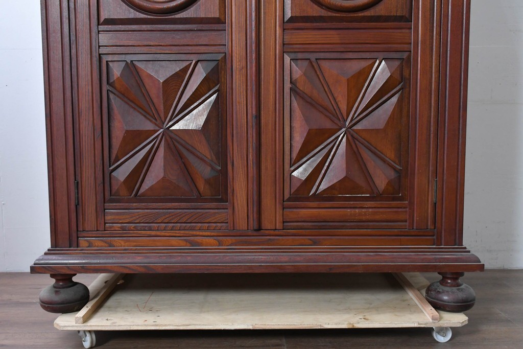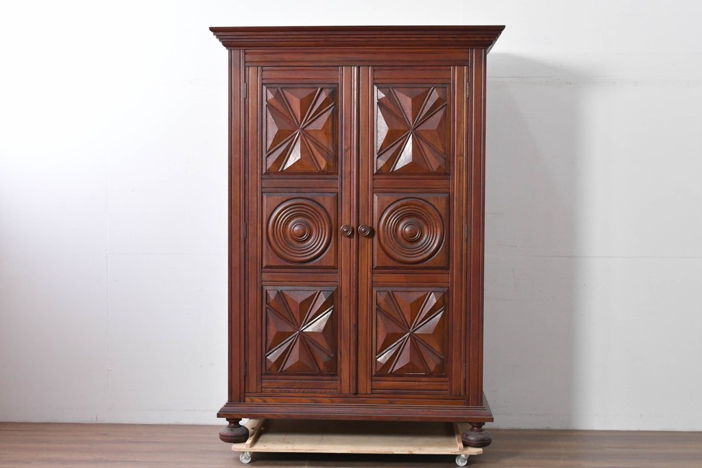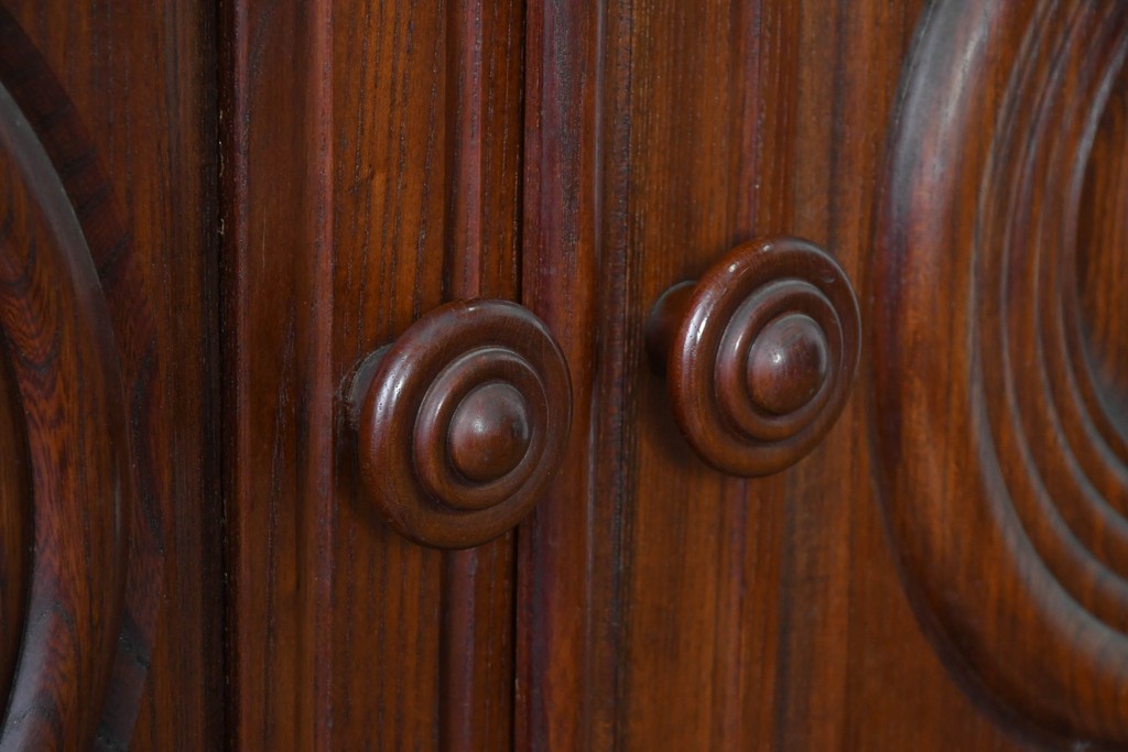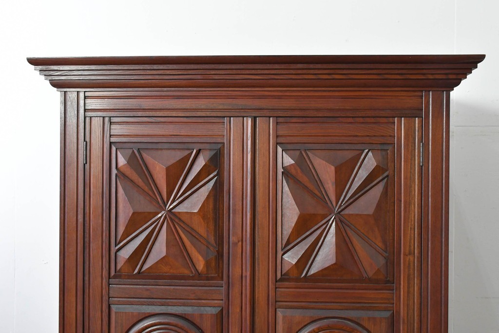 扉一面に施された幾何学的な彫刻が印象的で、松本民芸家具ならではの重厚な雰囲気を楽しめます。立体感のある深い彫りが欅材の力強い木目と調和し、空間の主役になる佇まいを感じさせます。