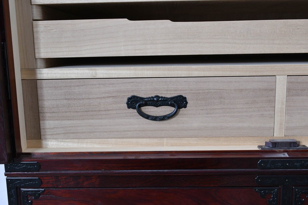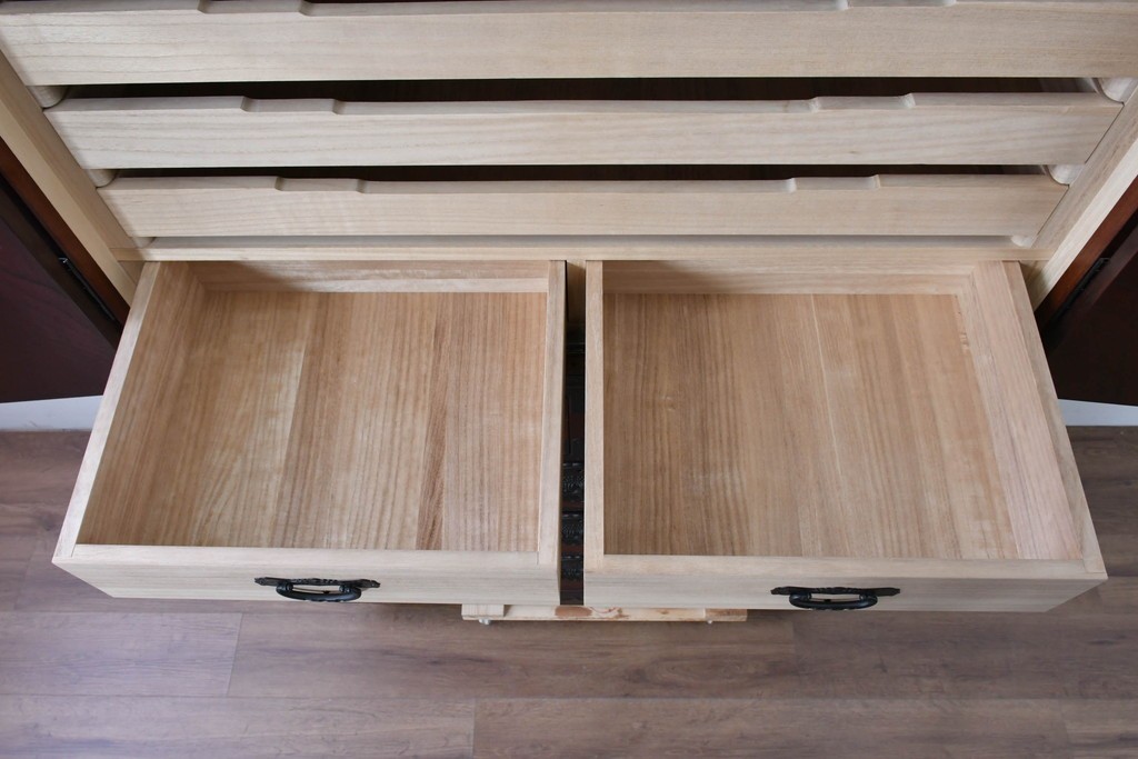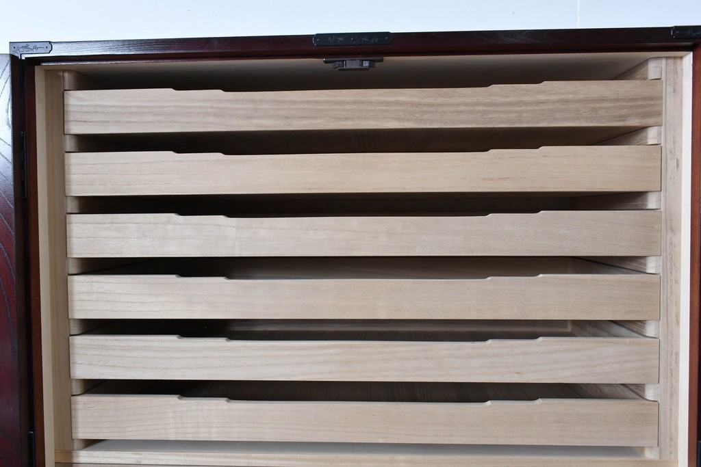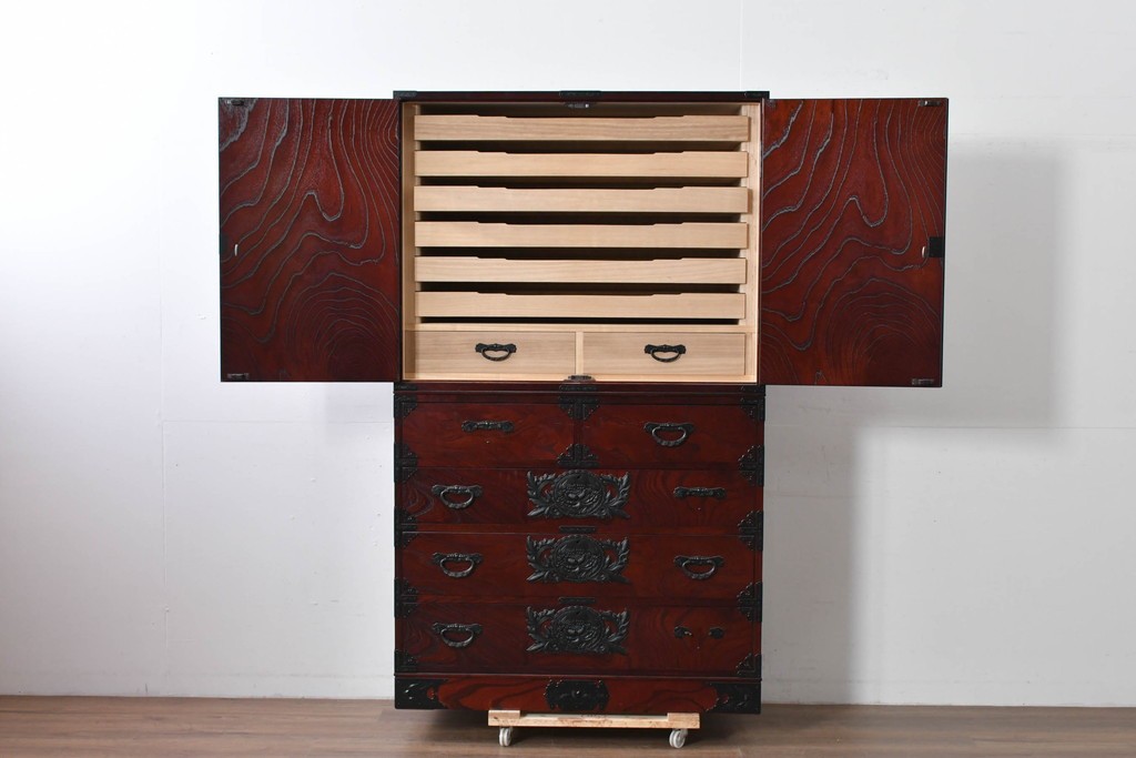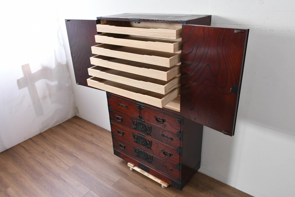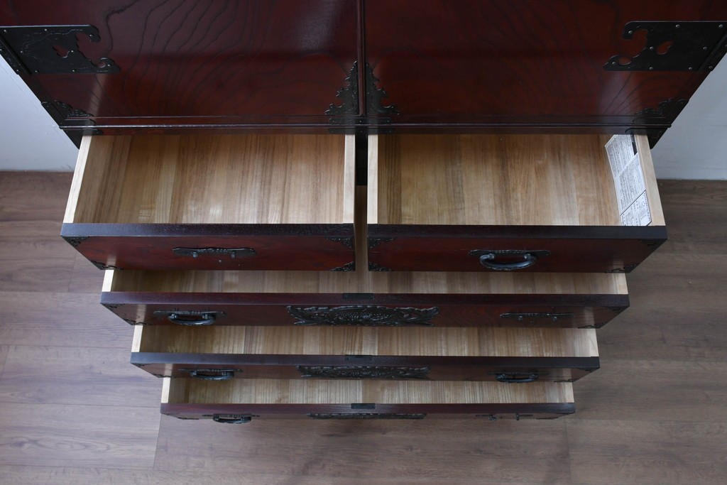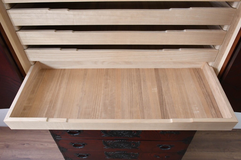 上段の観音開き内部には浅めの衣装盆や引き出しが配置され、着物や小物の整理に適したつくりです。下段にはゆとりある引き出しが5杯備わり、衣類収納の実用性もしっかりと備えています。