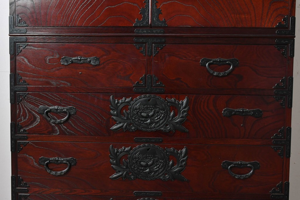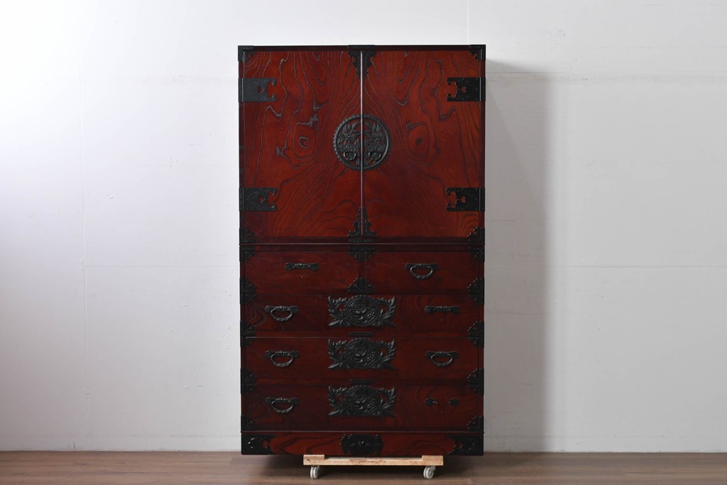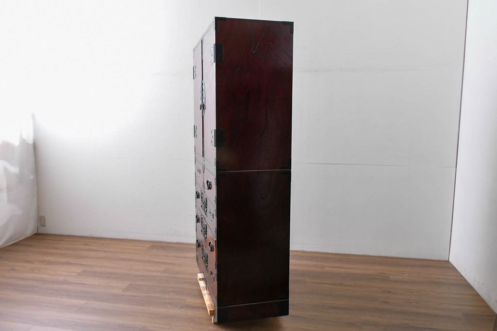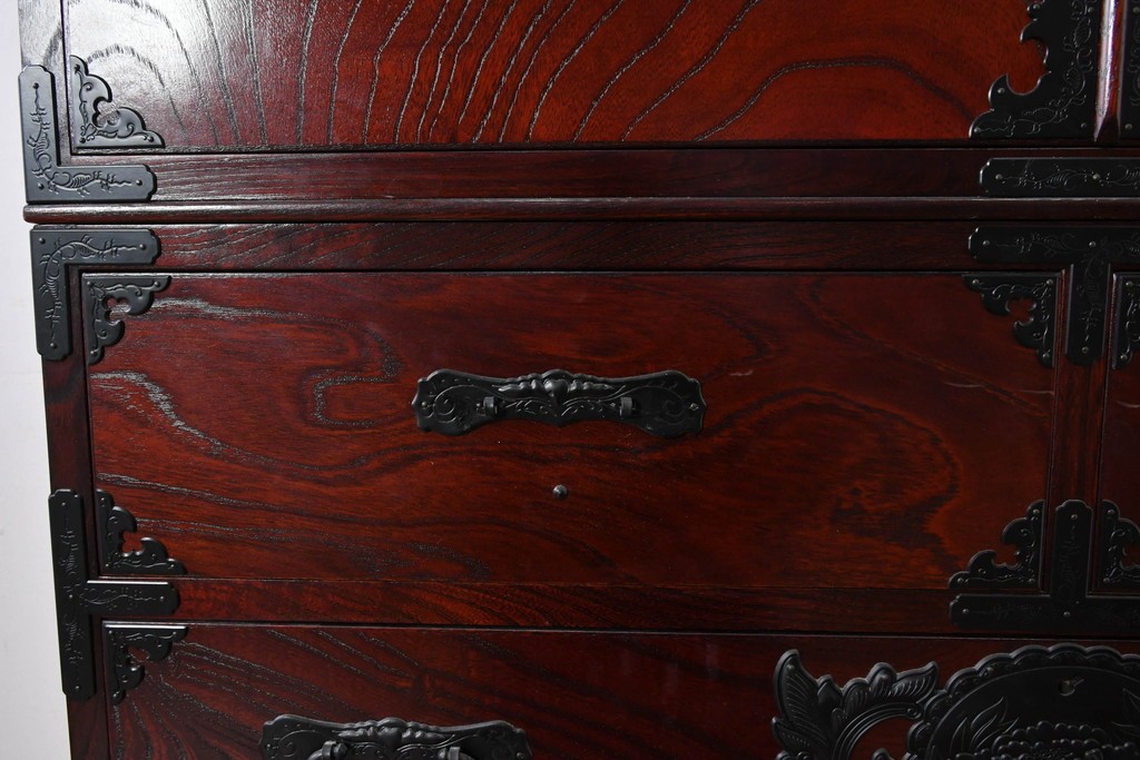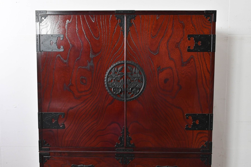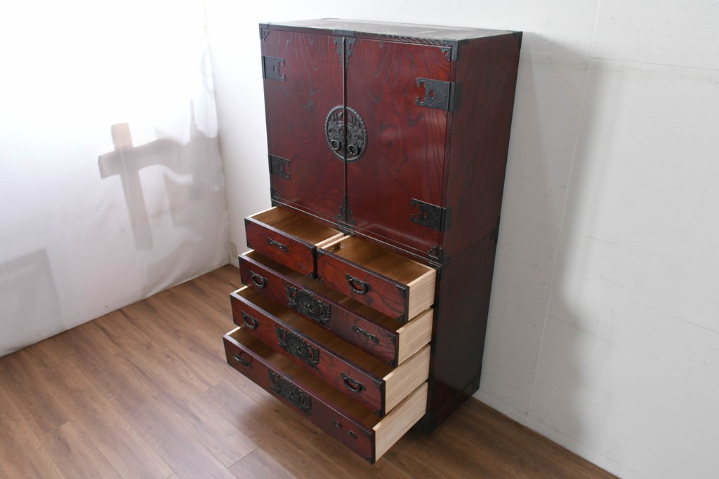 上段の観音開き内部には浅めの衣装盆や引き出しが配置され、着物や小物の整理に適したつくりです。下段にはゆとりある引き出しが5杯備わり、衣類収納の実用性もしっかりと備えています。