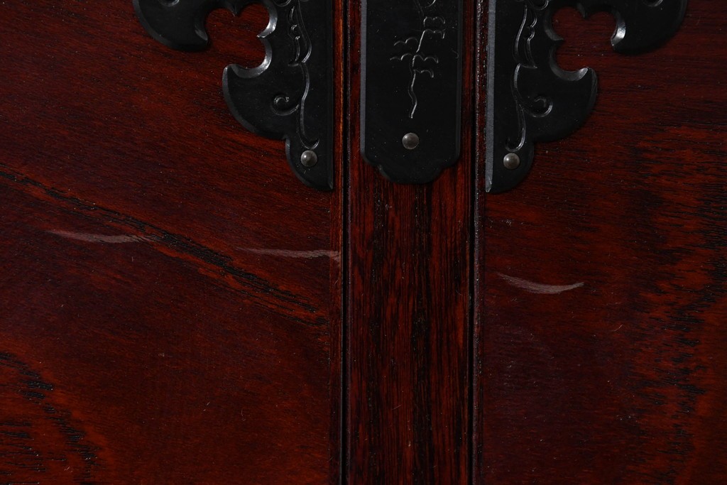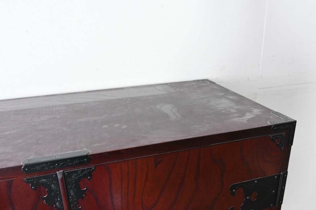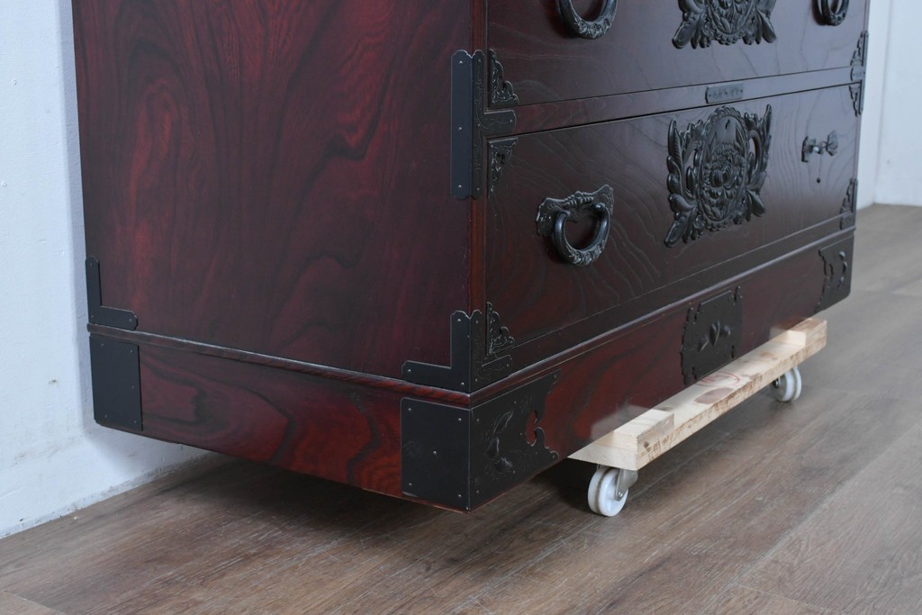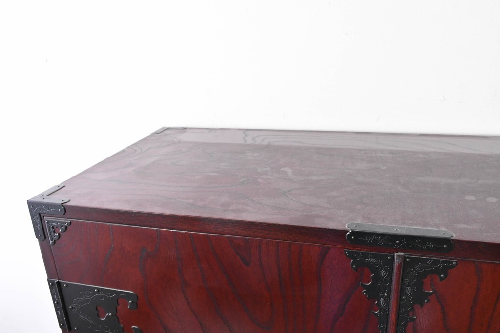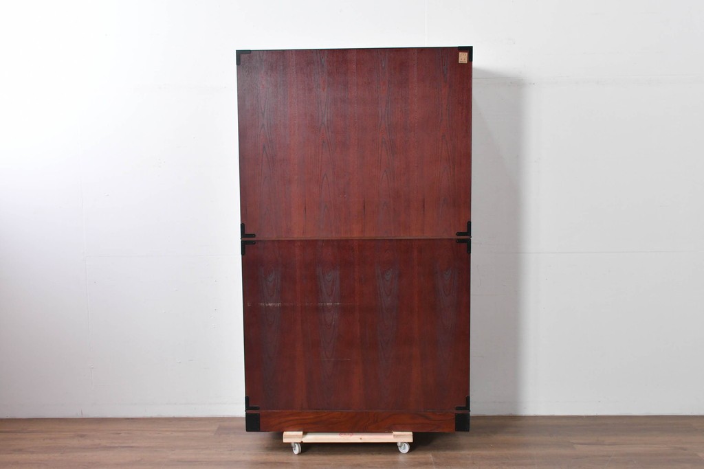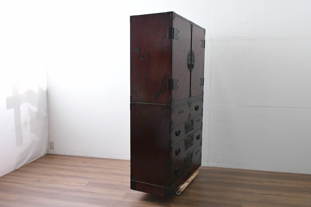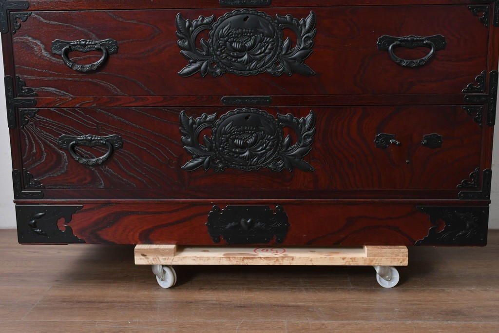 上段の観音開き内部には浅めの衣装盆や引き出しが配置され、着物や小物の整理に適したつくりです。下段にはゆとりある引き出しが5杯備わり、衣類収納の実用性もしっかりと備えています。