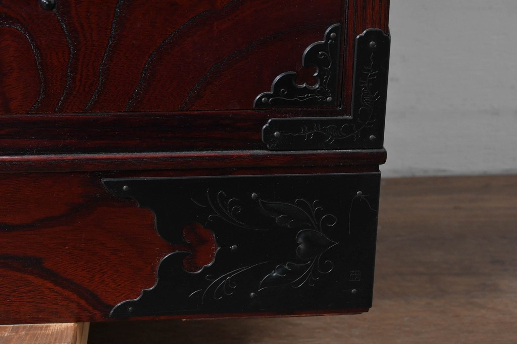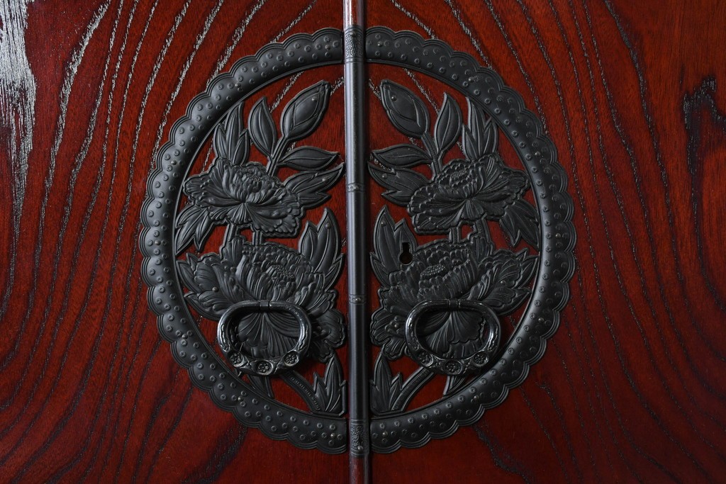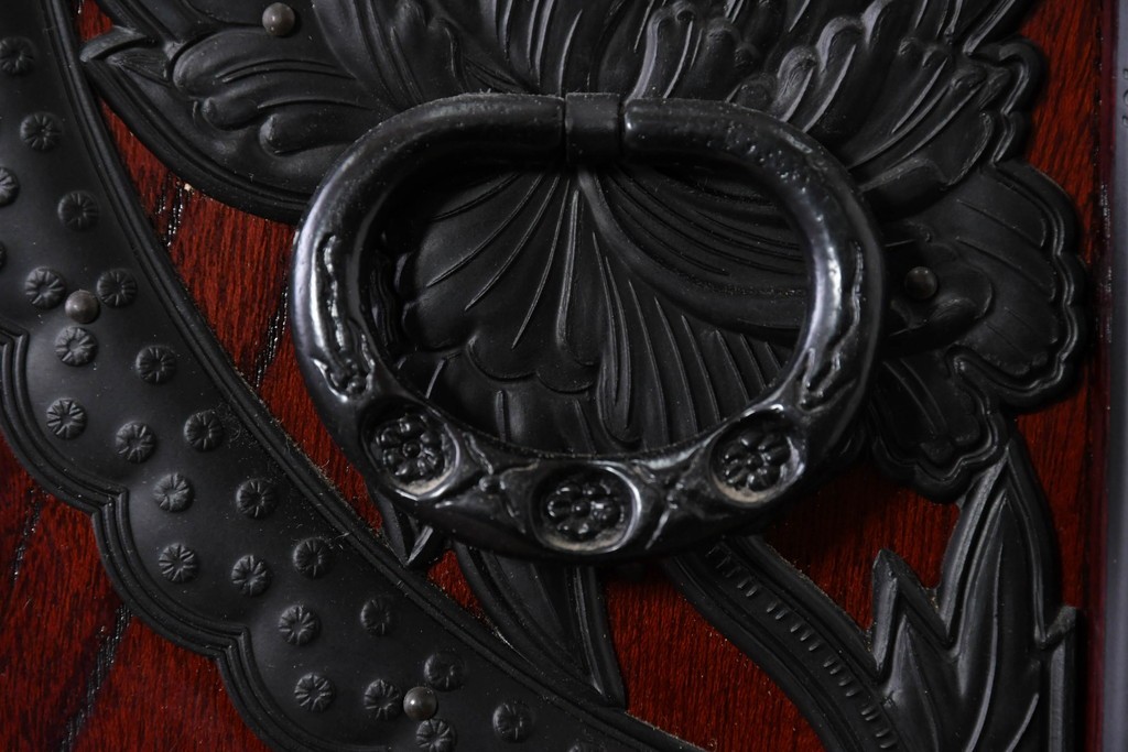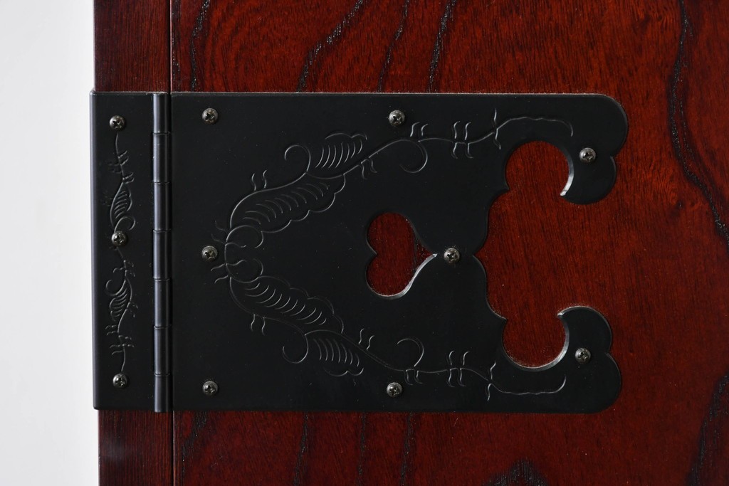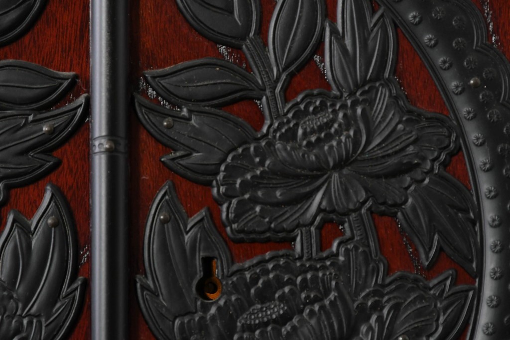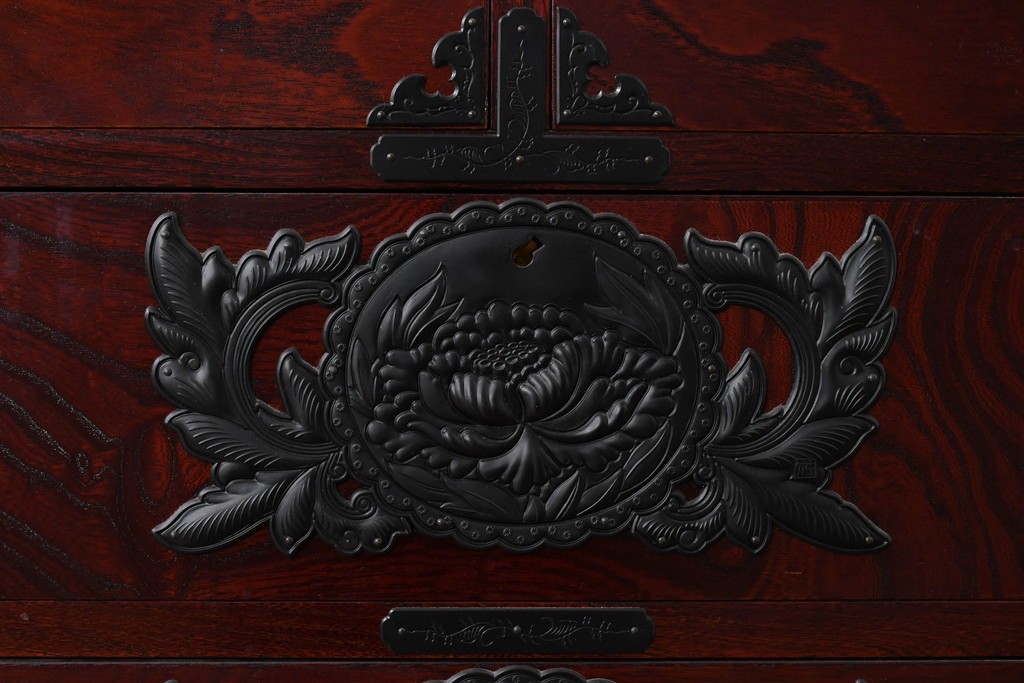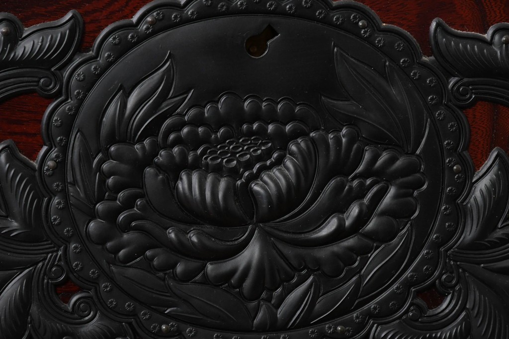 牡丹を象った華やかな金具が、重厚さの中に優雅さを添えています。細かな打ち出しや曲線的な装飾が丁寧に作り込まれており、伝統工芸の美意識が細部にまで息づく仕上がりです。