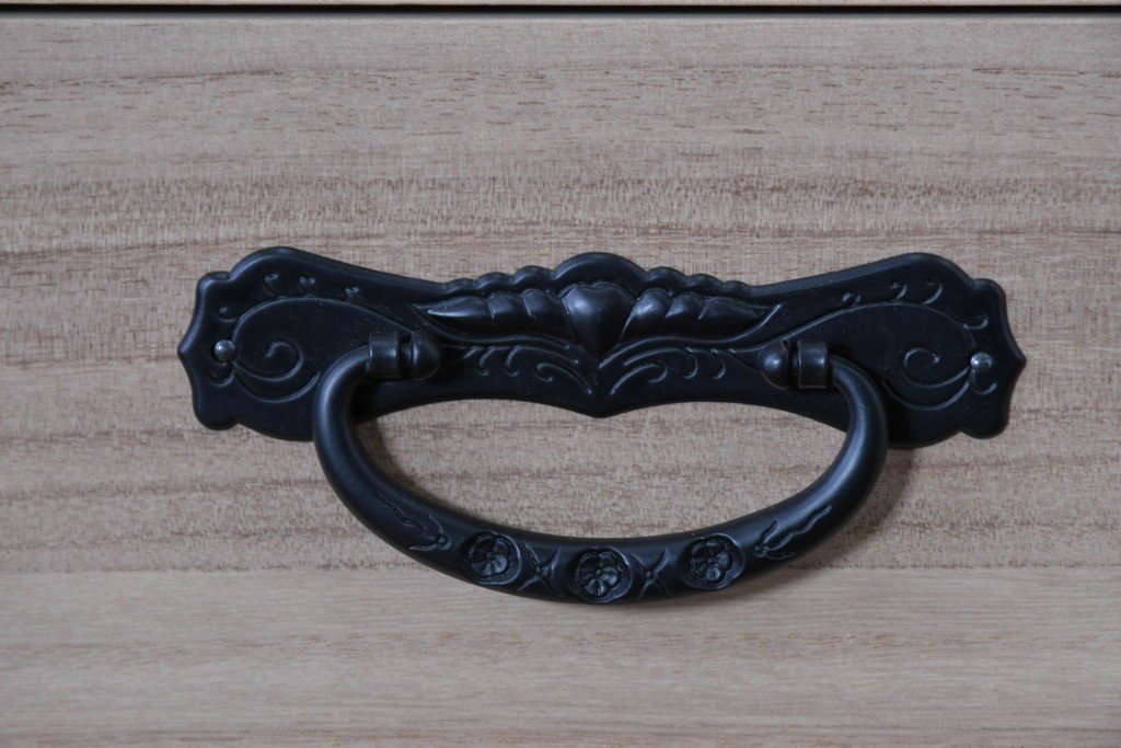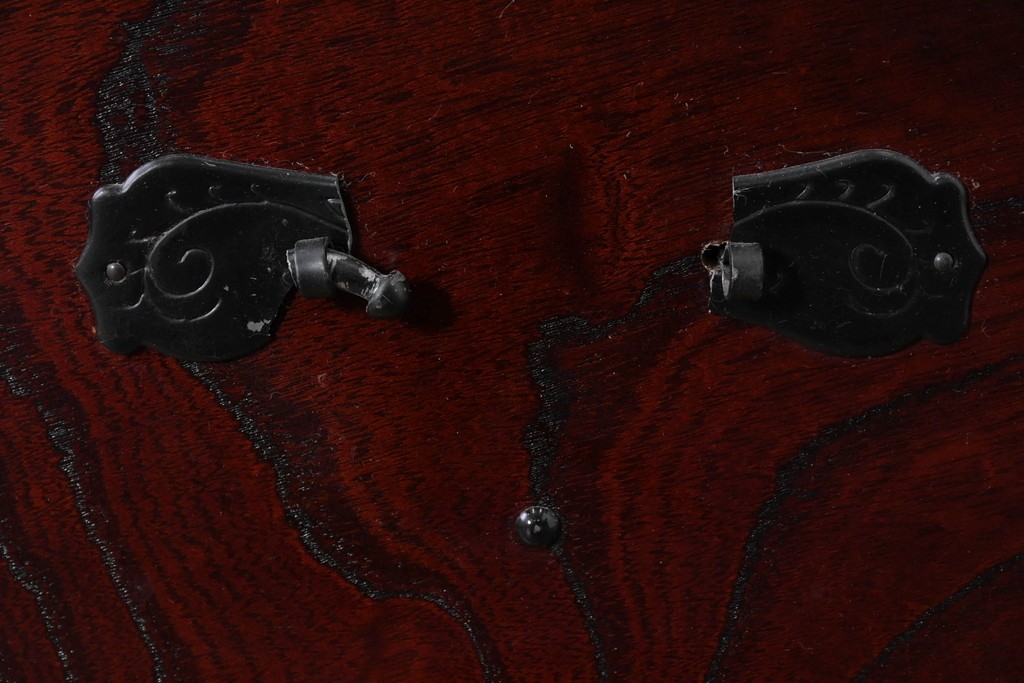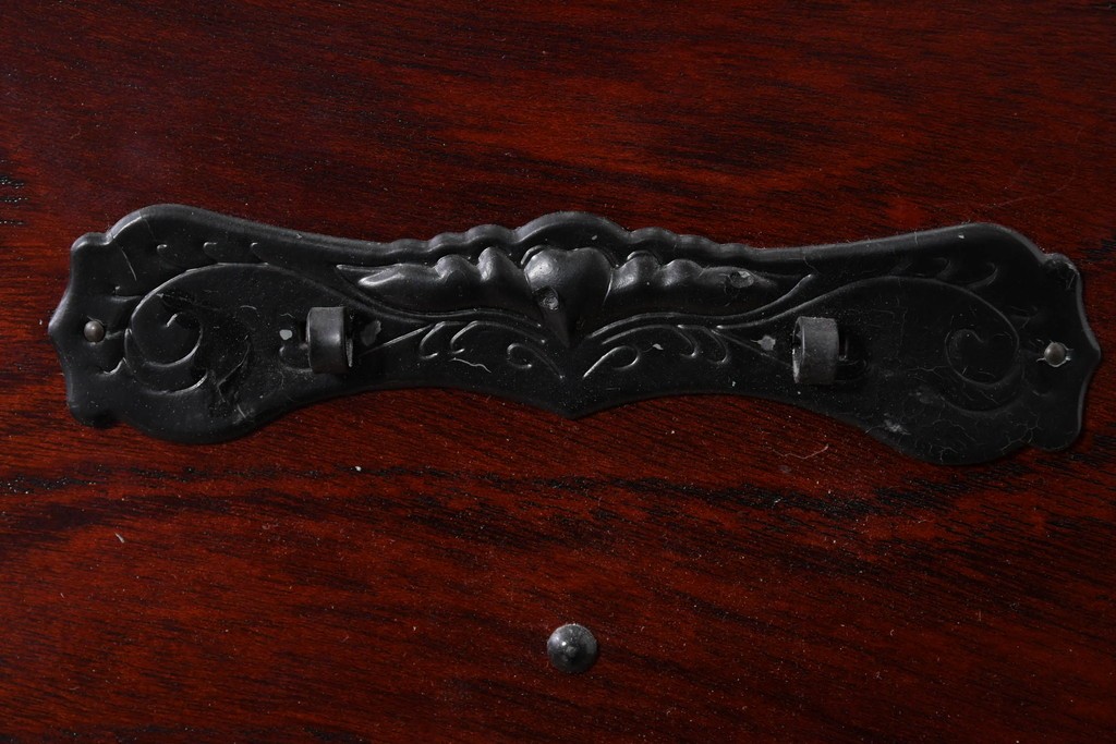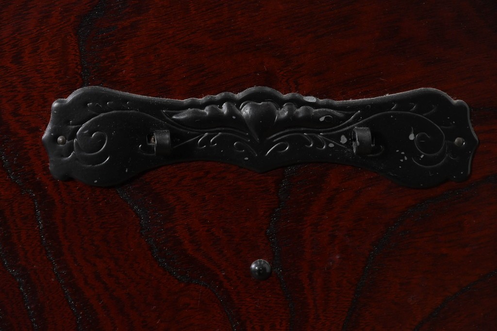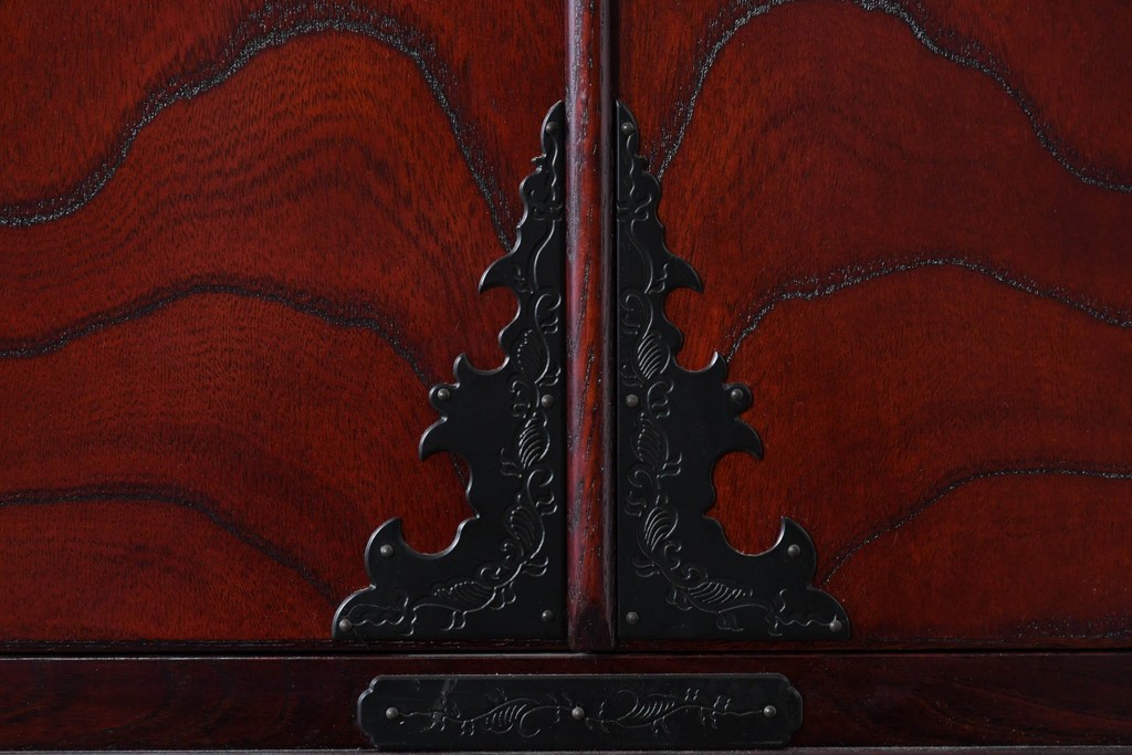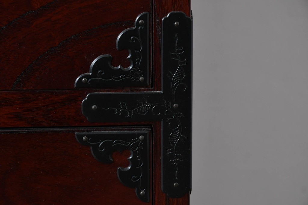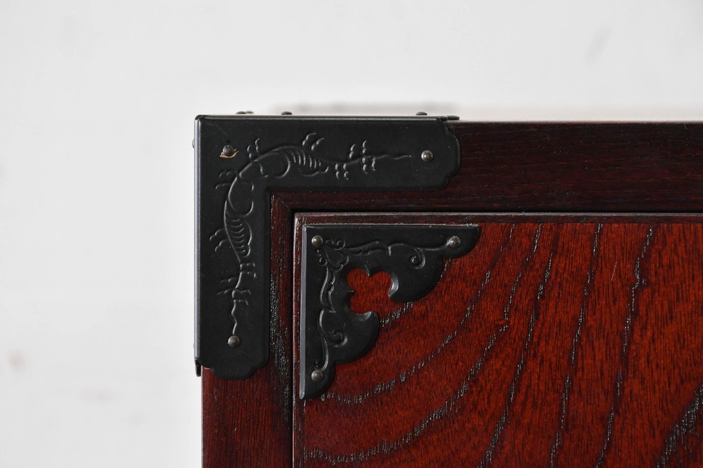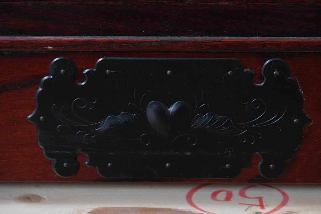 牡丹を象った華やかな金具が、重厚さの中に優雅さを添えています。細かな打ち出しや曲線的な装飾が丁寧に作り込まれており、伝統工芸の美意識が細部にまで息づく仕上がりです。