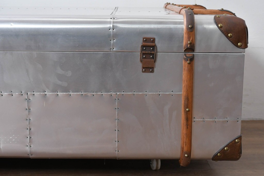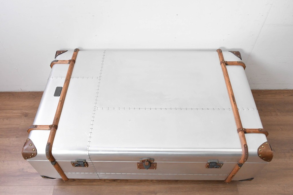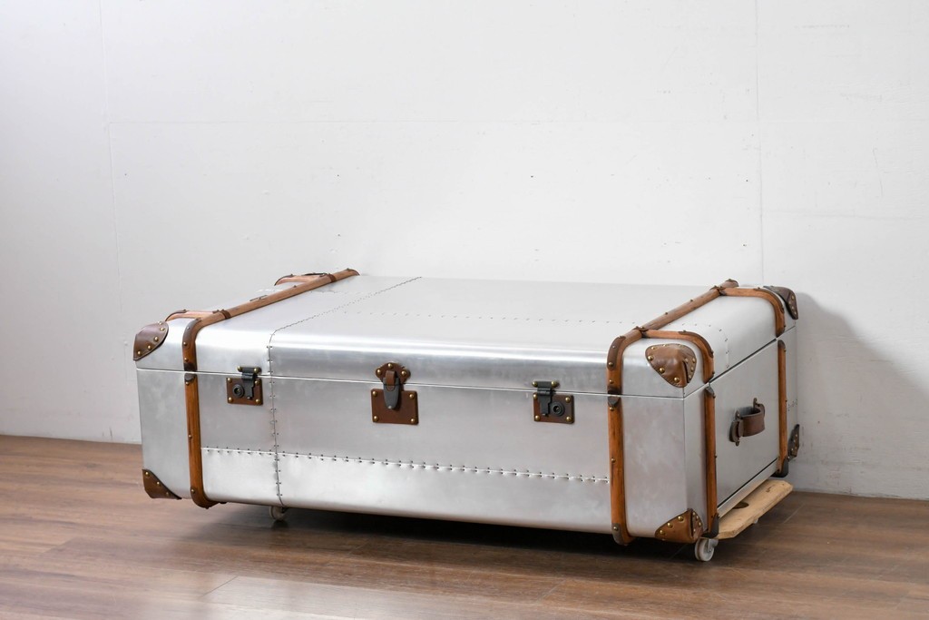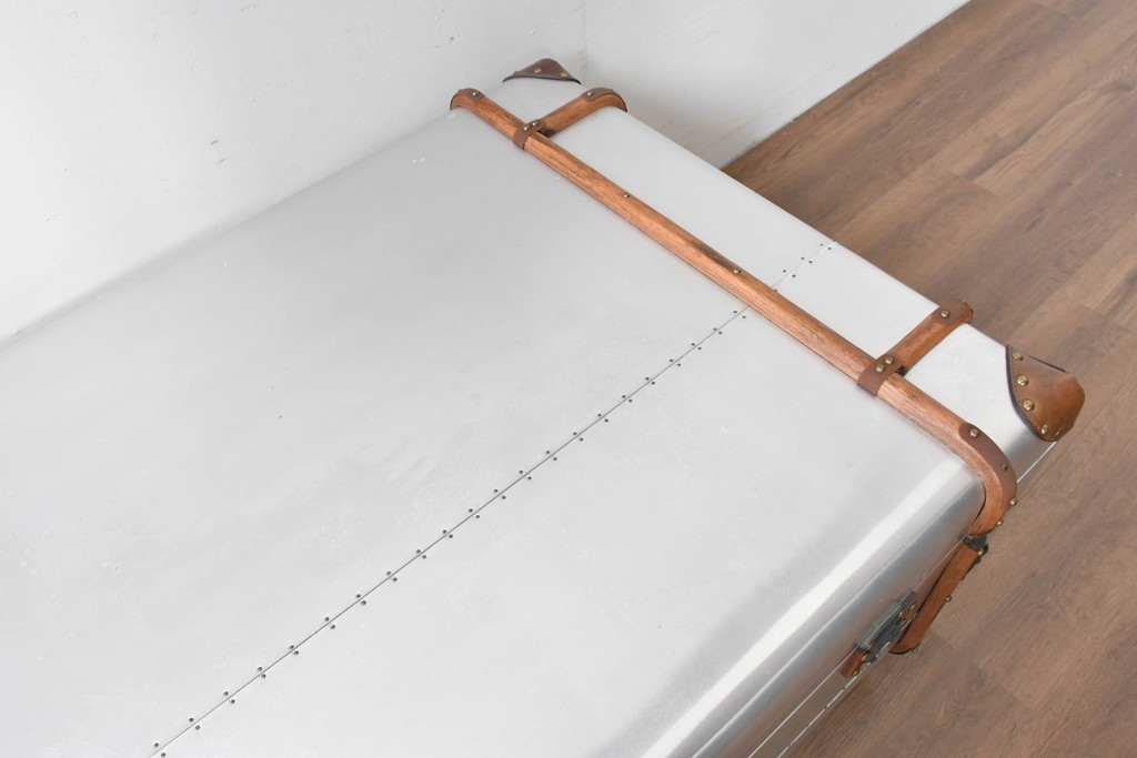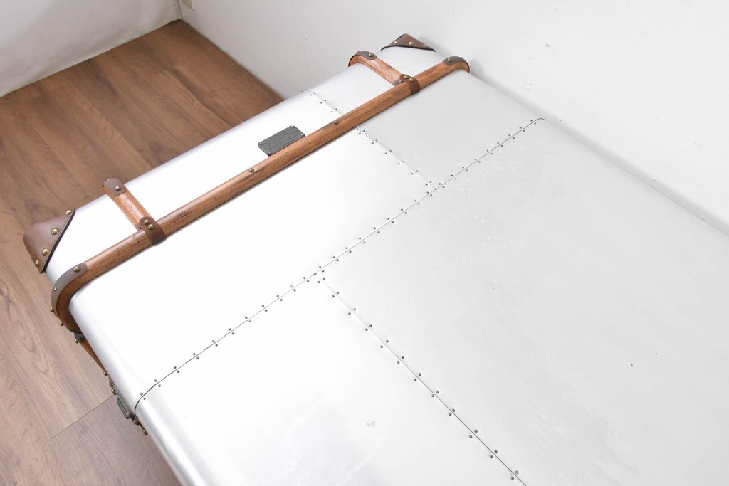 航空機の外板を思わせるメタルパネルをリベットで丁寧に連ねた外装は、Globetrekkerシリーズならではの存在感です。フラットで重厚な面構成と光を反射する金属の質感が美しく、ティモシー・オルトン独自の“旅”の世界観が前面に表れています。コーヒーテーブルとして置くだけで空間の主役になる力強さがあります。