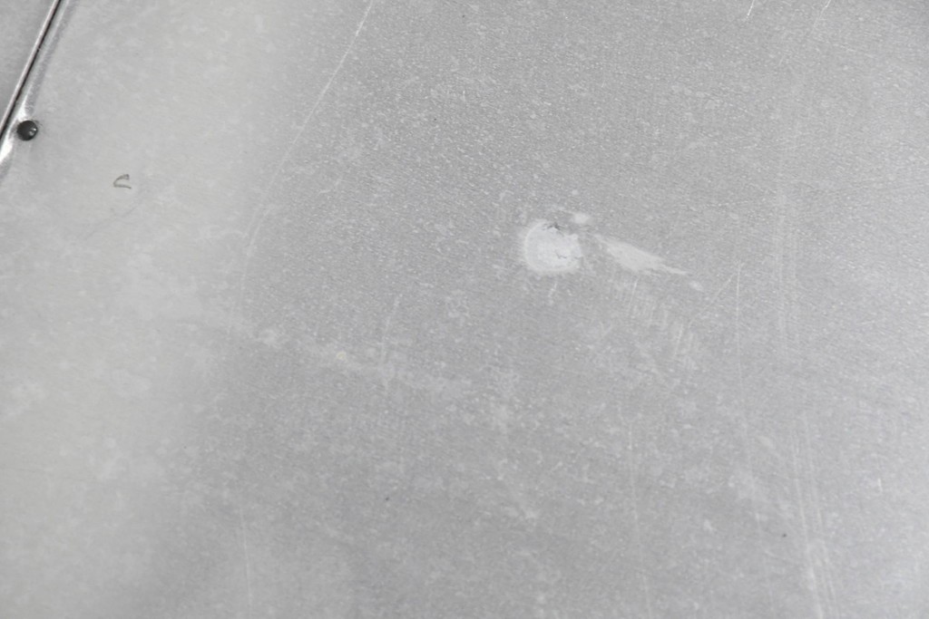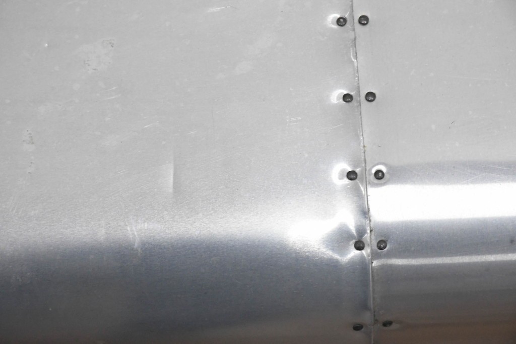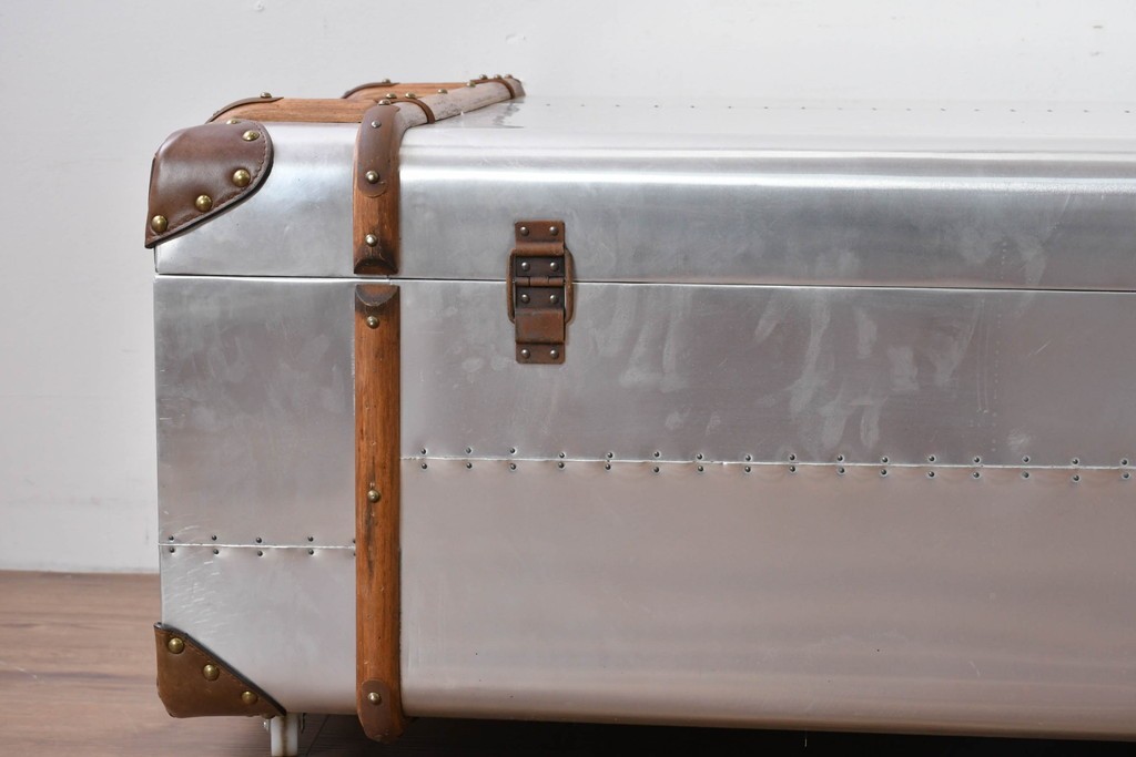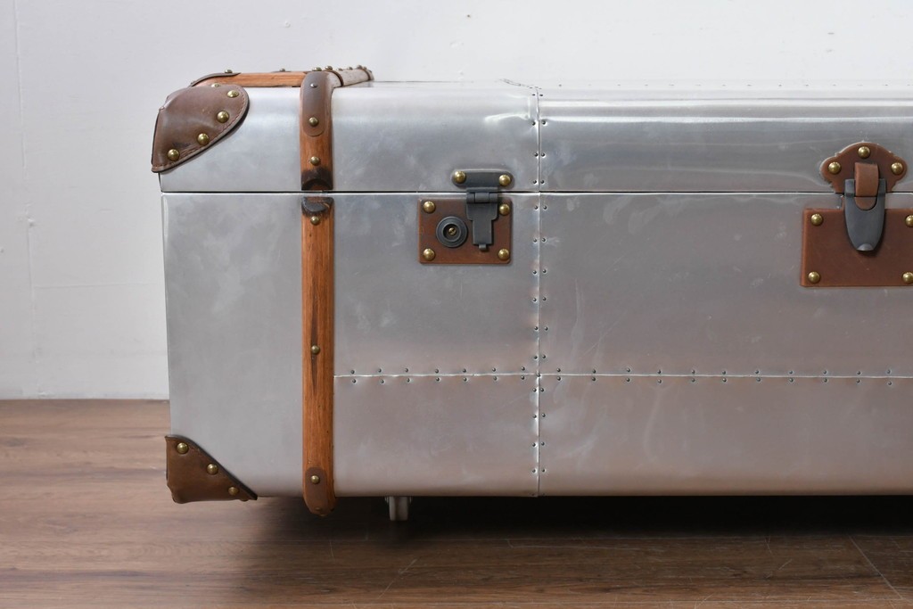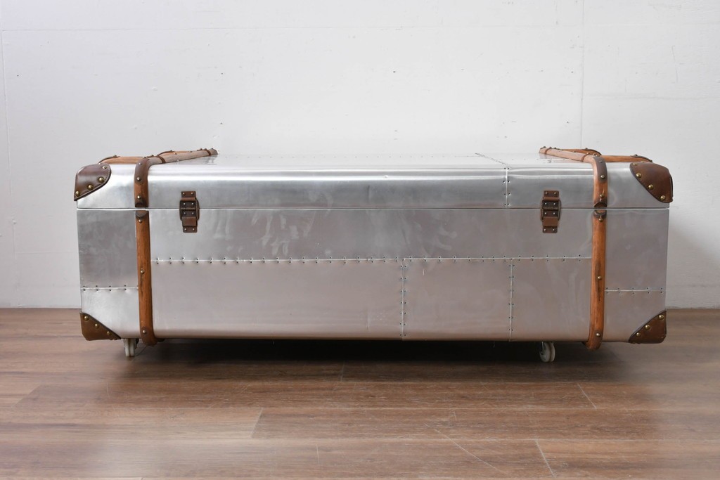 航空機の外板を思わせるメタルパネルをリベットで丁寧に連ねた外装は、Globetrekkerシリーズならではの存在感です。フラットで重厚な面構成と光を反射する金属の質感が美しく、ティモシー・オルトン独自の“旅”の世界観が前面に表れています。コーヒーテーブルとして置くだけで空間の主役になる力強さがあります。