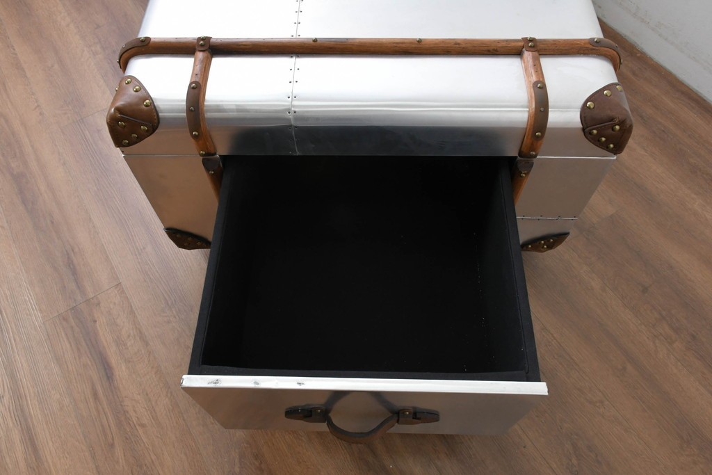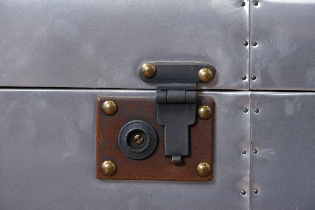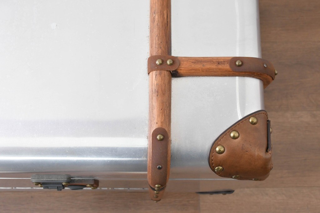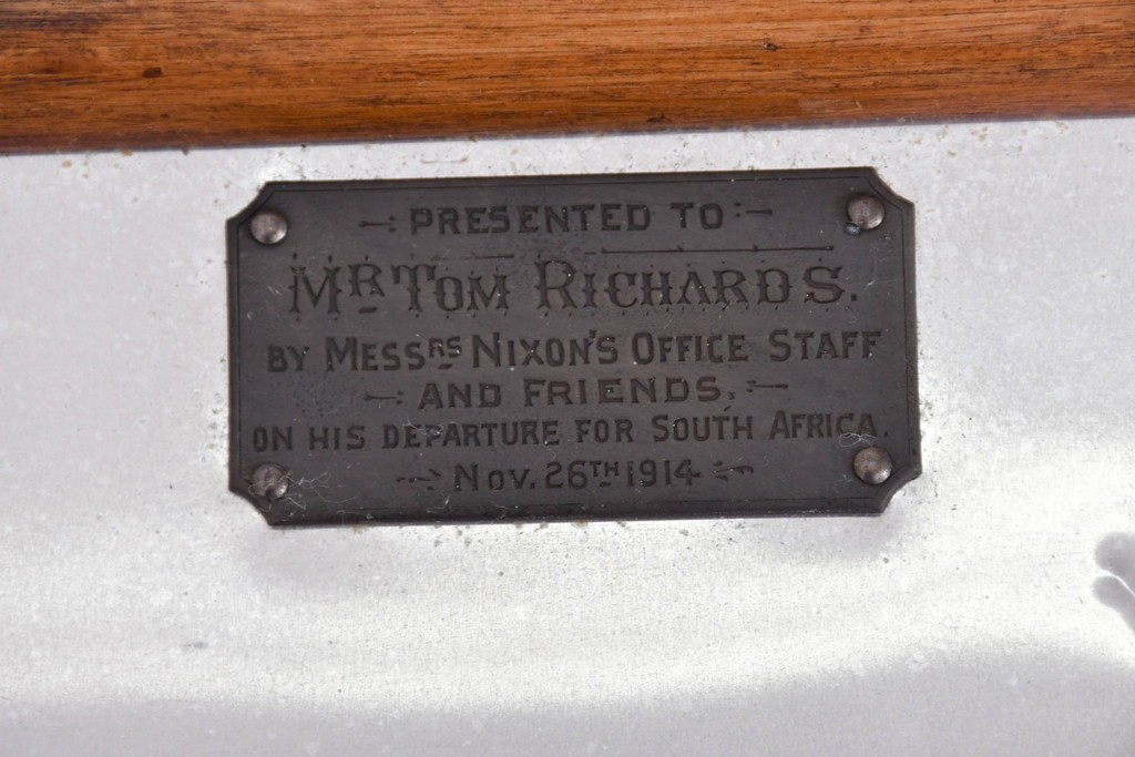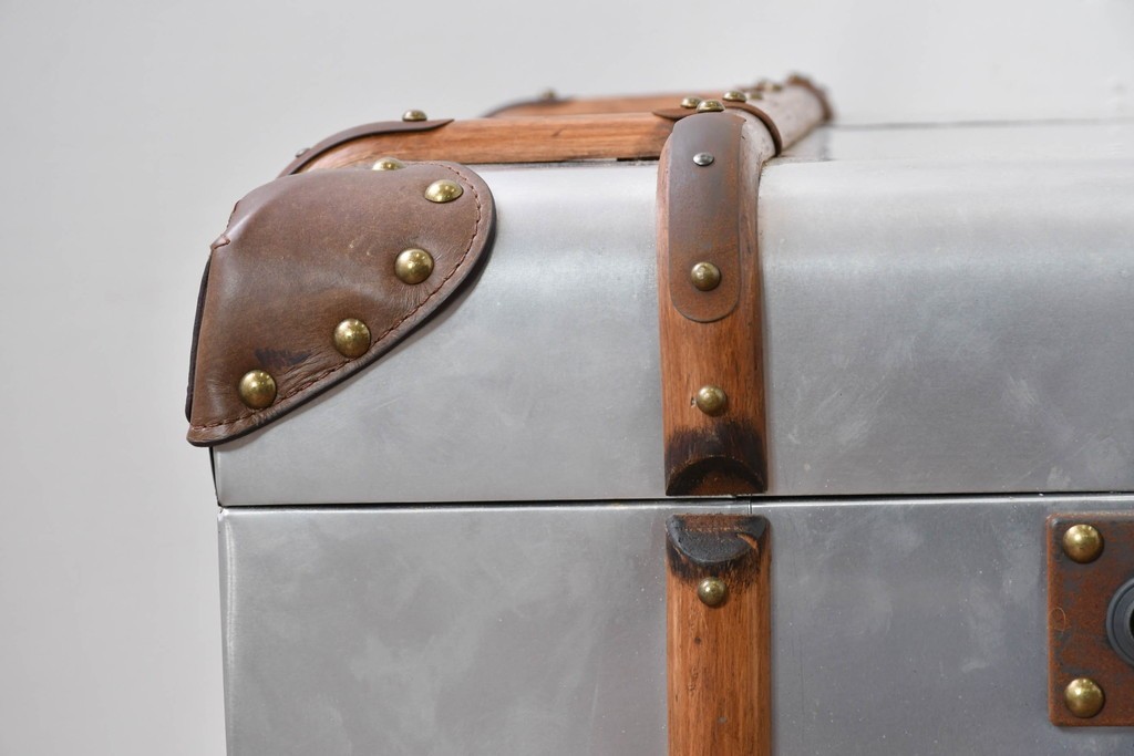 角や帯部分を縁取るレザートリムと、随所に用いられた鋲・金具がメタル外装と調和し、クラシックな旅鞄の雰囲気をより鮮明にしています。さらに印象的なのは、プレートが取り付けられており、1914年11月26日、トム・リチャーズ氏が英国から南アフリカへ旅立つ際に贈られた品である旨のメッセージが記されています。歴史を感じさせるディテールが、家具という枠を超えた物語性を添えています。