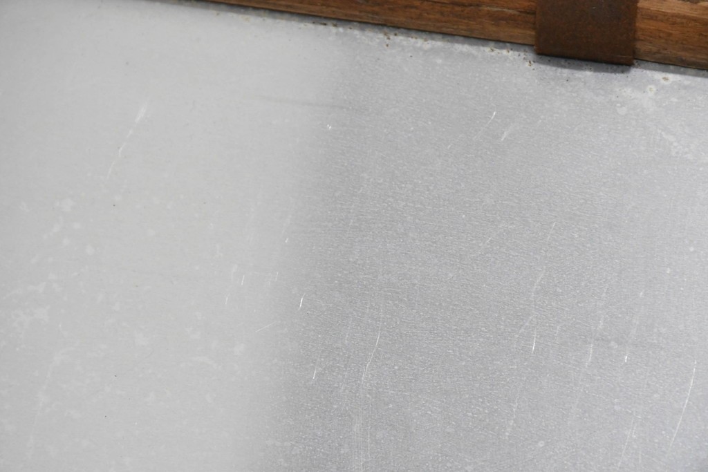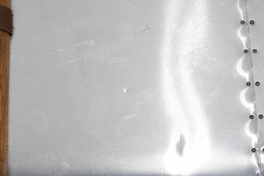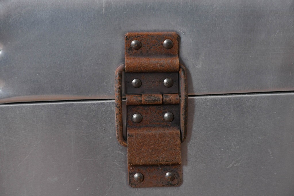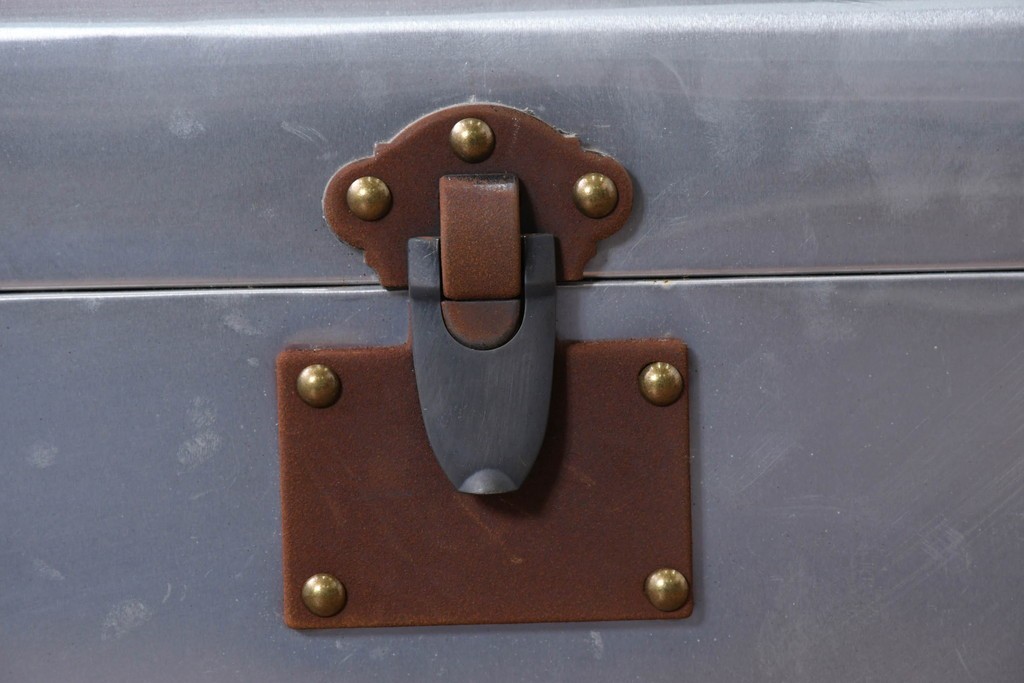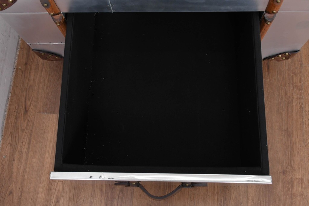 角や帯部分を縁取るレザートリムと、随所に用いられた鋲・金具がメタル外装と調和し、クラシックな旅鞄の雰囲気をより鮮明にしています。さらに印象的なのは、プレートが取り付けられており、1914年11月26日、トム・リチャーズ氏が英国から南アフリカへ旅立つ際に贈られた品である旨のメッセージが記されています。歴史を感じさせるディテールが、家具という枠を超えた物語性を添えています。