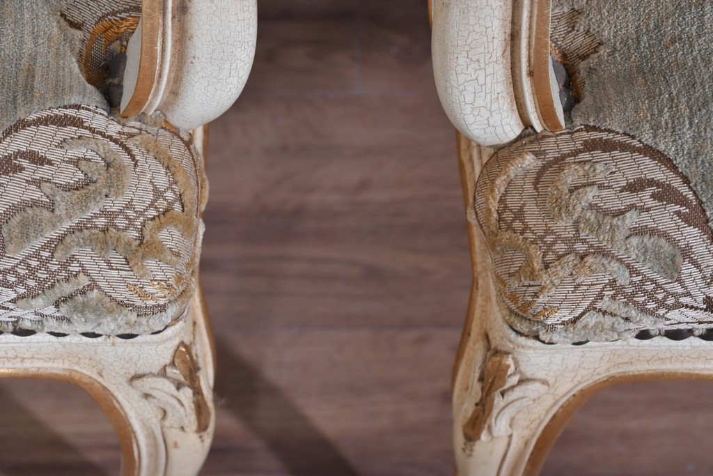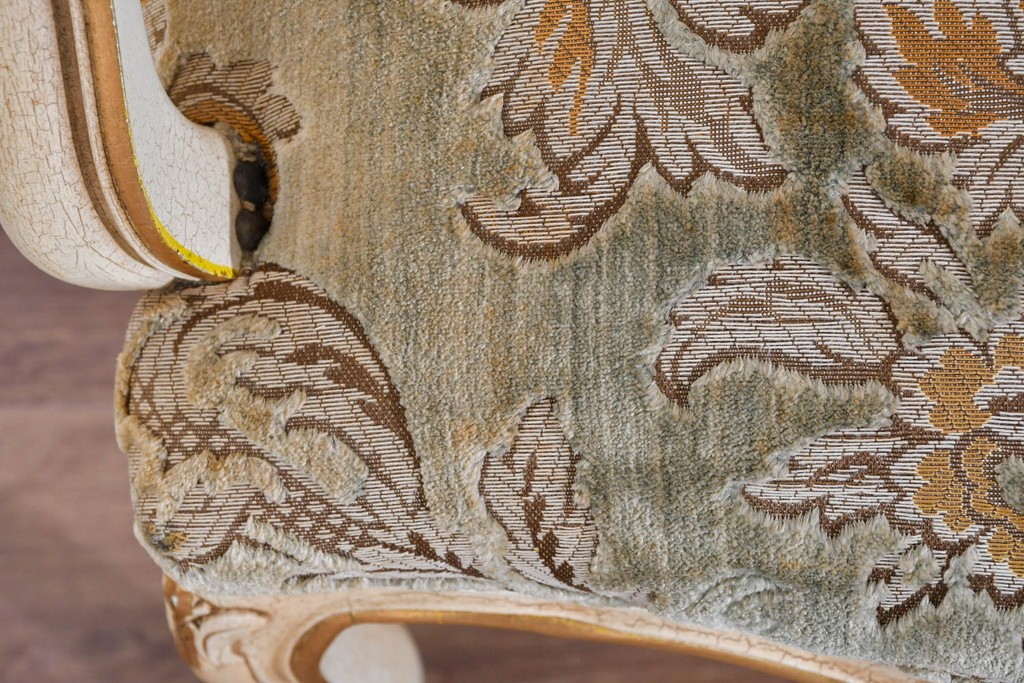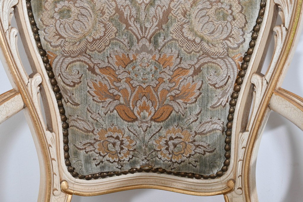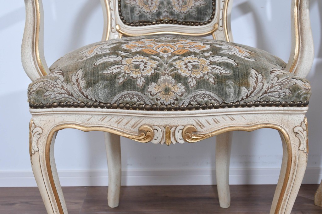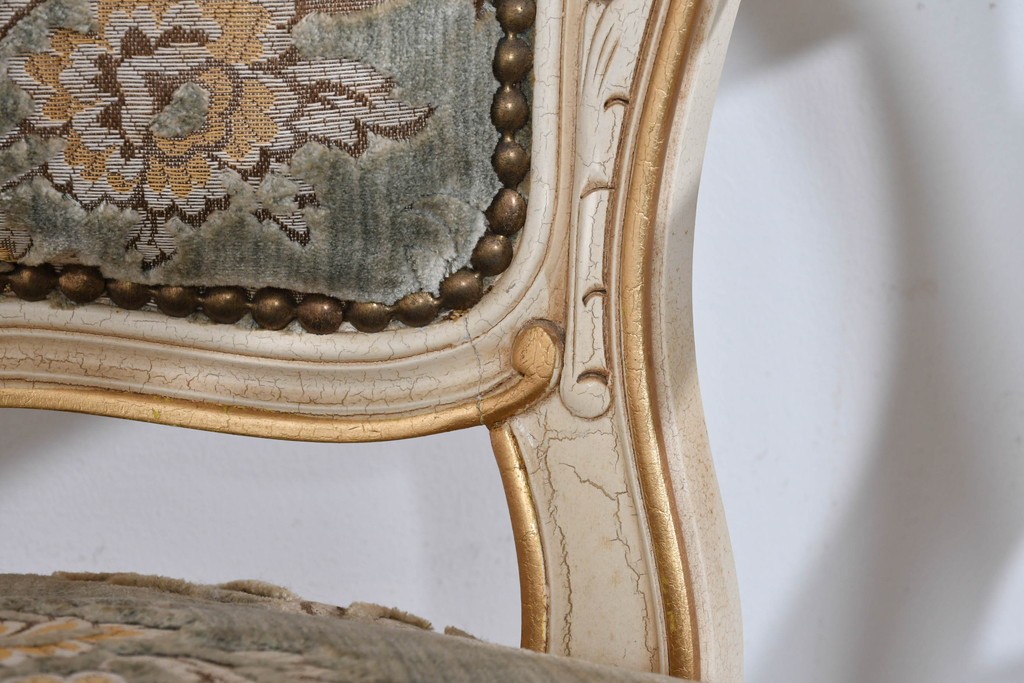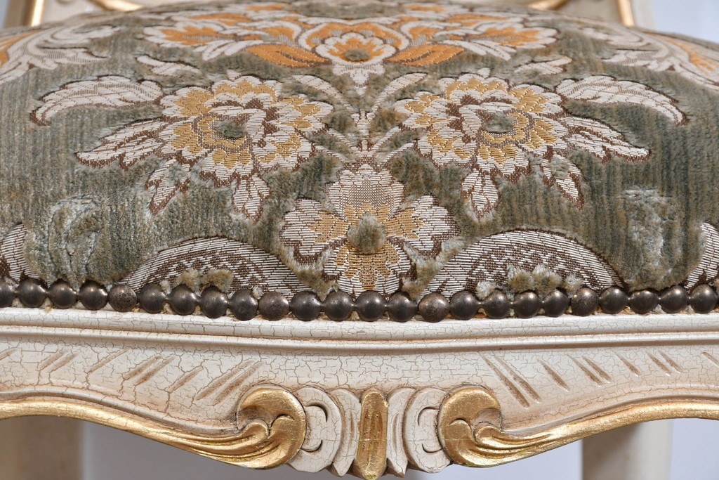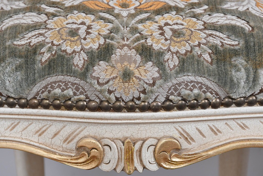 背もたれや座面には、花文様が織り込まれた上質な張地が張られています。柔らかな色合いがフレームのアンティークホワイトとよく馴染み、ヨーロピアンらしい気品を感じさせます。落ち着きのある輝きが空間を華やかに演出します。