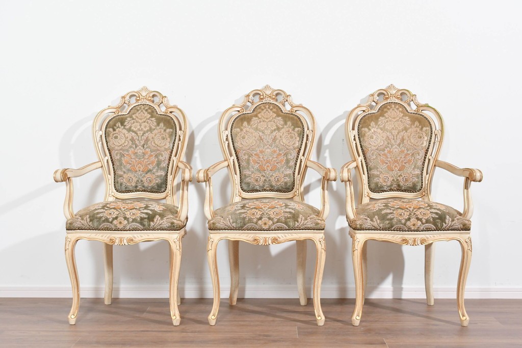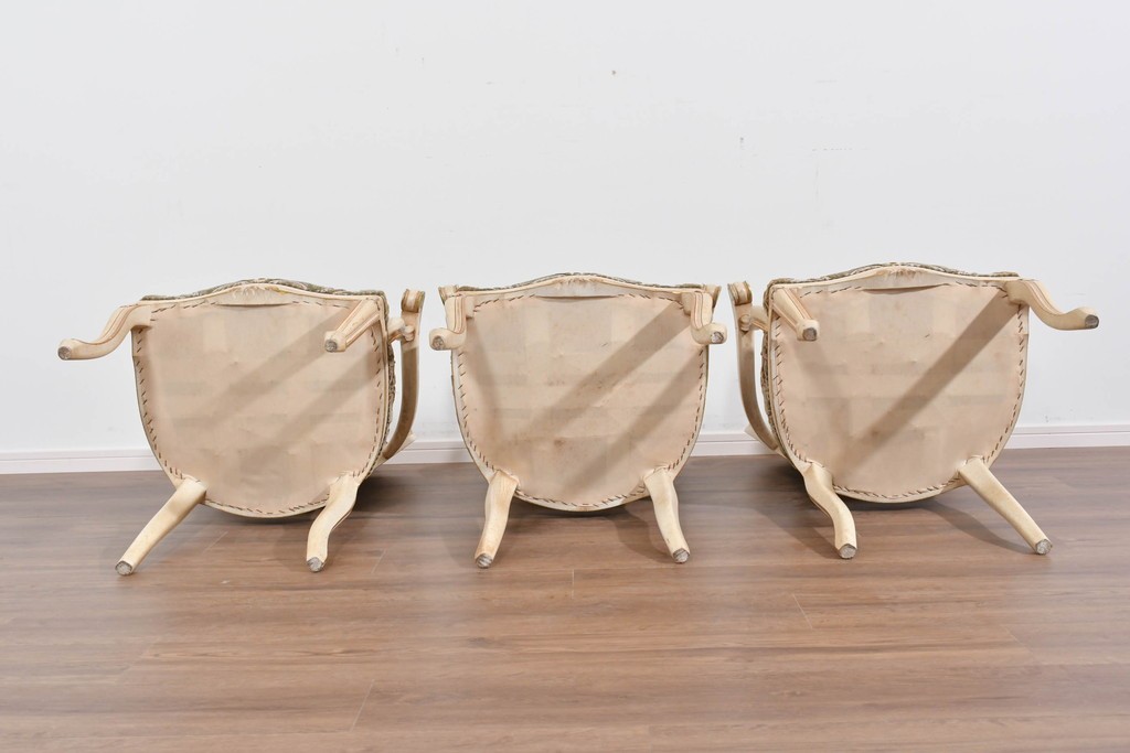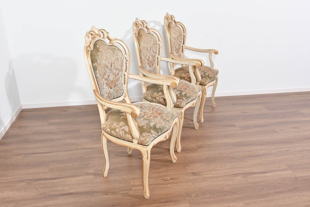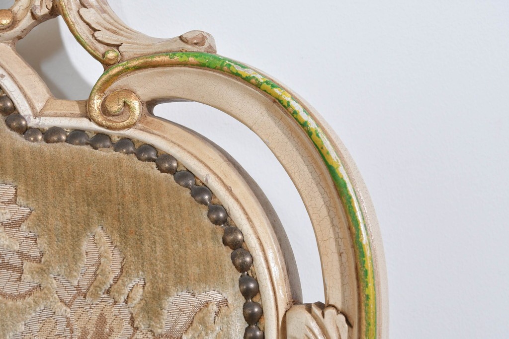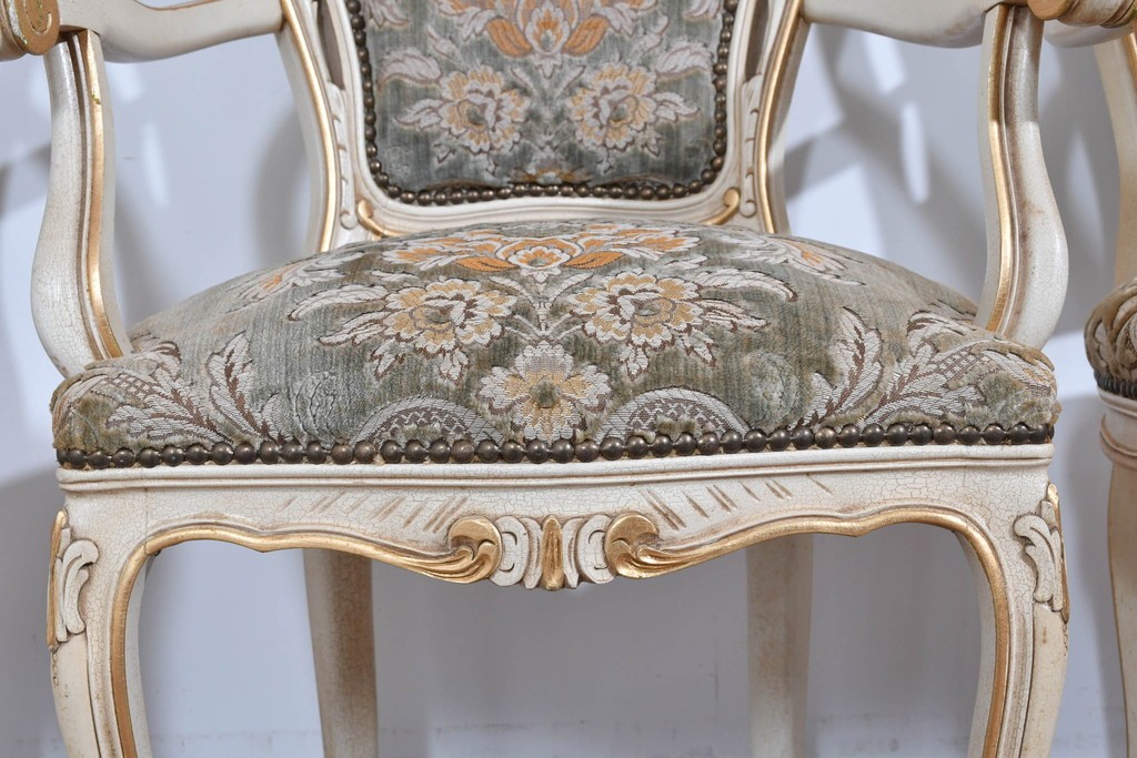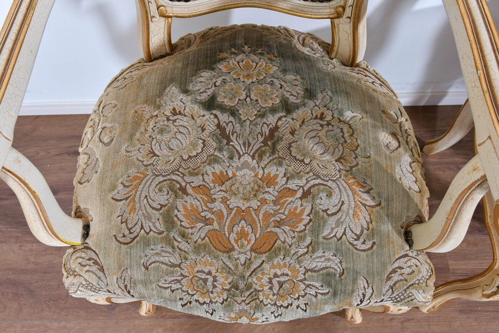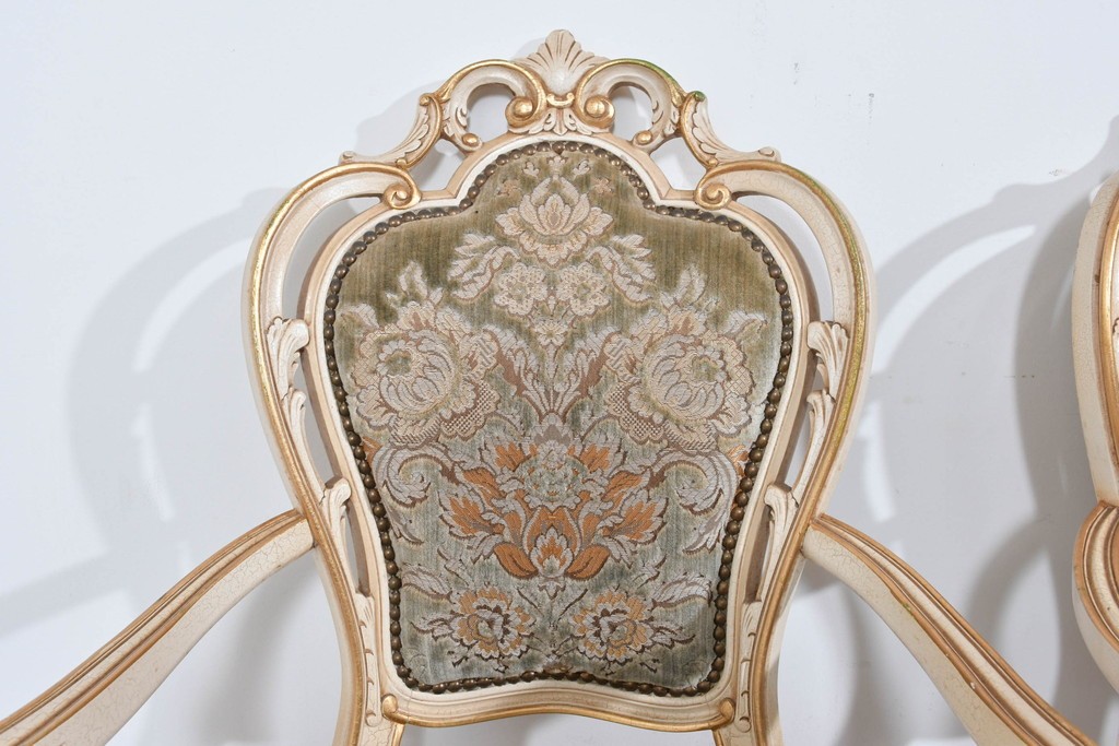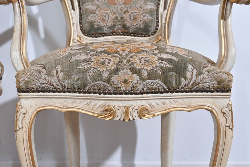 背もたれや座面には、花文様が織り込まれた上質な張地が張られています。柔らかな色合いがフレームのアンティークホワイトとよく馴染み、ヨーロピアンらしい気品を感じさせます。落ち着きのある輝きが空間を華やかに演出します。