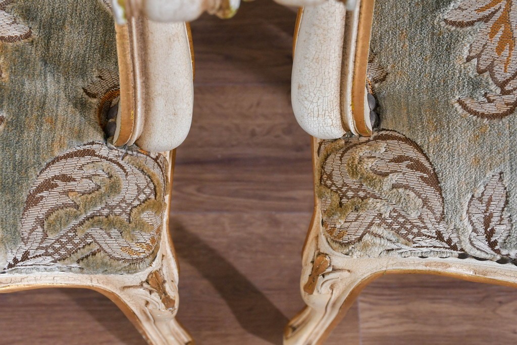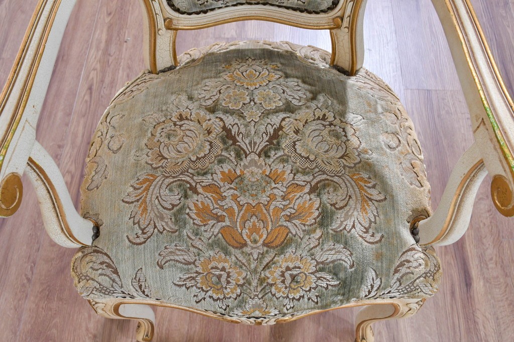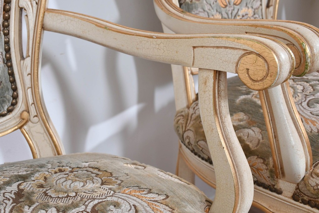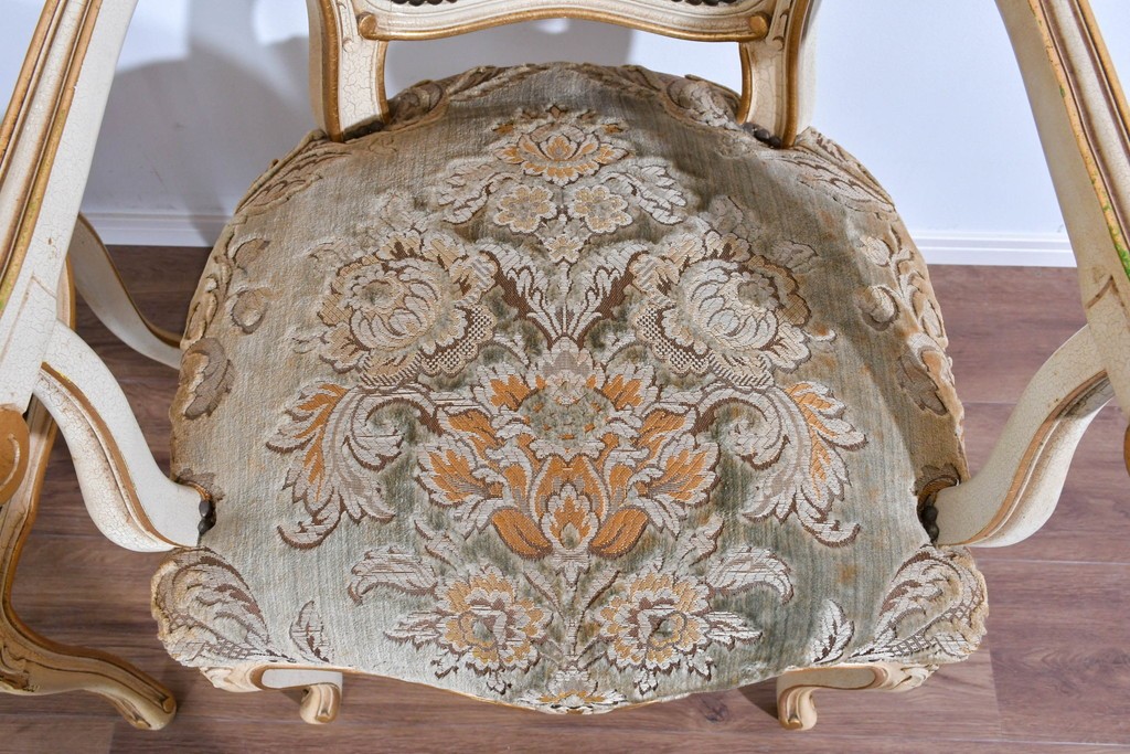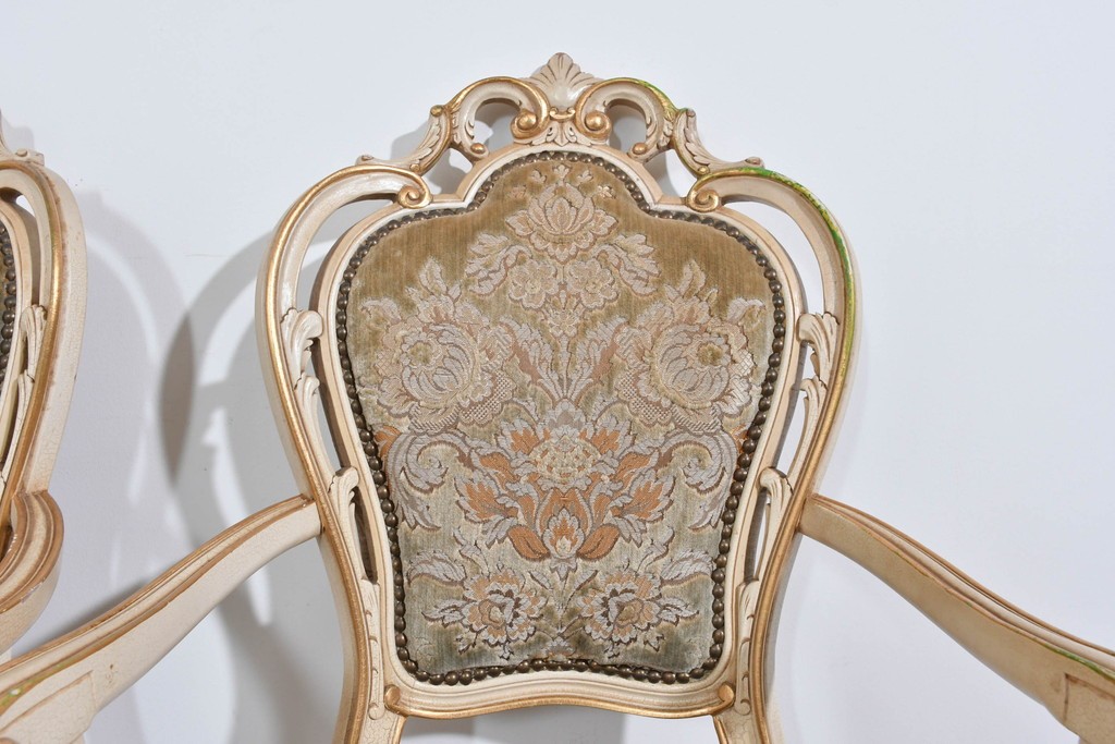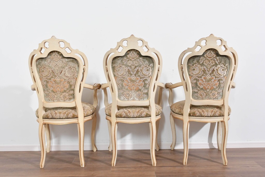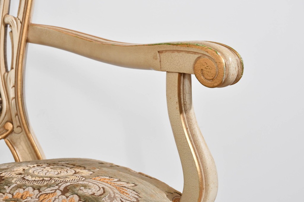 背もたれや座面には、花文様が織り込まれた上質な張地が張られています。柔らかな色合いがフレームのアンティークホワイトとよく馴染み、ヨーロピアンらしい気品を感じさせます。落ち着きのある輝きが空間を華やかに演出します。