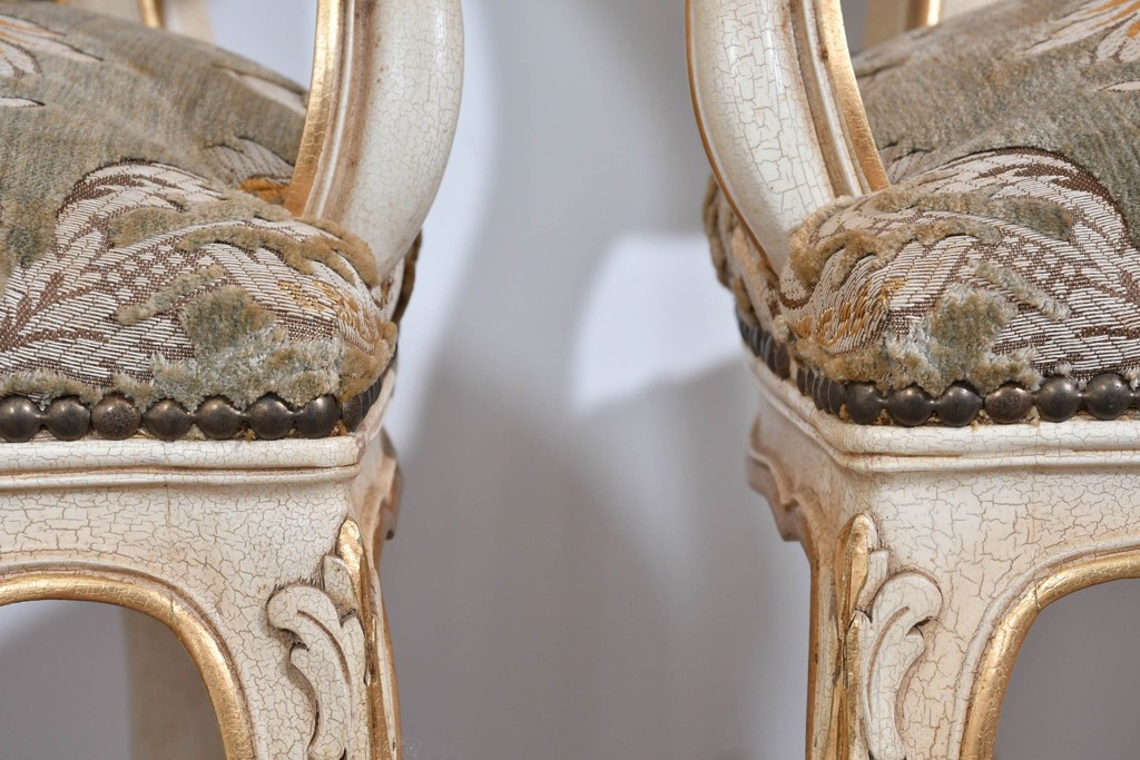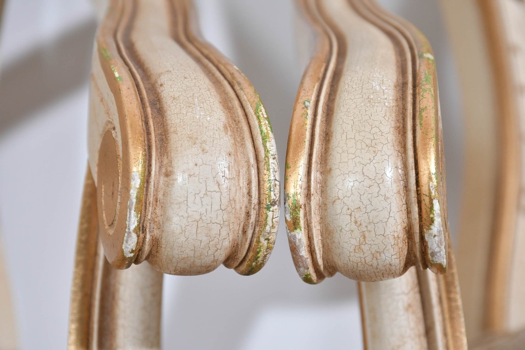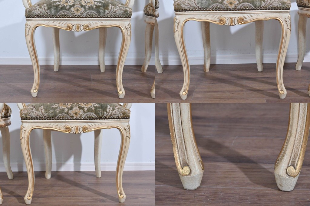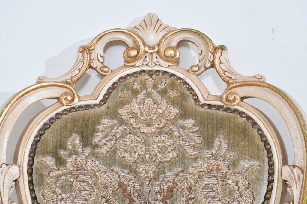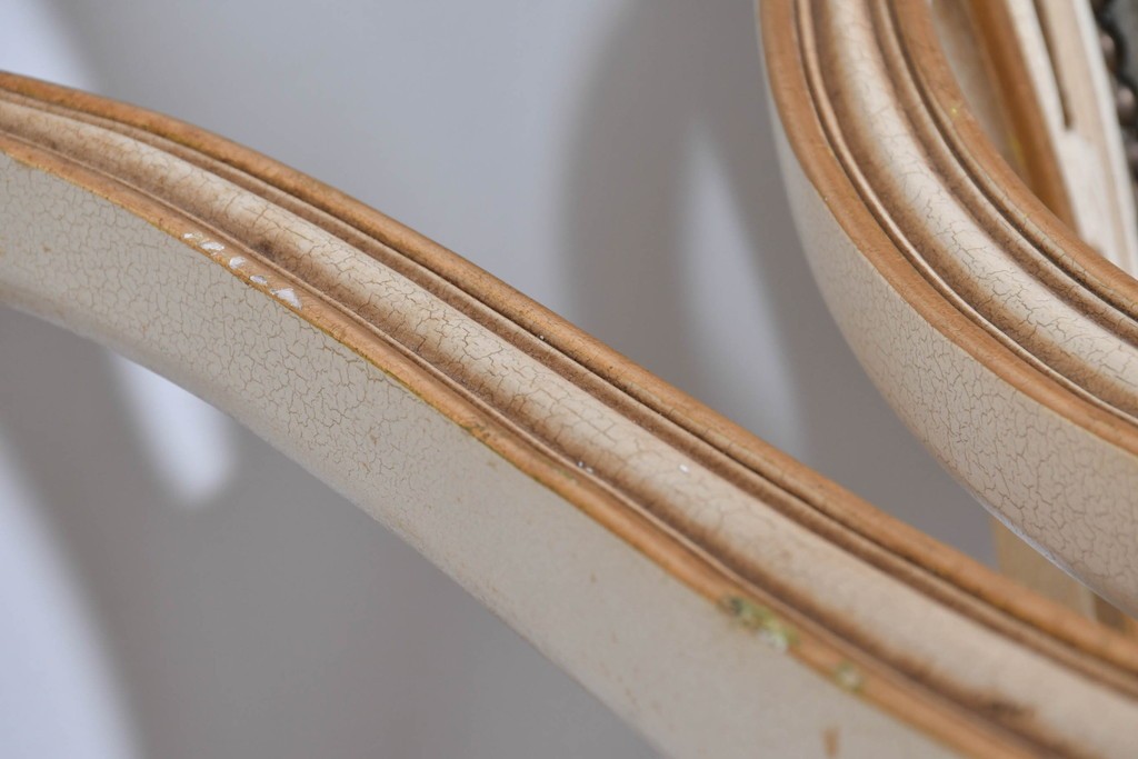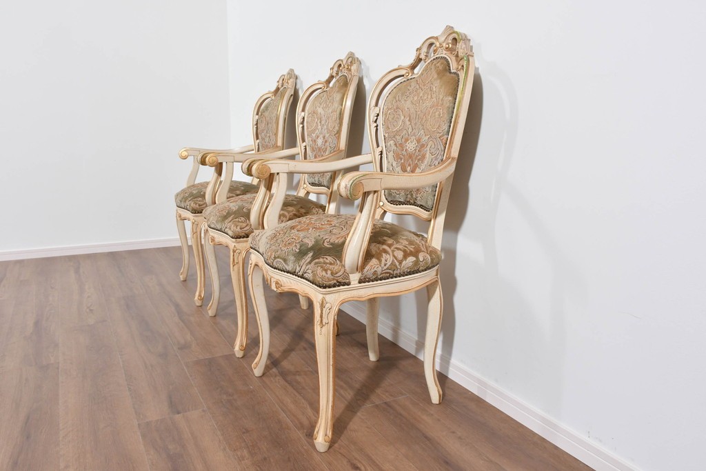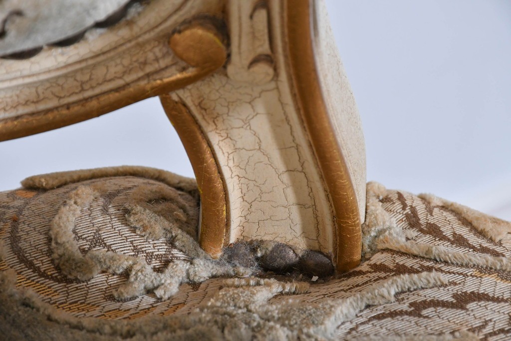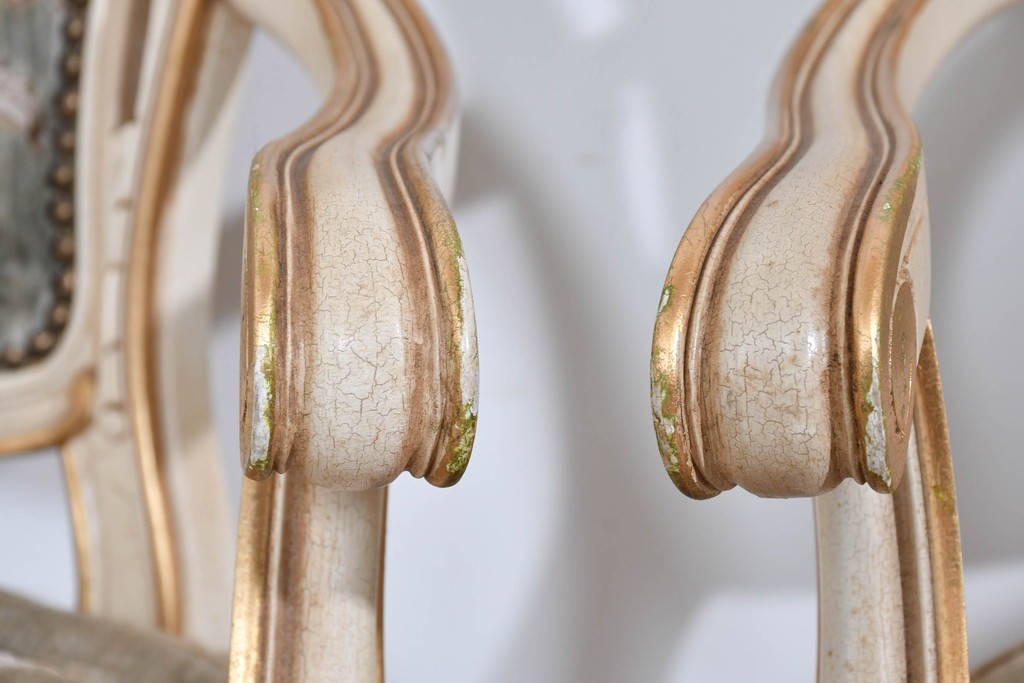背もたれや座面には、花文様が織り込まれた上質な張地が張られています。柔らかな色合いがフレームのアンティークホワイトとよく馴染み、ヨーロピアンらしい気品を感じさせます。落ち着きのある輝きが空間を華やかに演出します。