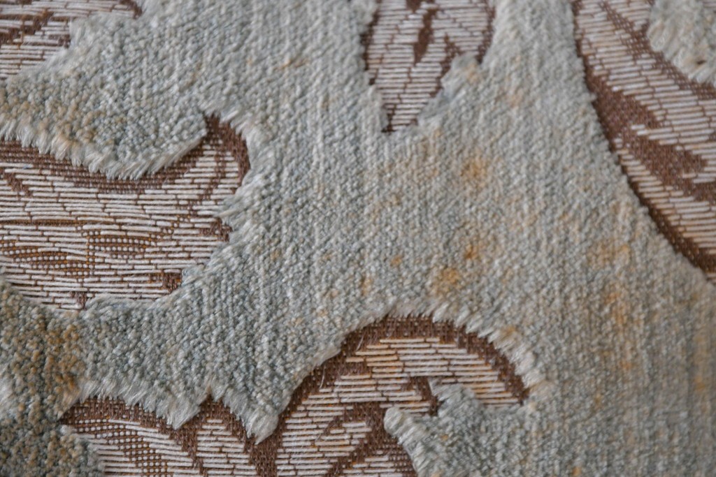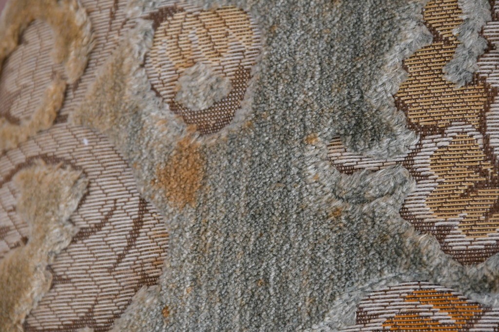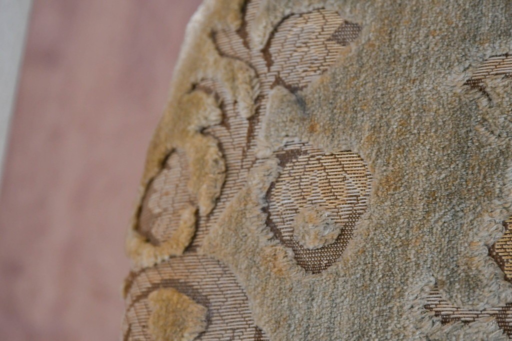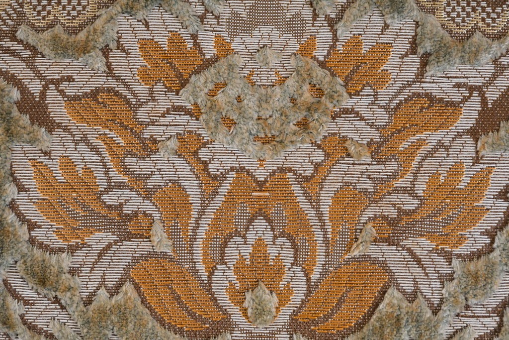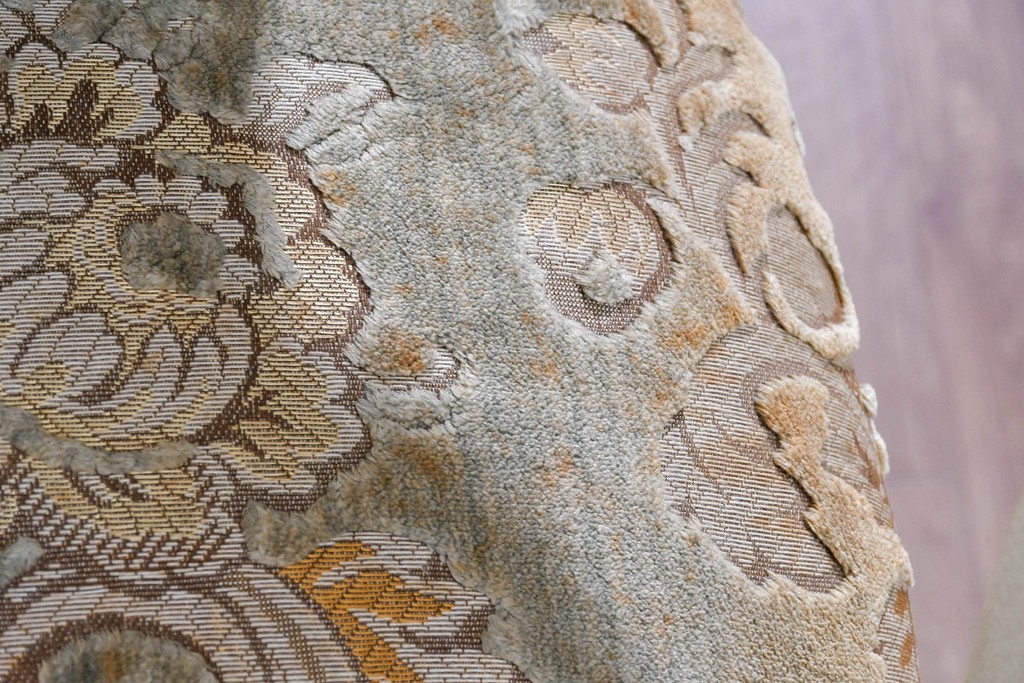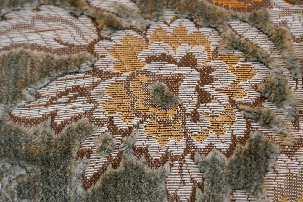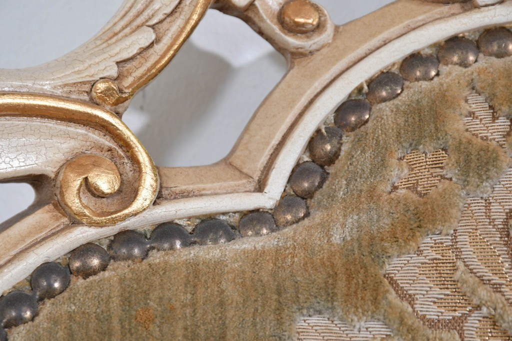 背もたれや座面には、花文様が織り込まれた上質な張地が張られています。柔らかな色合いがフレームのアンティークホワイトとよく馴染み、ヨーロピアンらしい気品を感じさせます。落ち着きのある輝きが空間を華やかに演出します。