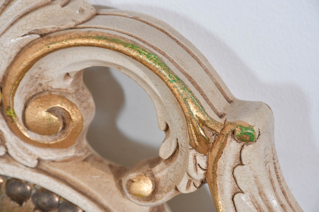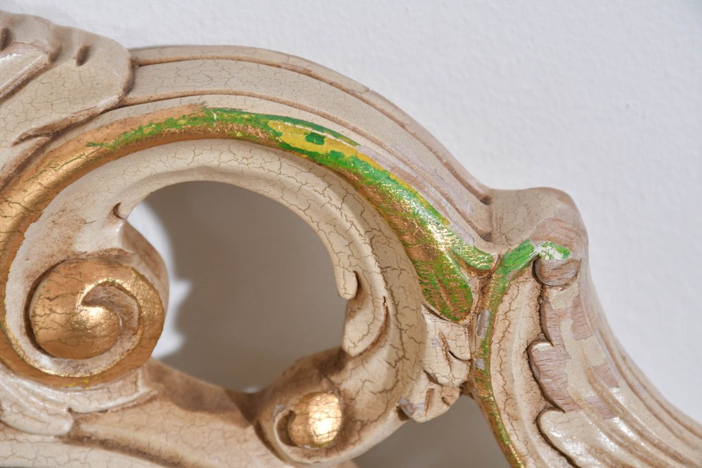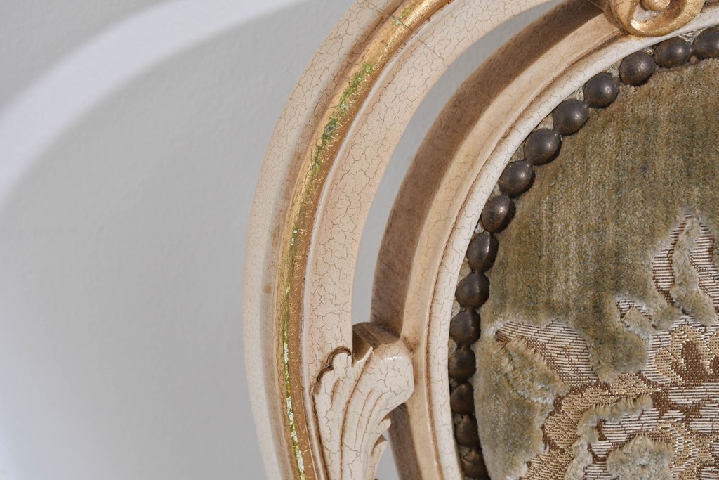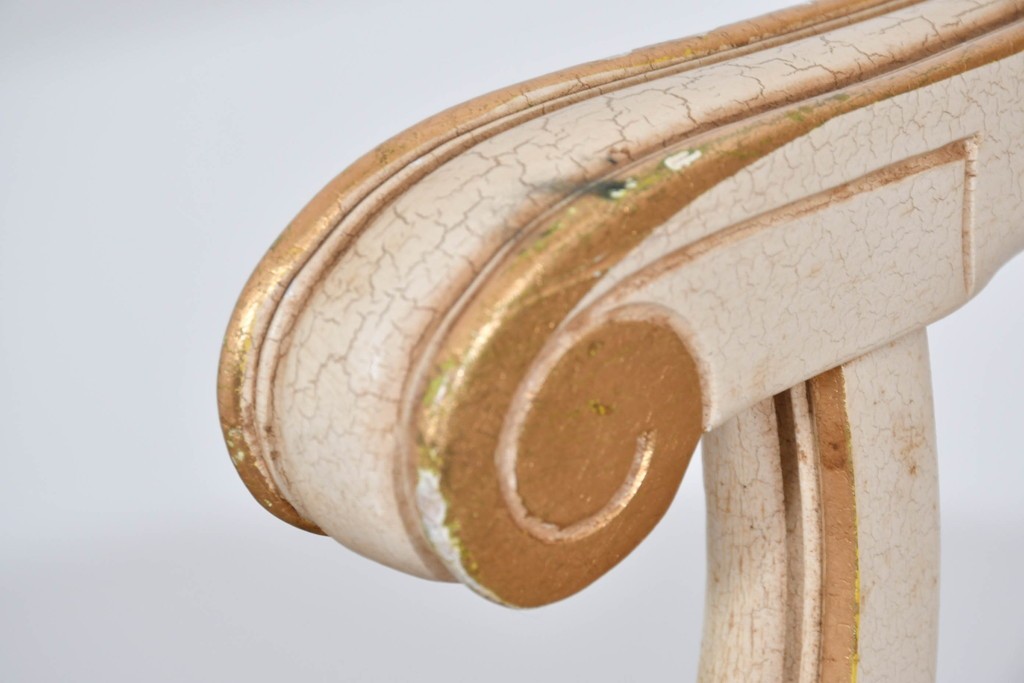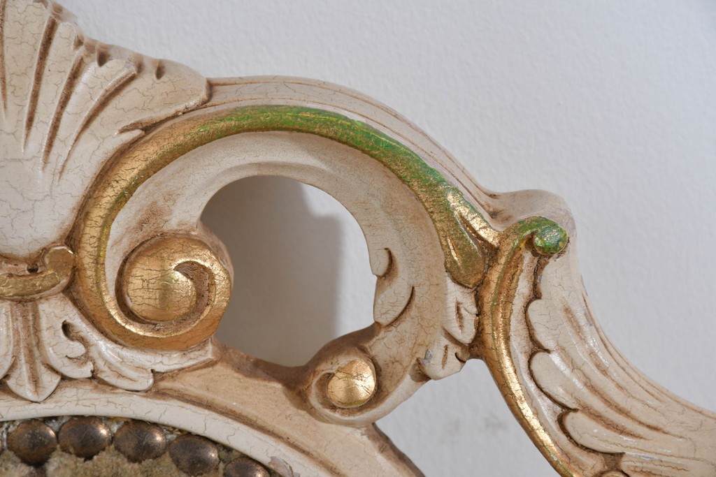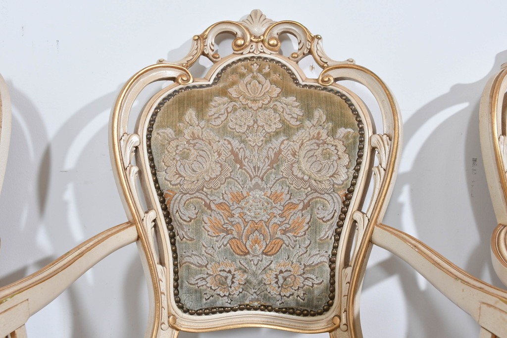 背からアーム、脚元まで丁寧に施された装飾が、イタリア家具らしい格調高さを感じさせます。彫刻のひとつひとつが滑らかな曲線を描き、光を受けて柔らかく陰影を生むことで、豊かな表情を楽しめる点が魅力です。