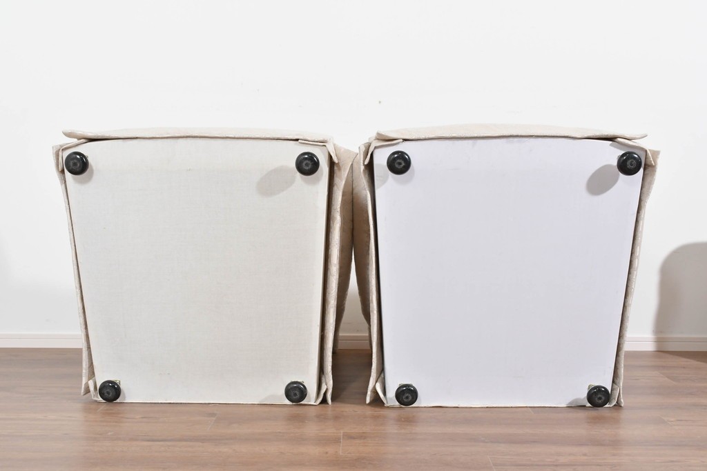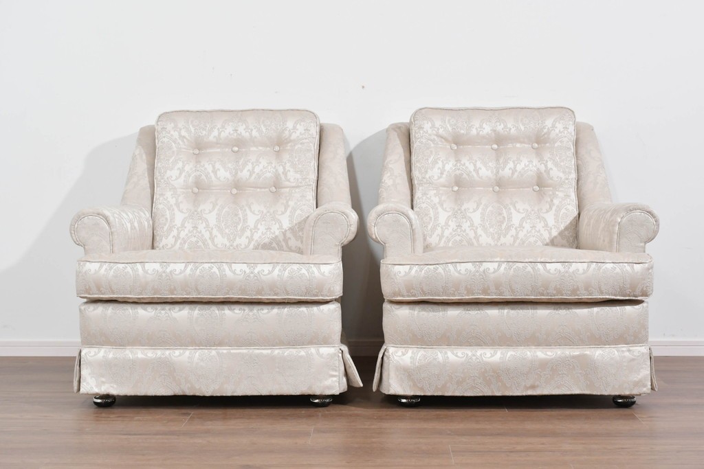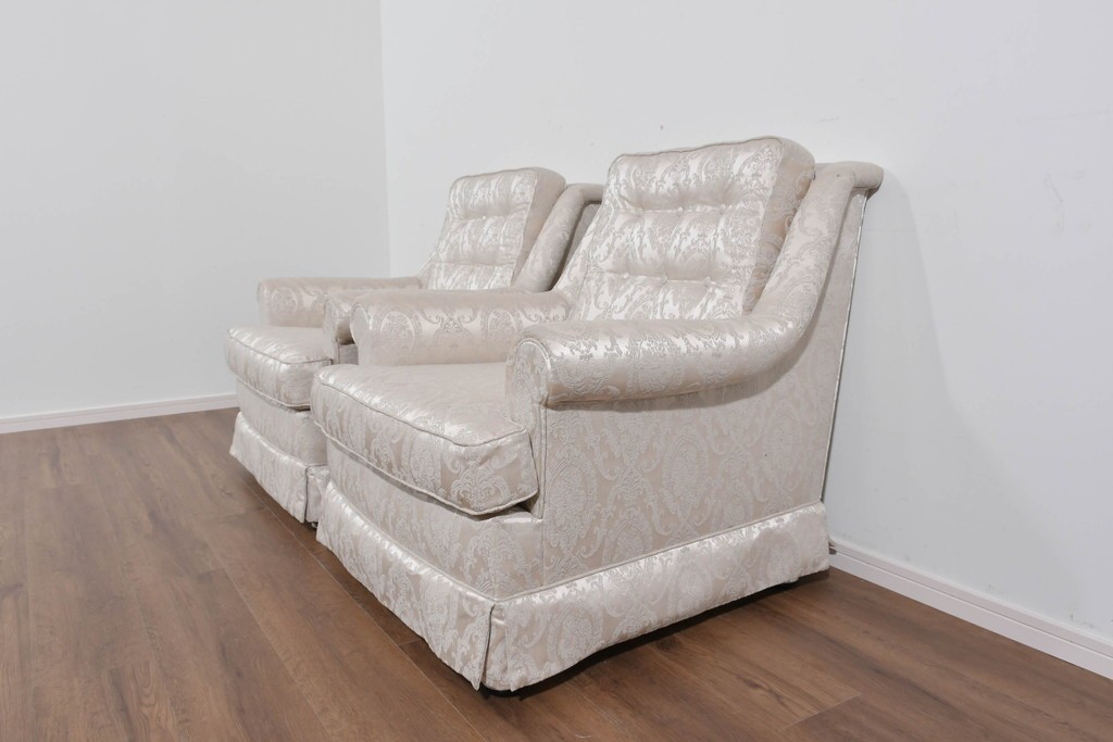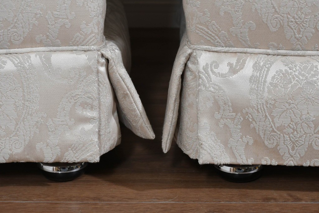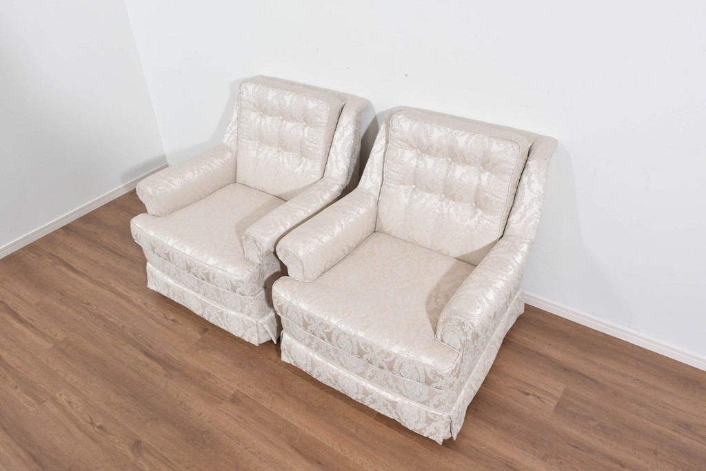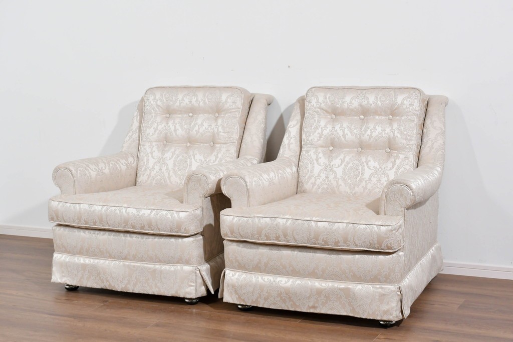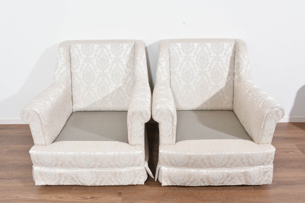 光沢を帯びた織模様の生地を用いた、上品な雰囲気の一人掛けソファ2脚です。