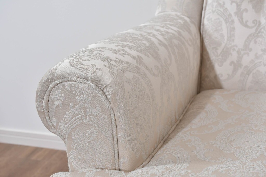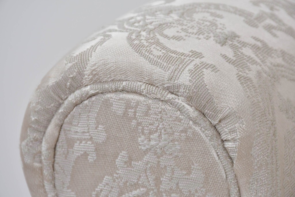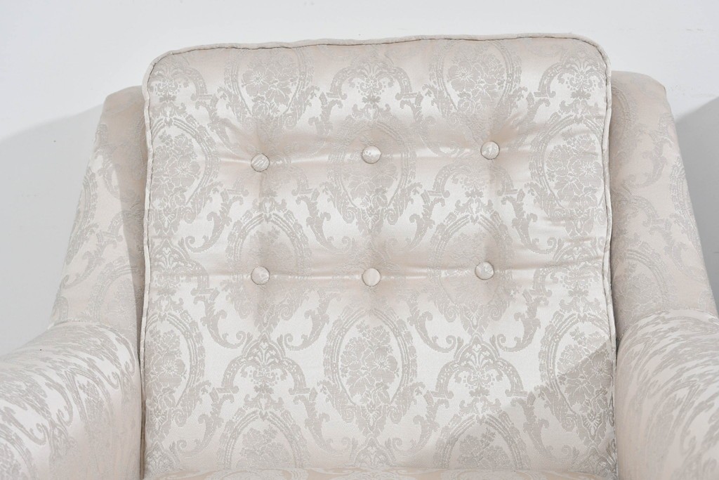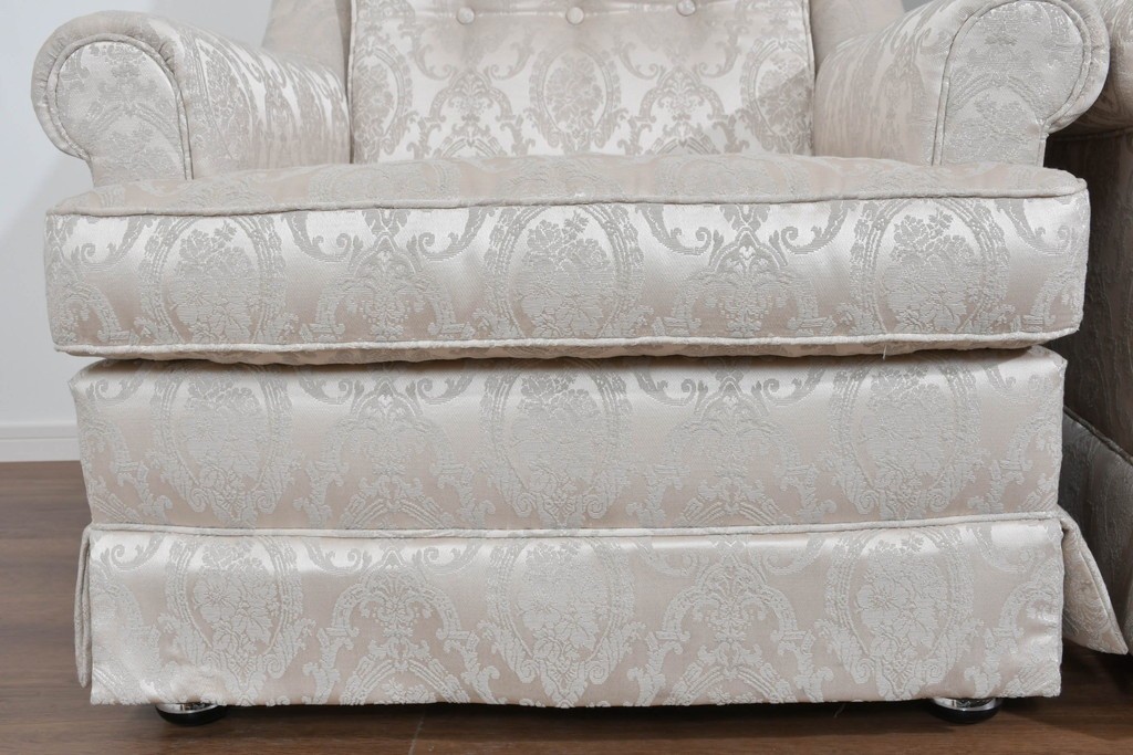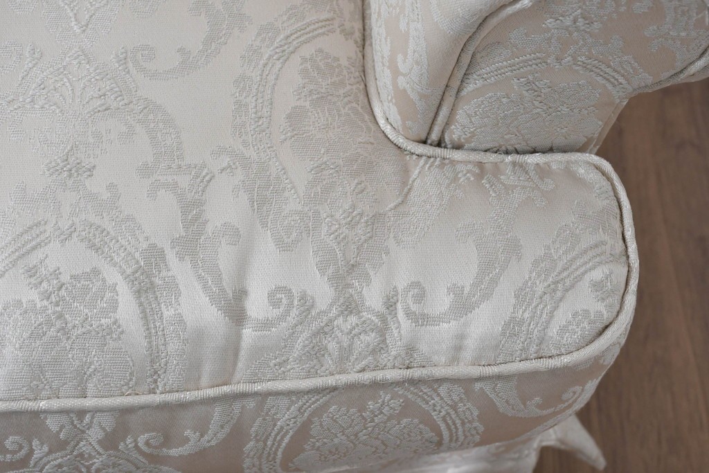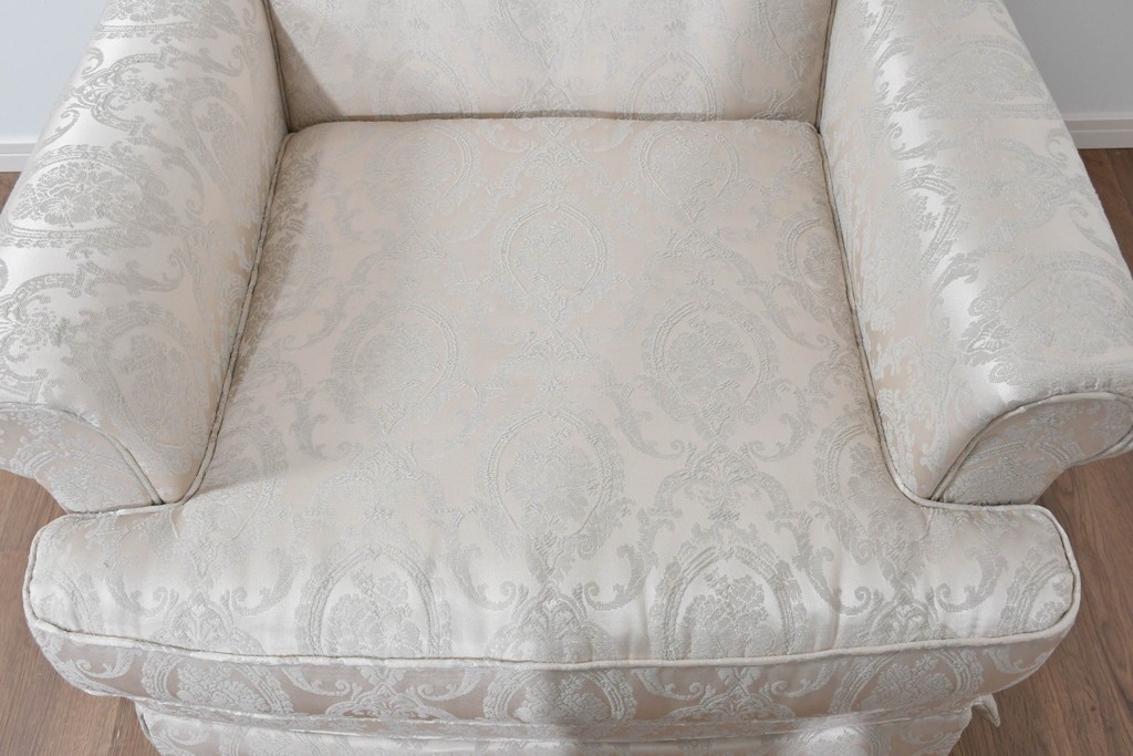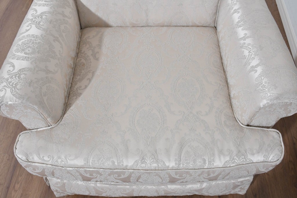 光沢を帯びた織模様の生地を用いた、上品な雰囲気の一人掛けソファ2脚です。