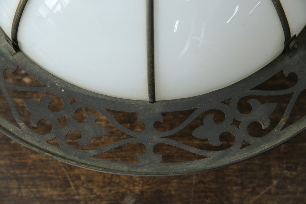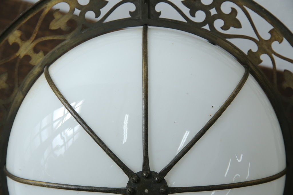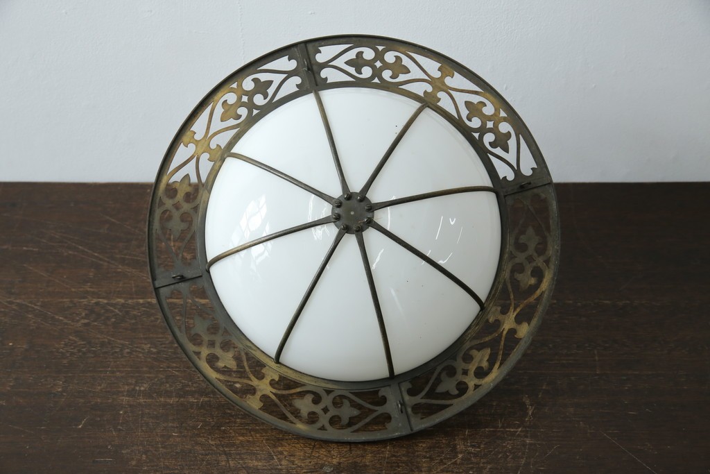 白いガラスシェードの柔らかな丸みと、周囲を囲む真鍮製の飾り枠が調和し、上品で華やかな雰囲気を演出します。