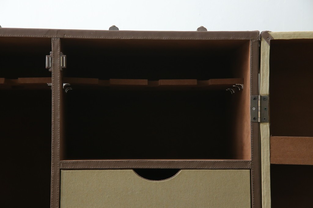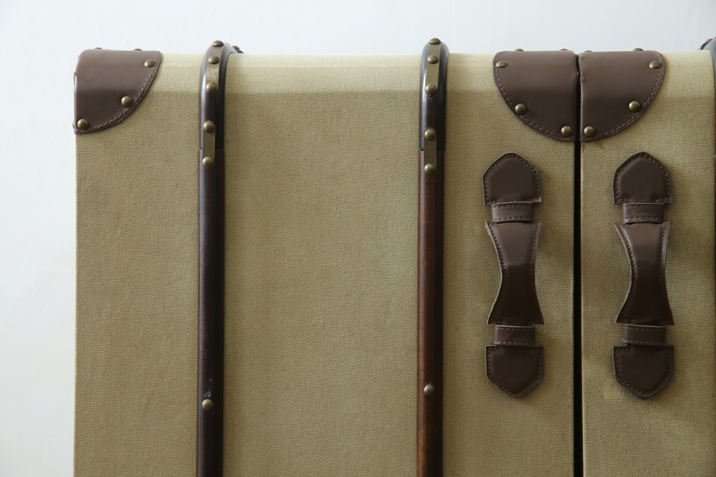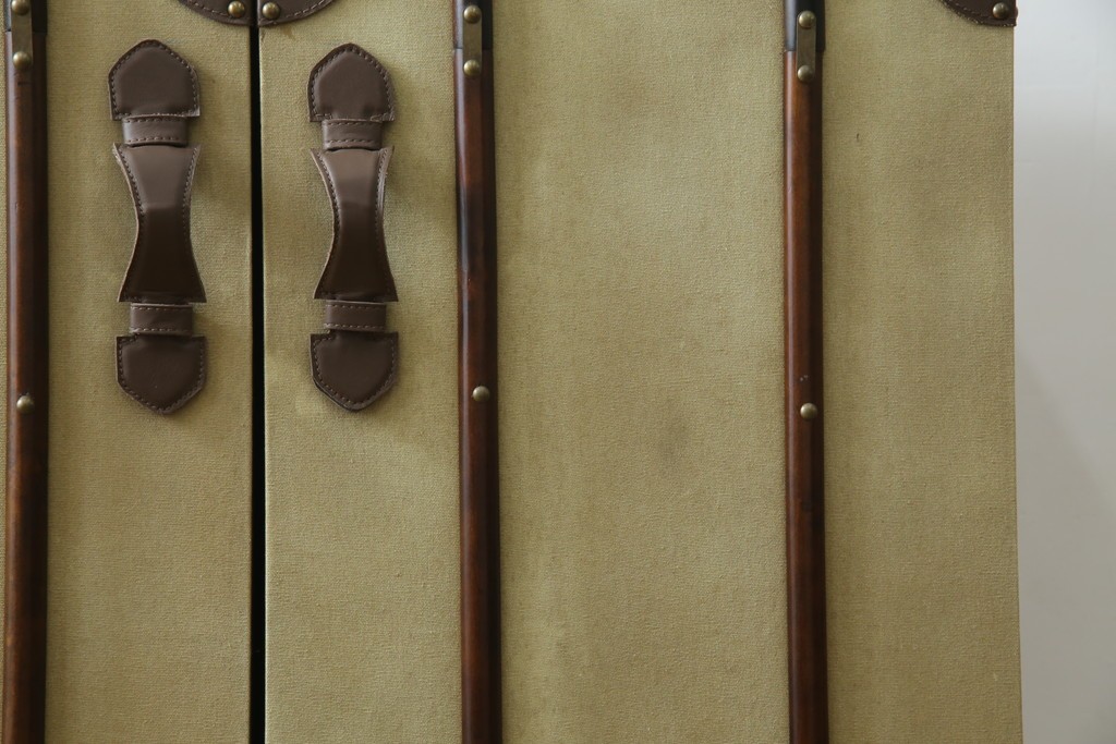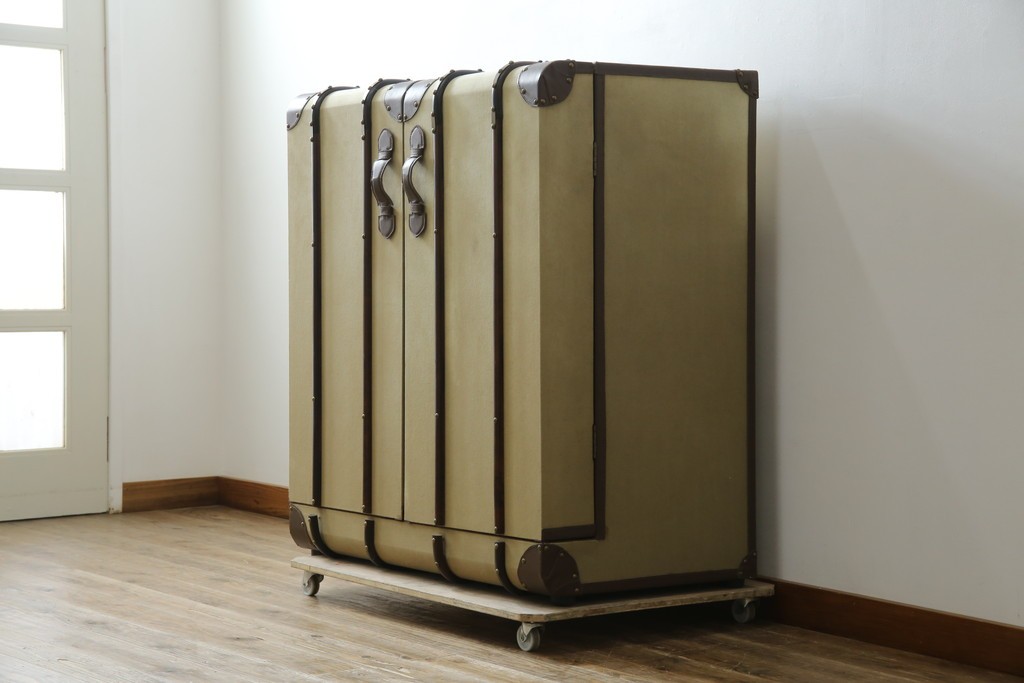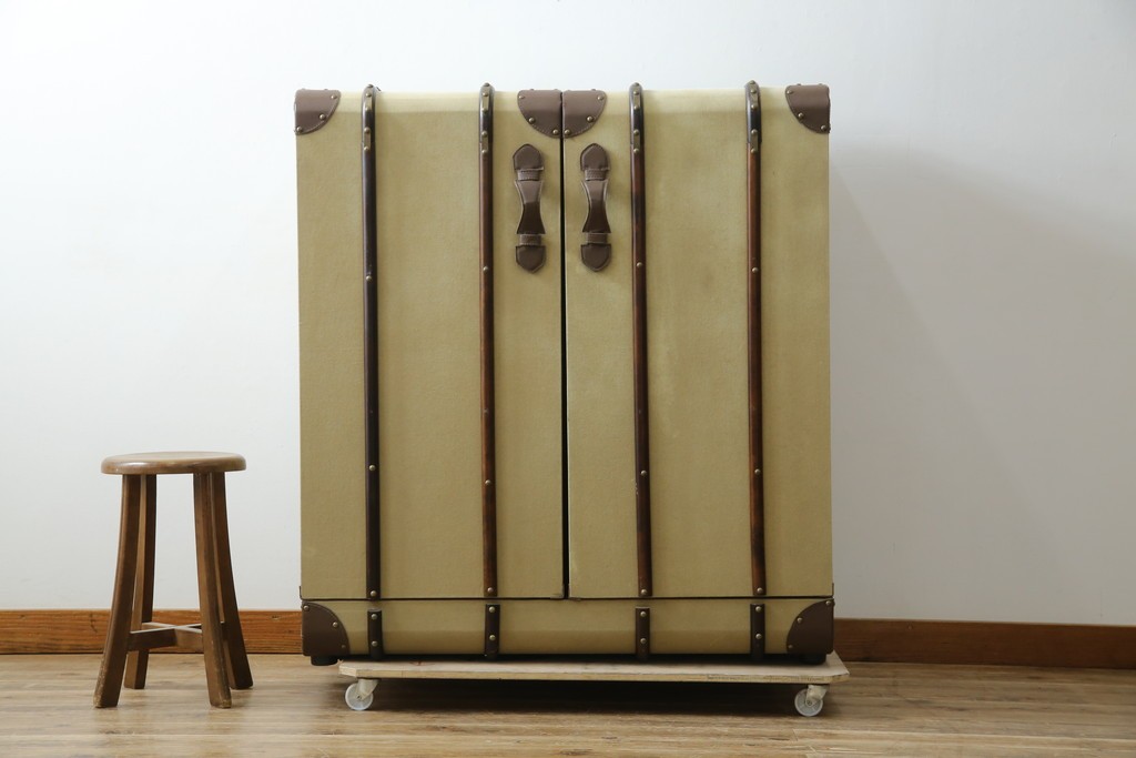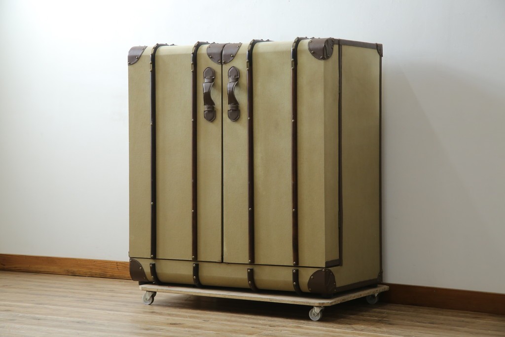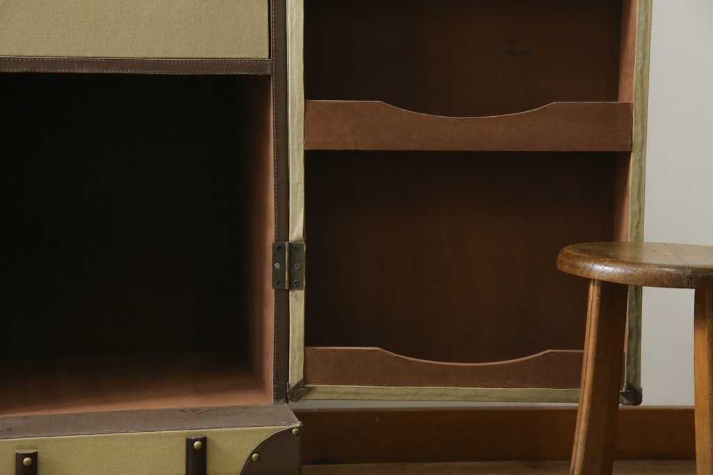 まるで大型トラベルケースのような存在感が魅力のキャビネットです。布張りの本体をぐるりと囲むレザーパーツや真鍮調のスタッズがアクセントとなり、ヴィンテージらしい深みのある個性を演出しています。空間に置くだけでストーリーを感じさせる一台です。