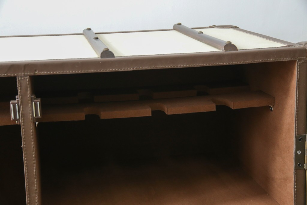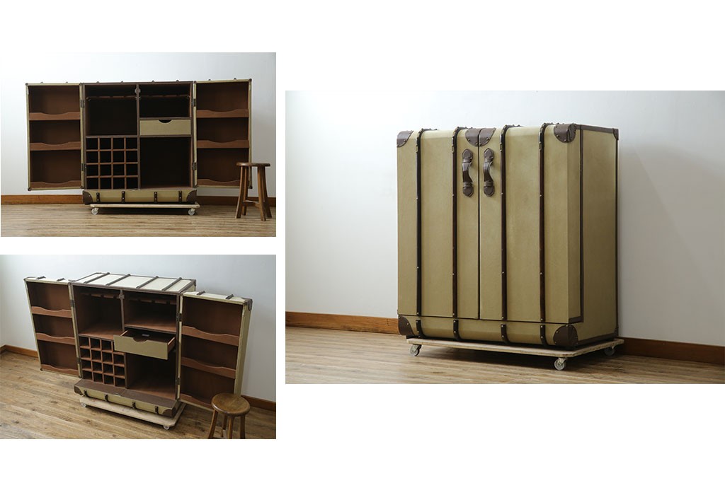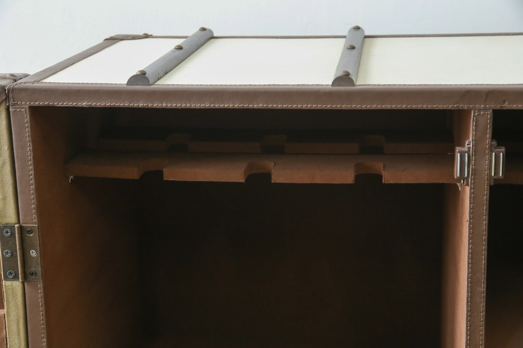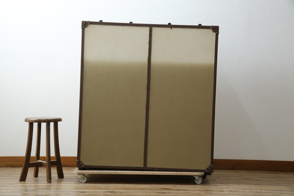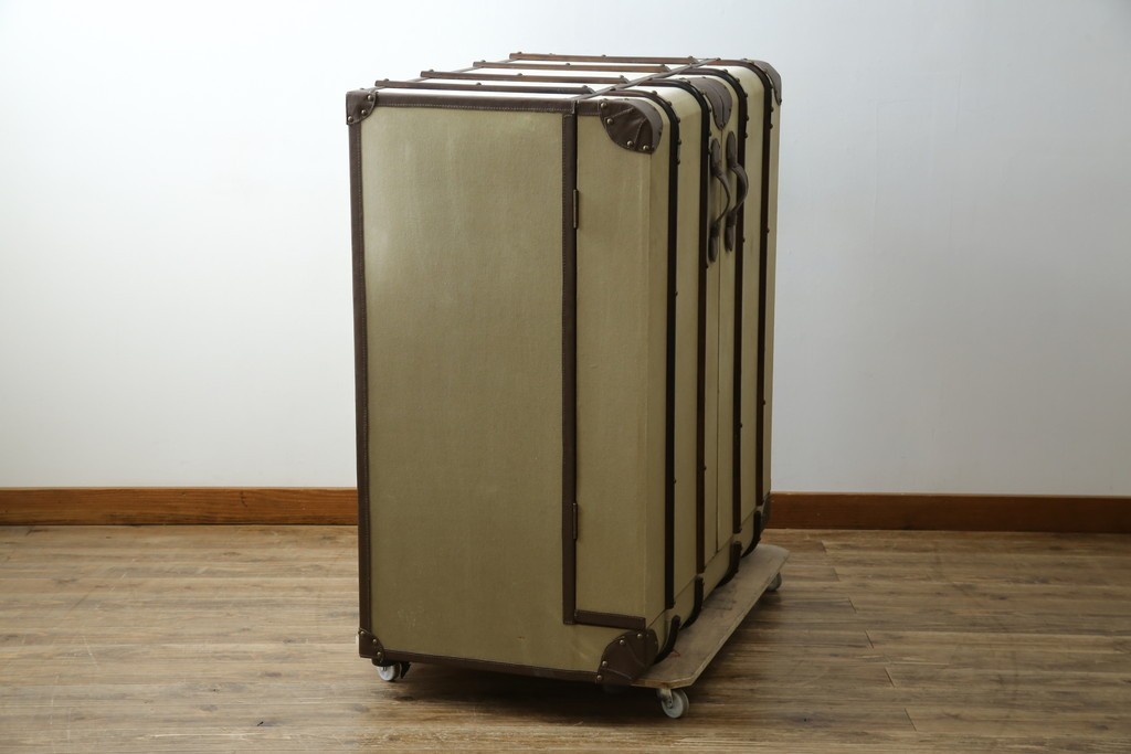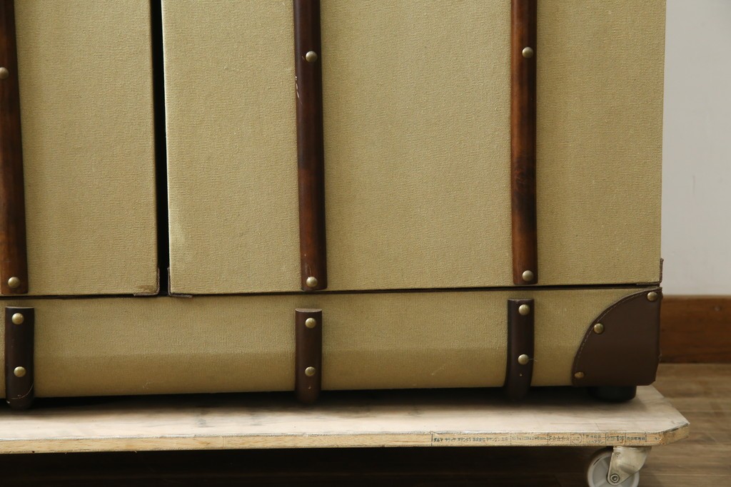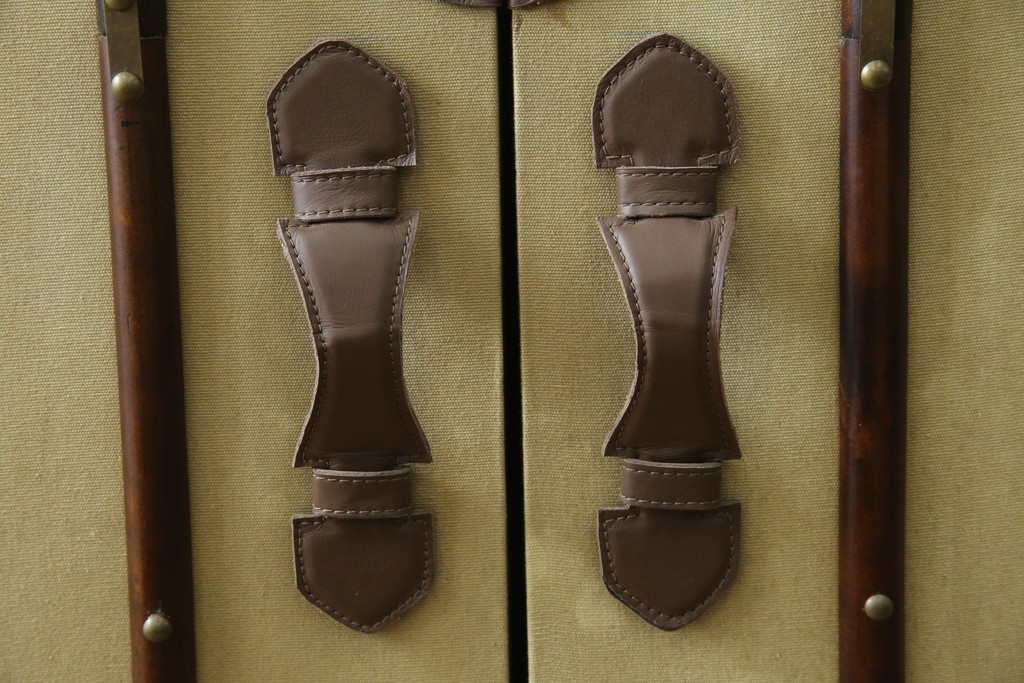 まるで大型トラベルケースのような存在感が魅力のキャビネットです。布張りの本体をぐるりと囲むレザーパーツや真鍮調のスタッズがアクセントとなり、ヴィンテージらしい深みのある個性を演出しています。空間に置くだけでストーリーを感じさせる一台です。