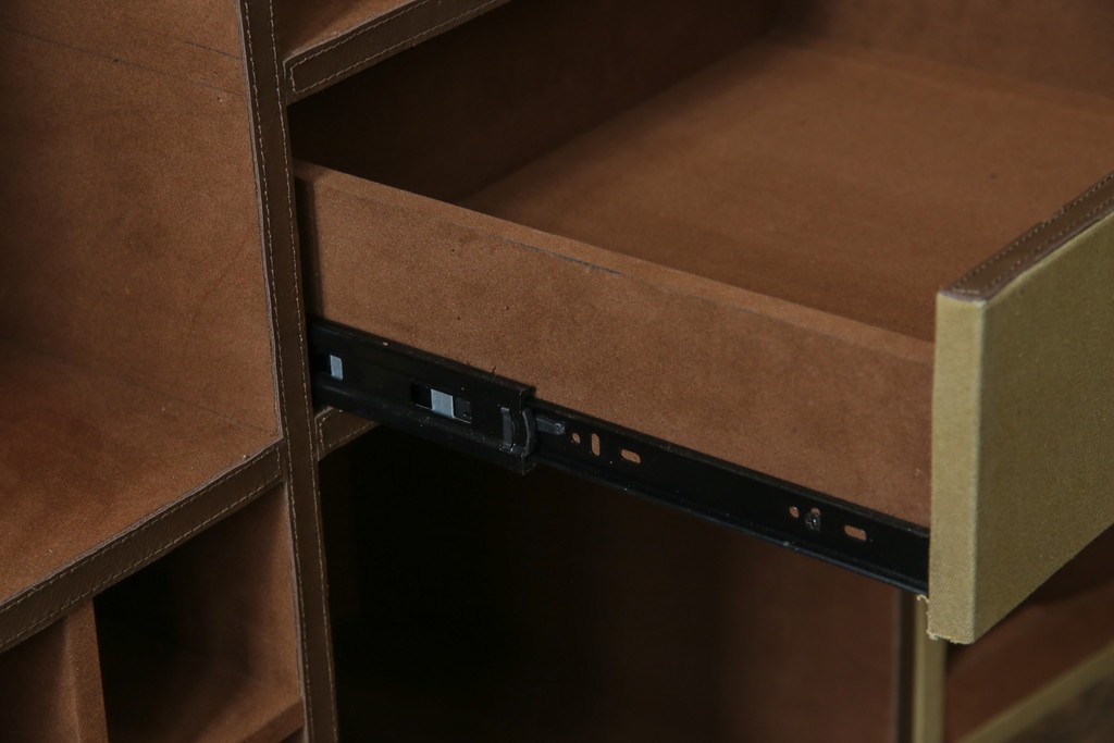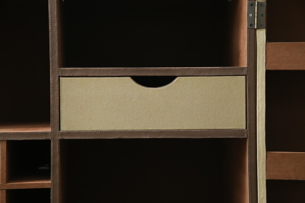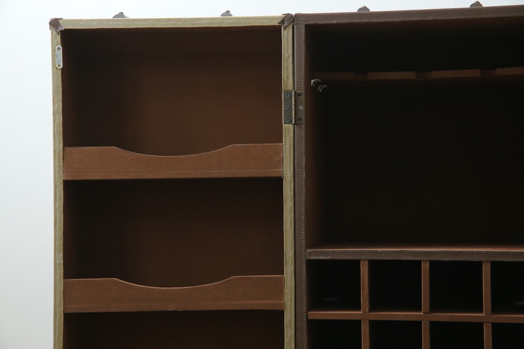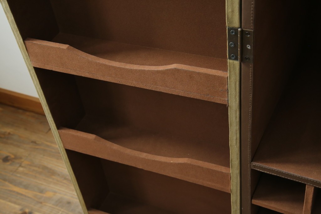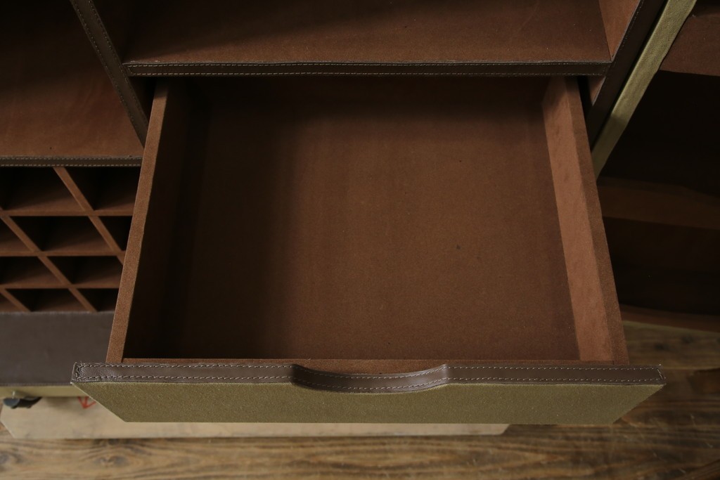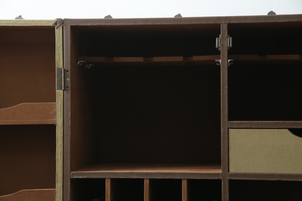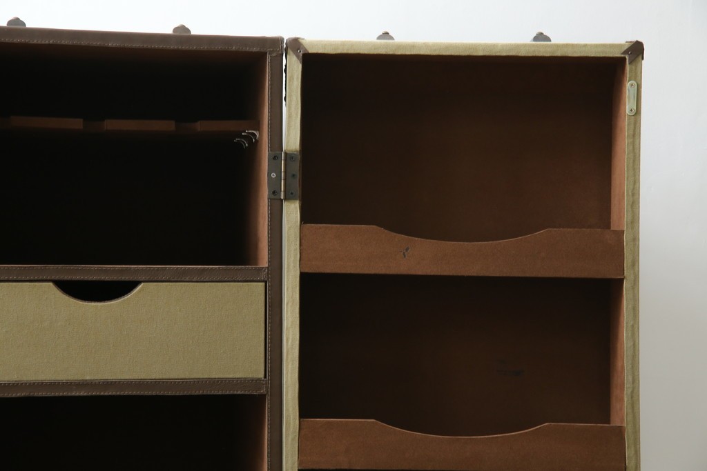 まるで大型トラベルケースのような存在感が魅力のキャビネットです。布張りの本体をぐるりと囲むレザーパーツや真鍮調のスタッズがアクセントとなり、ヴィンテージらしい深みのある個性を演出しています。空間に置くだけでストーリーを感じさせる一台です。