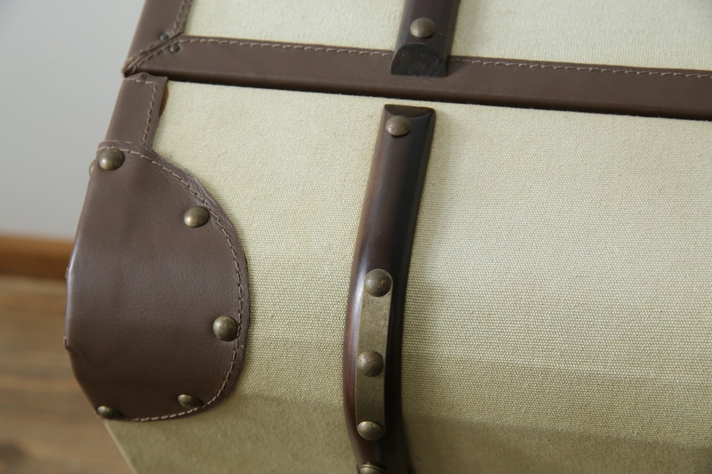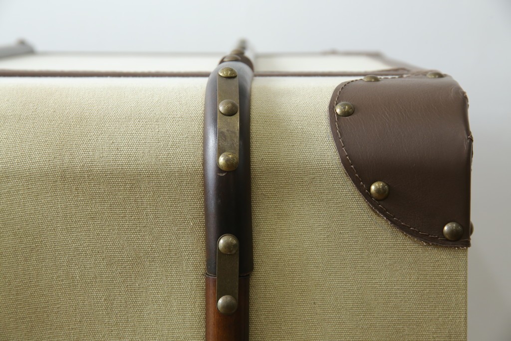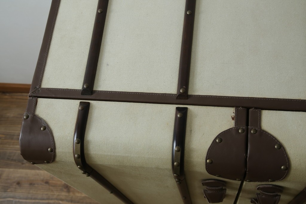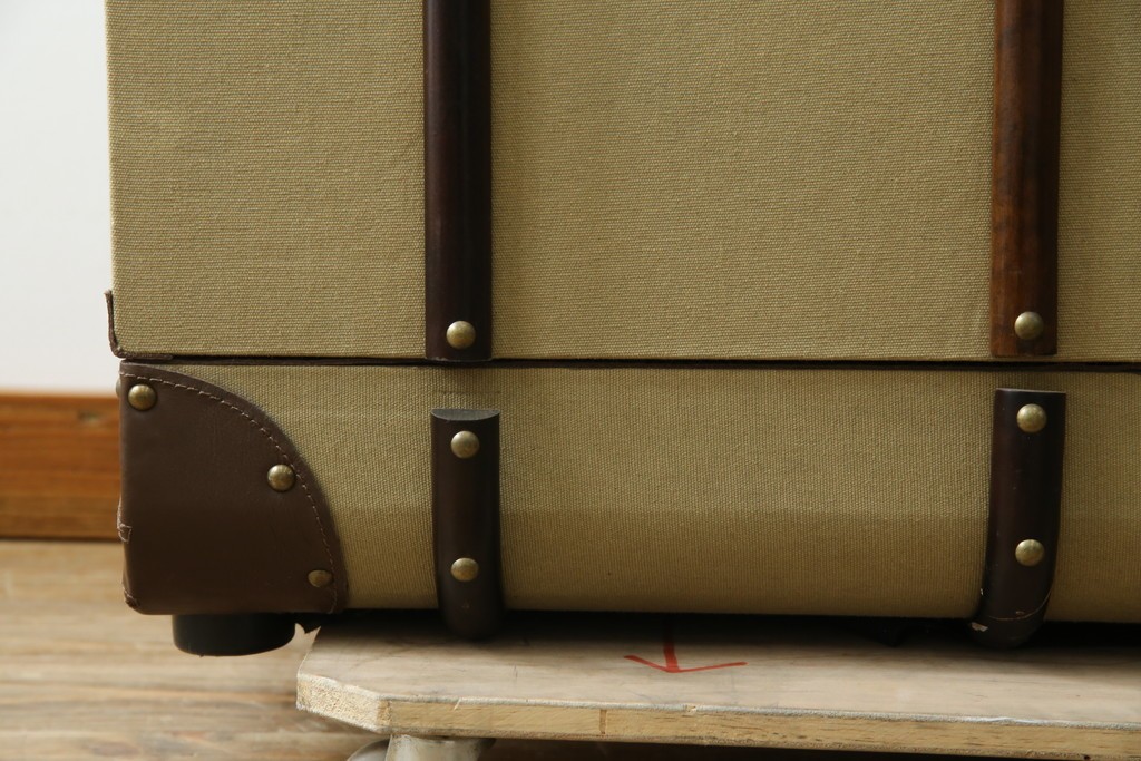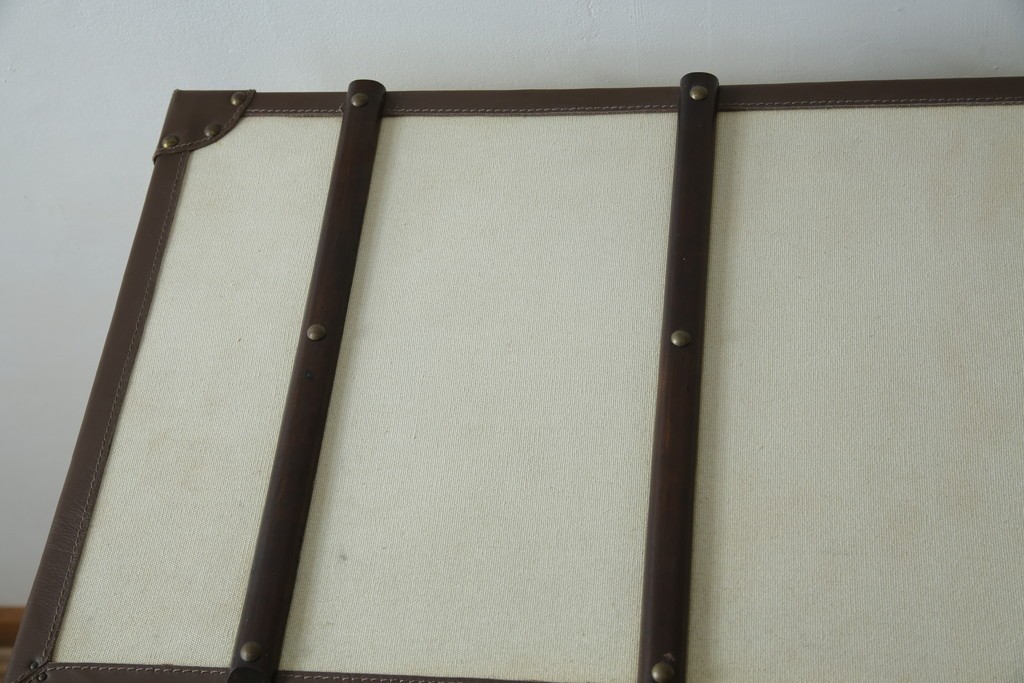 キャンバス地のような布張りに、レザー調の補強・木調フレームを組み合わせた構成は、アメリカヴィンテージならではの味わいを感じさせます。スタッズ打ちや角の補強など、手仕事の良さが伝わるディテールが随所に見られ、長く愛用したくなる存在感です。