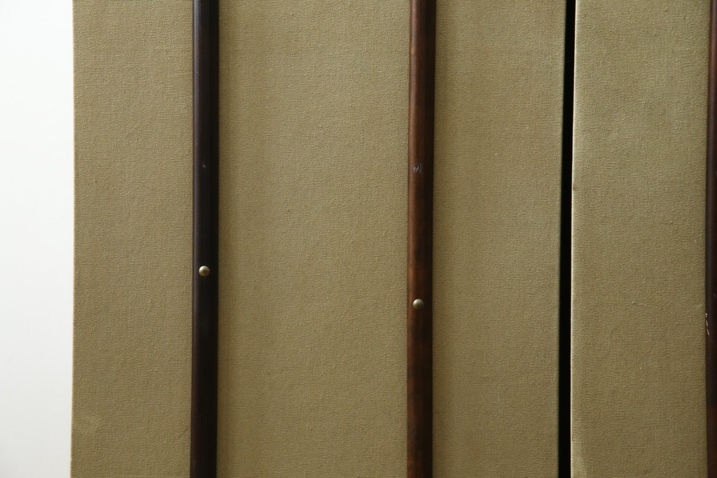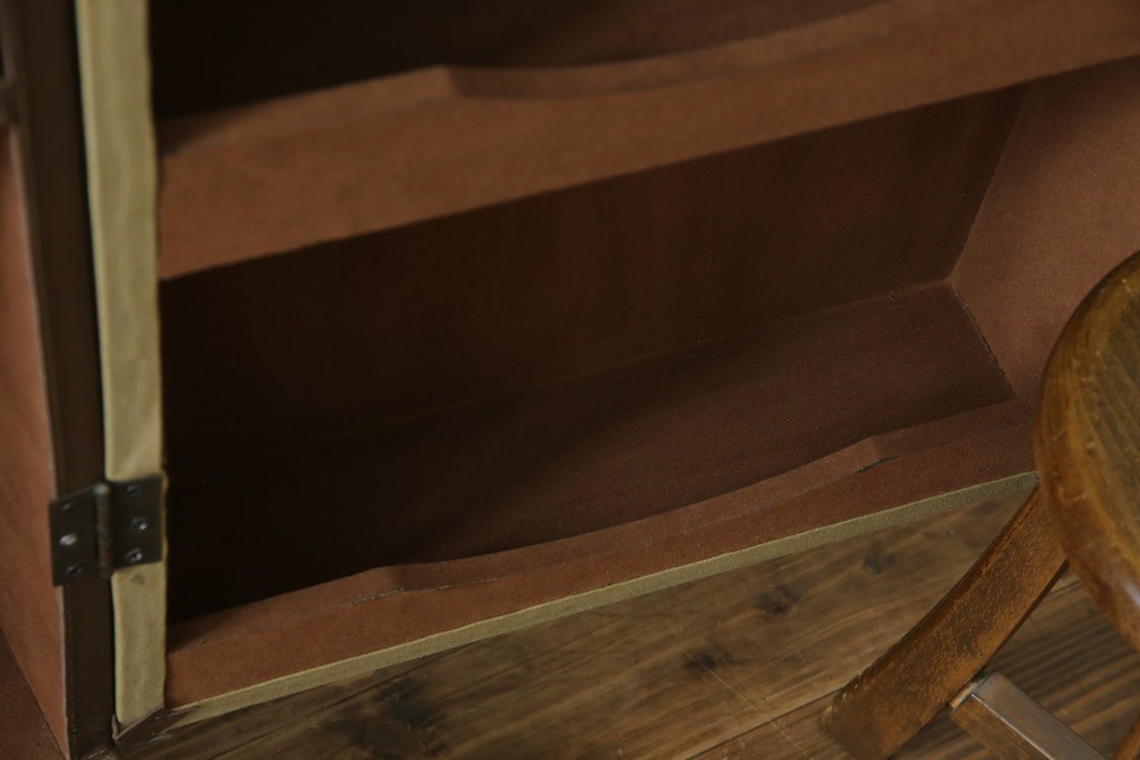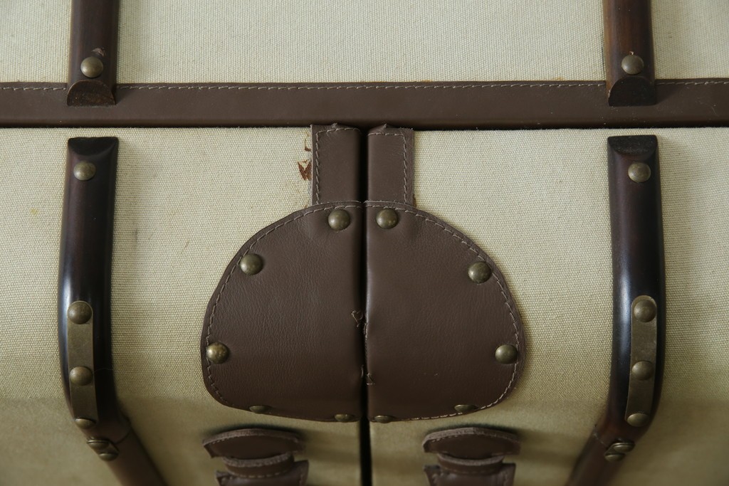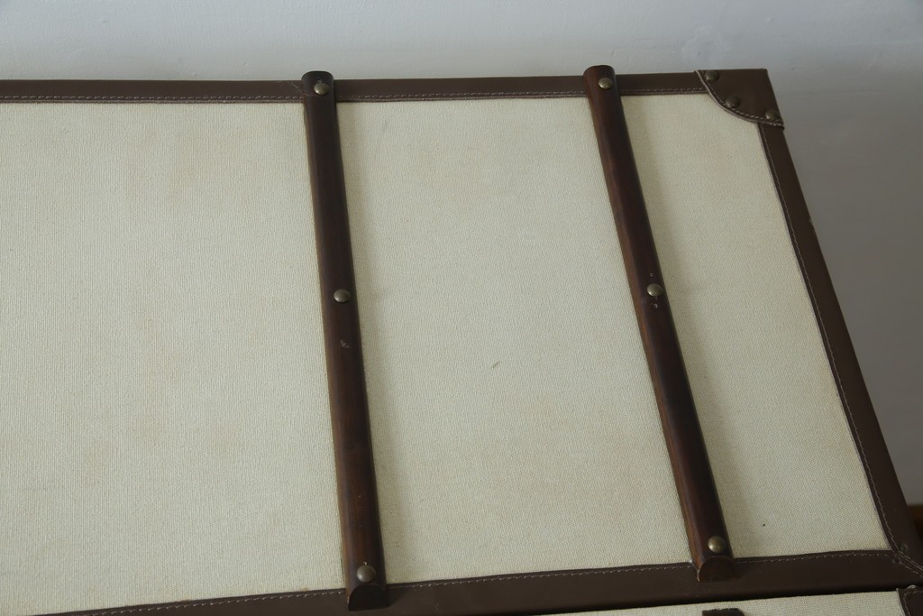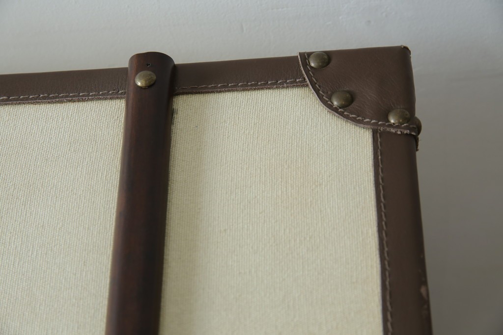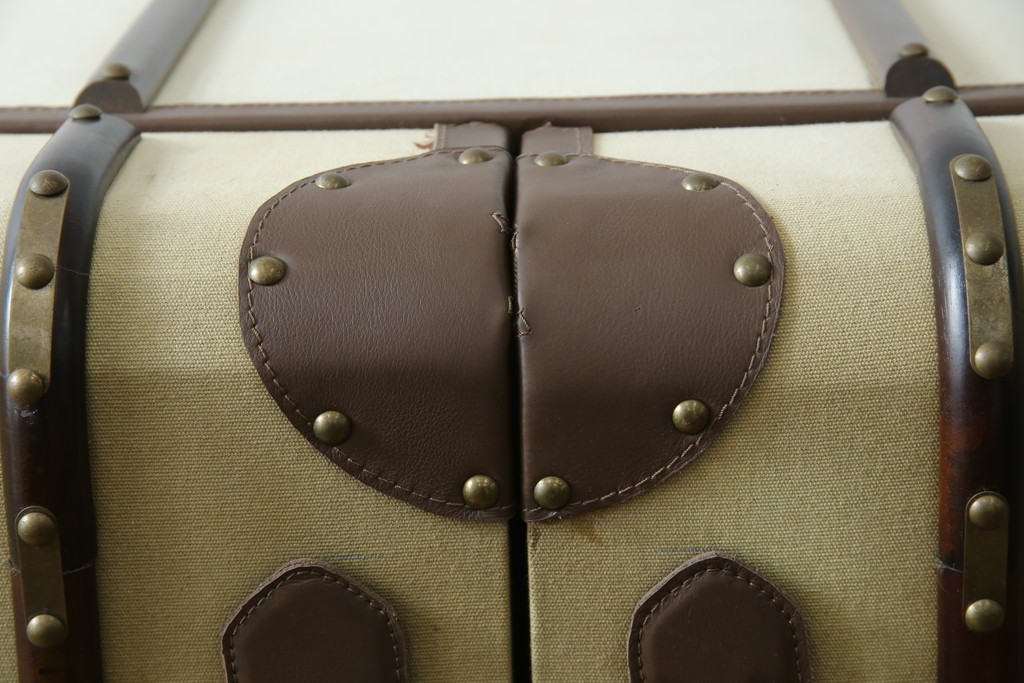 キャンバス地のような布張りに、レザー調の補強・木調フレームを組み合わせた構成は、アメリカヴィンテージならではの味わいを感じさせます。スタッズ打ちや角の補強など、手仕事の良さが伝わるディテールが随所に見られ、長く愛用したくなる存在感です。