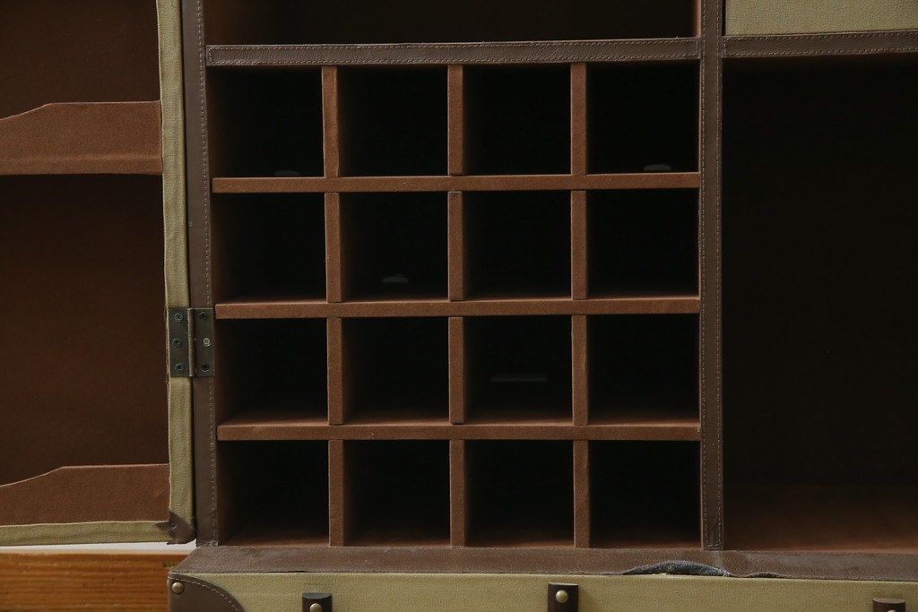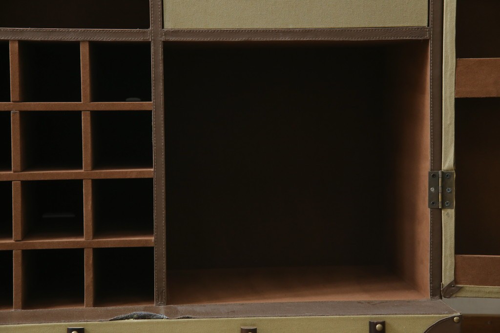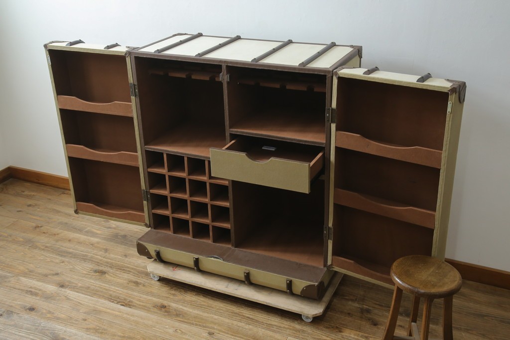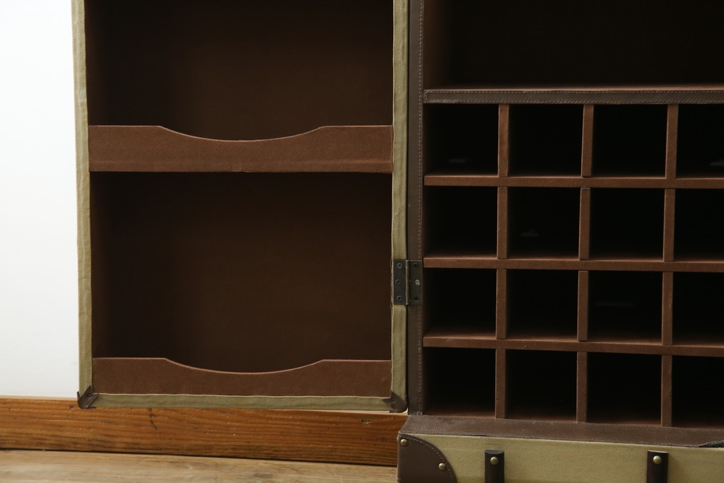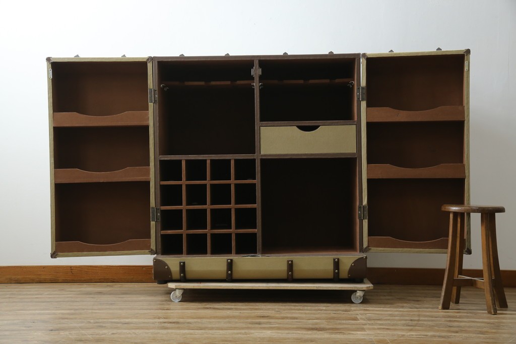 扉を開けると、棚・引き出し・仕切り・ワインラックなど、多様な収納スペースがバランス良く配置されています。ボトル収納を備えた珍しい構造で、バーコーナーや趣味部屋、店舗什器としても活躍しやすい実用性を兼ね備えています。