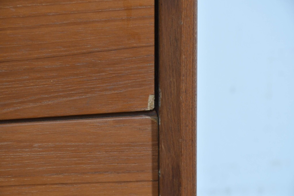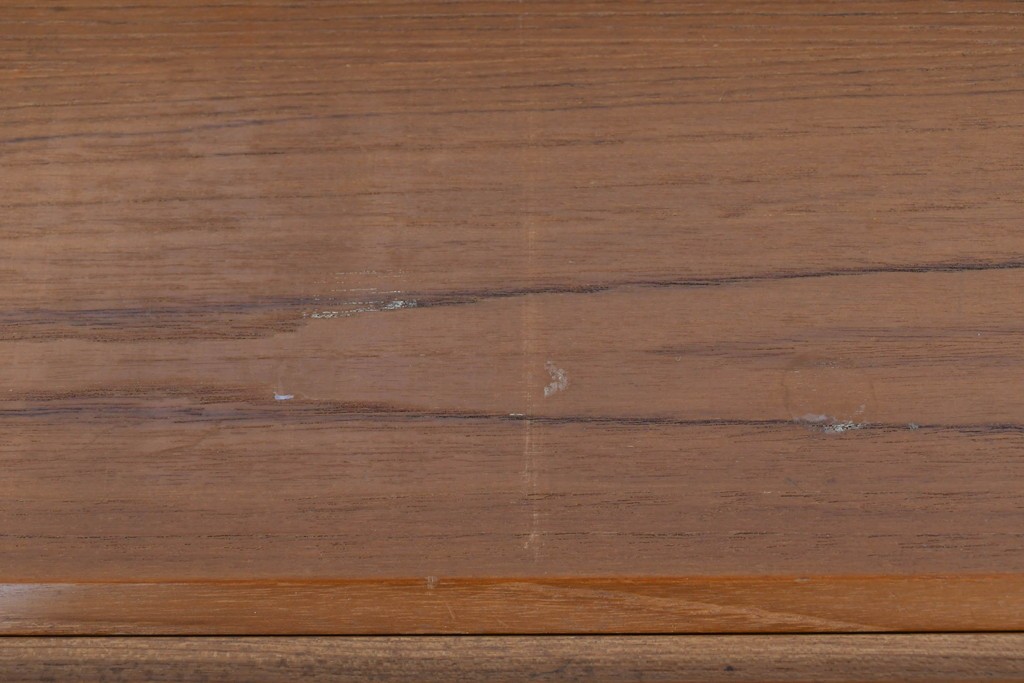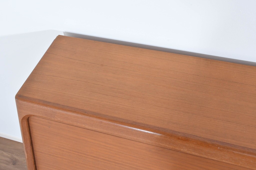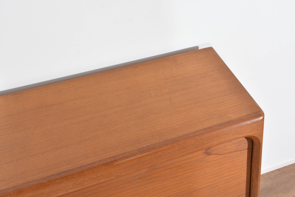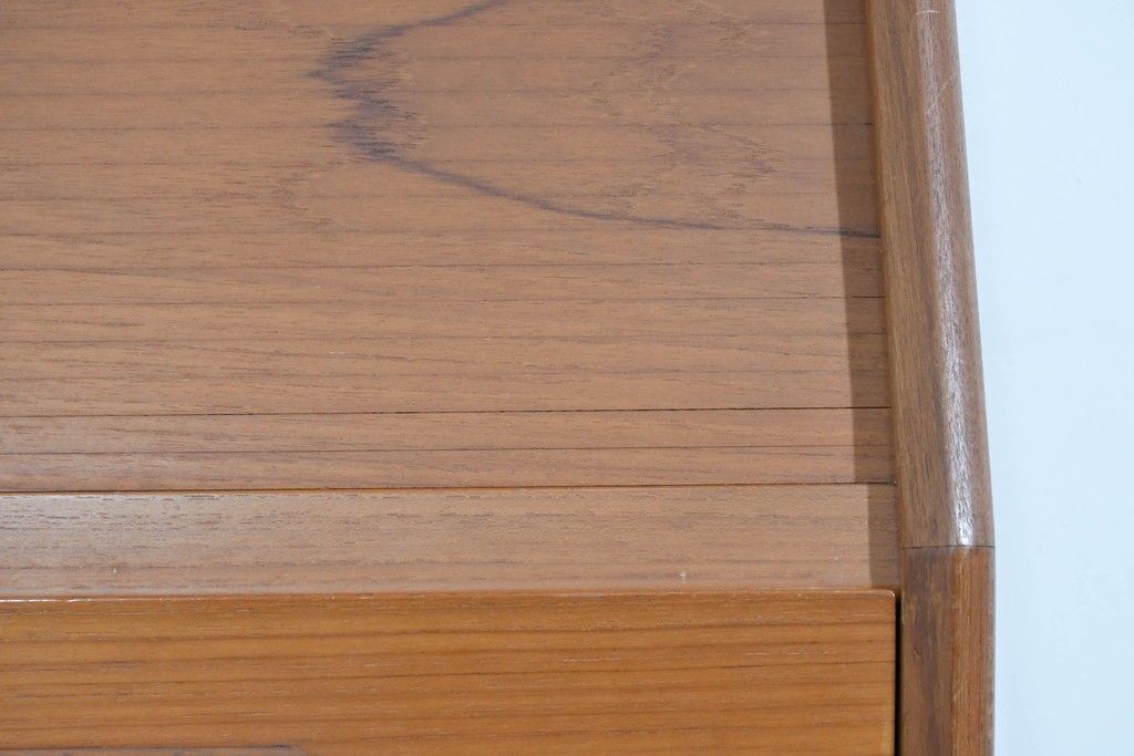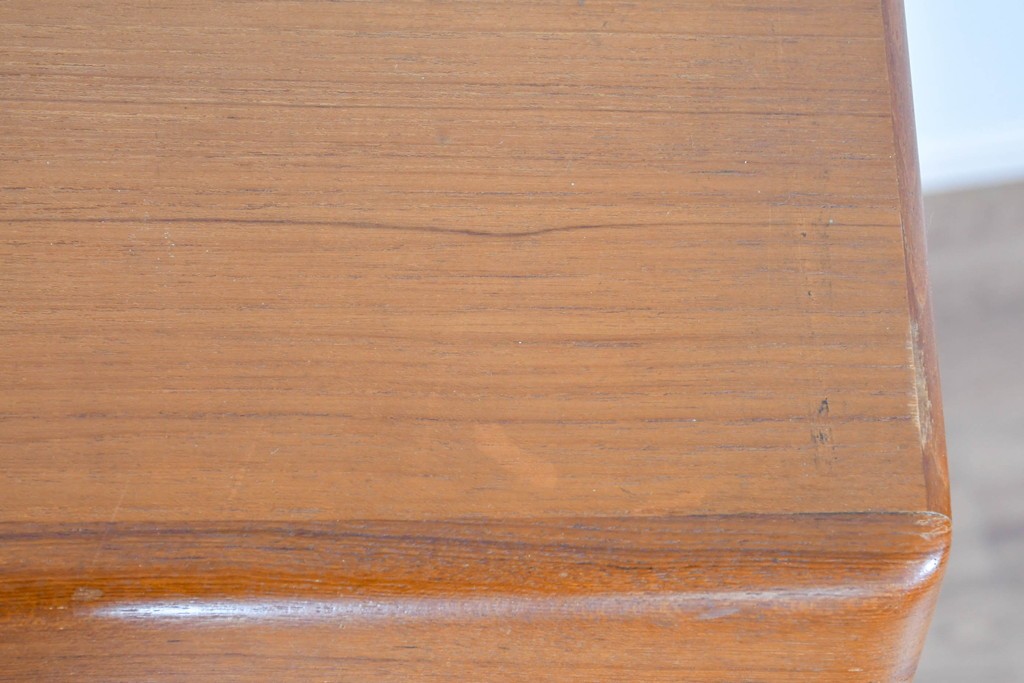 上質なチーク材が贅沢に使用され、経年により深まった色味と木目が美しく、どの角度から見ても風格を感じます。角に丸みをもたせたシルエットや滑らかな手掛けなど、細部に北欧家具らしい丁寧な木工技術が光ります。
