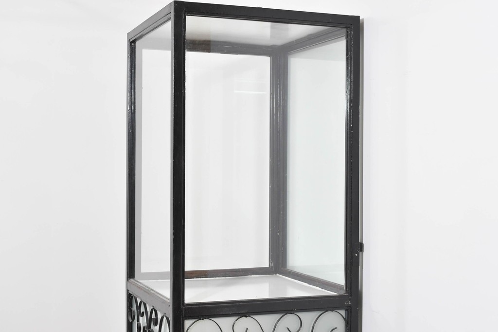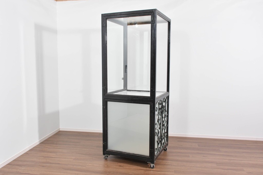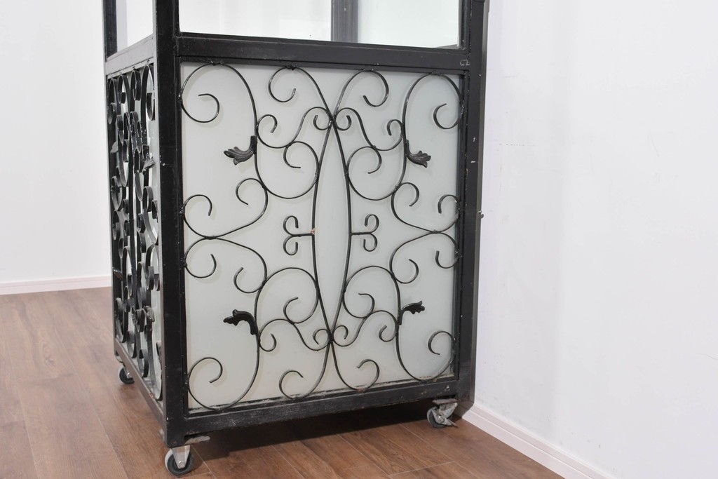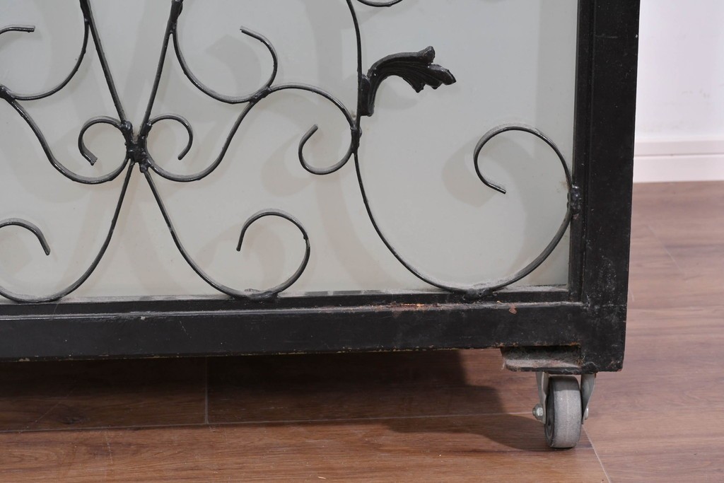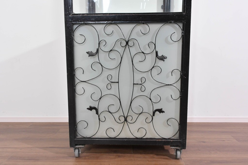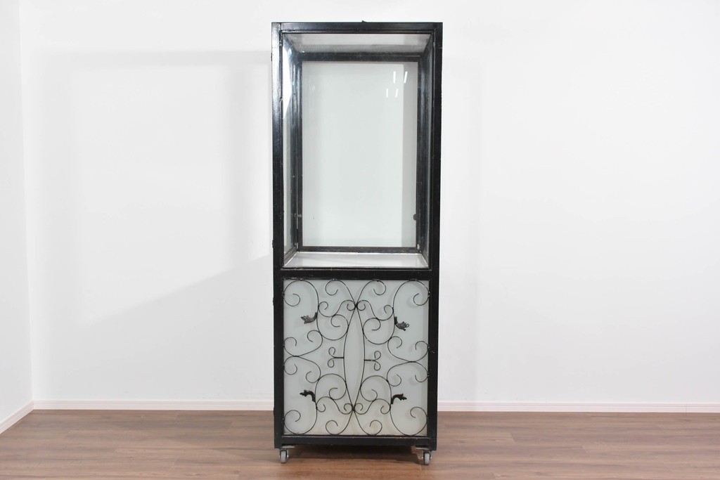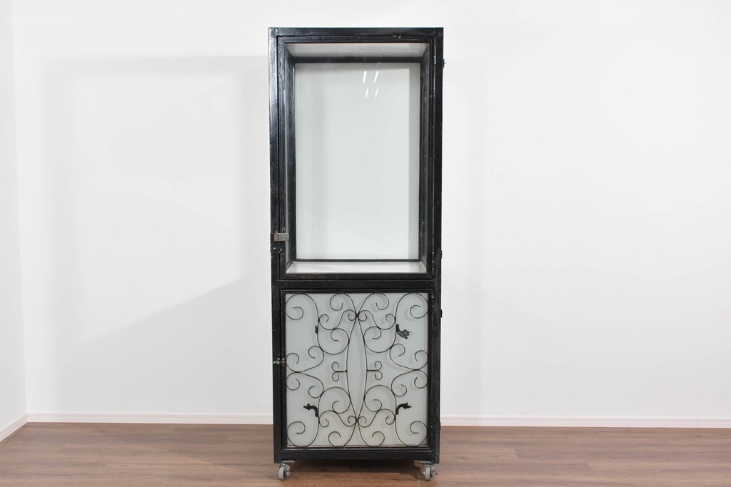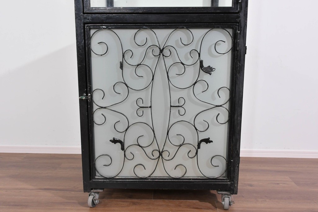 下部の扉にあしらわれた細やかな曲線装飾が、鉄製フレームの硬質感に柔らかな表情を加えています。優雅に流れるスクロールラインがショーケース全体のアクセントとなり、実用性とデザイン性を兼ね備えた特注品らしい魅力を感じさせます。飾る物だけでなく、家具そのものもインテリアとして楽しめる一台です。