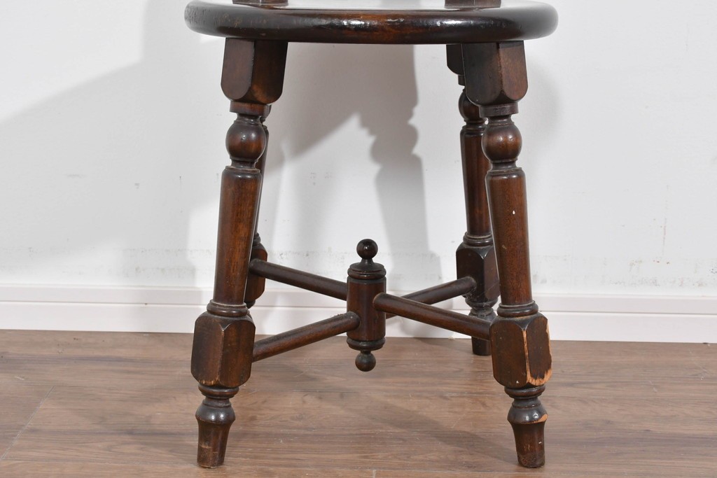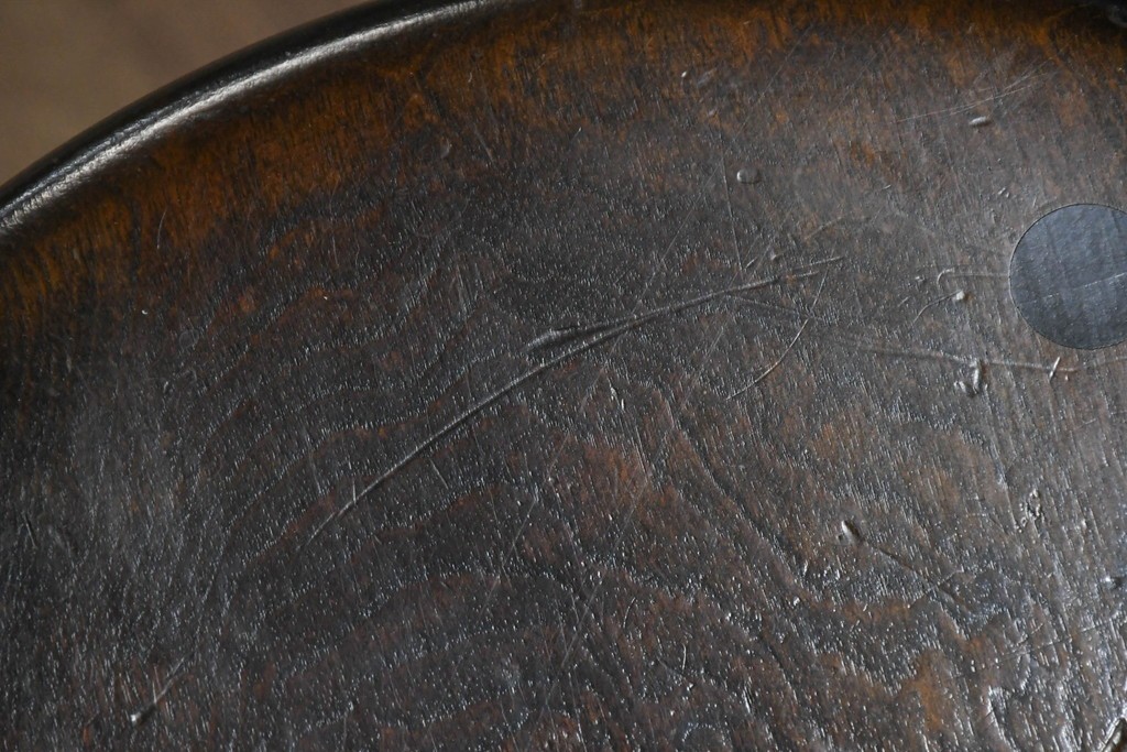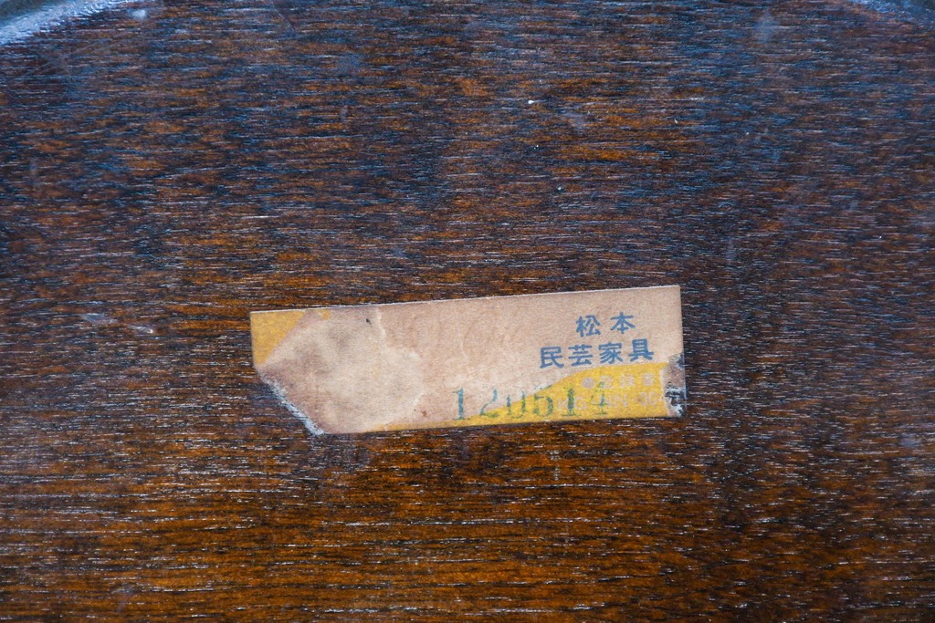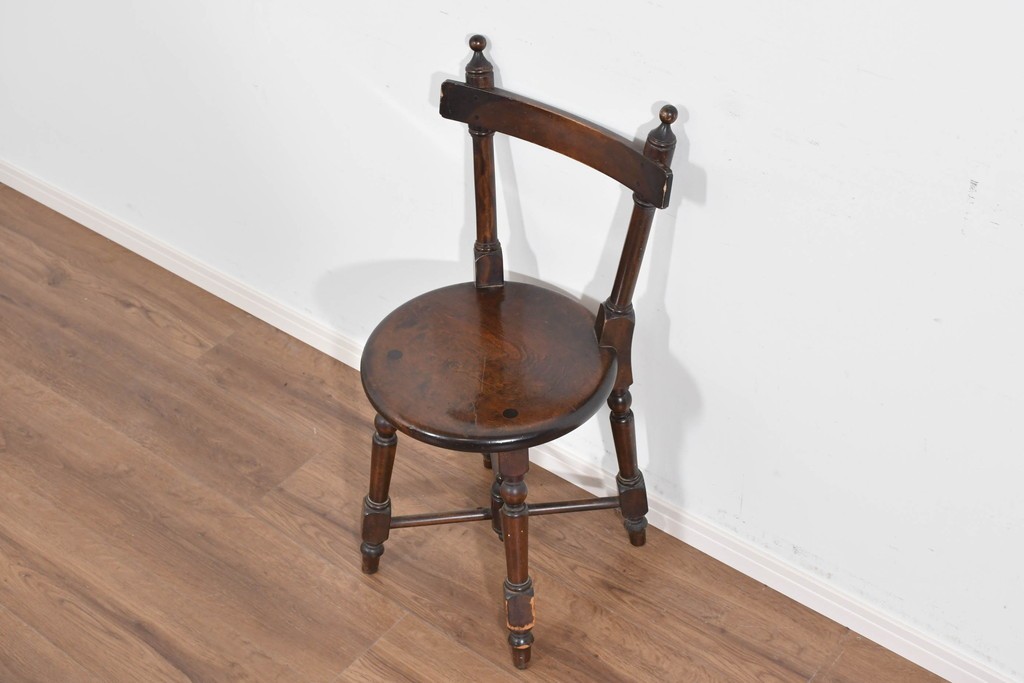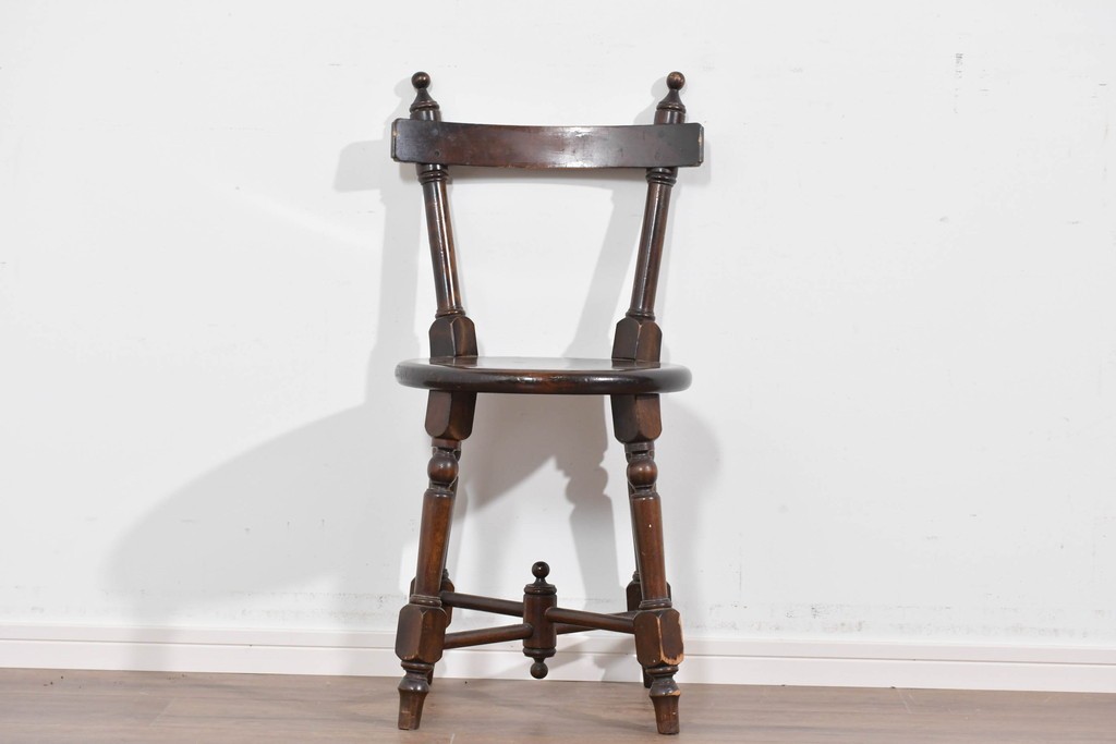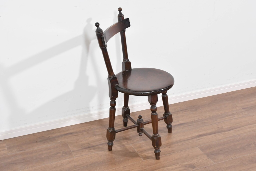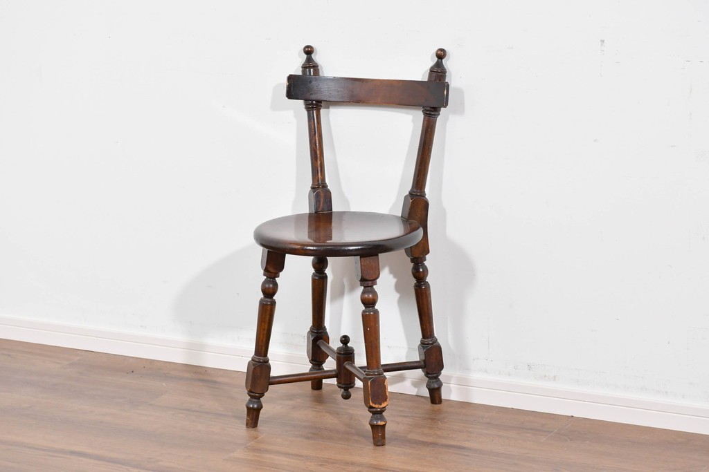 丸い座面や脚部の挽物意匠が特徴で、民芸家具らしい温かみを持つ一脚に仕上がっています。