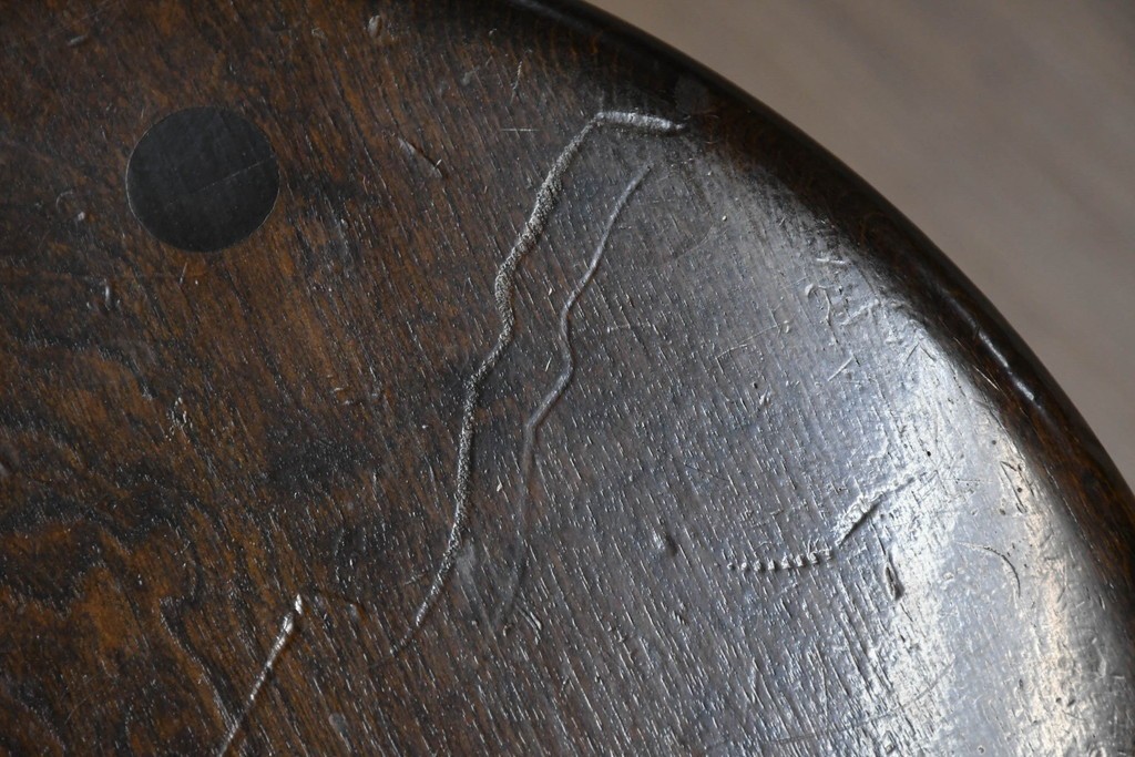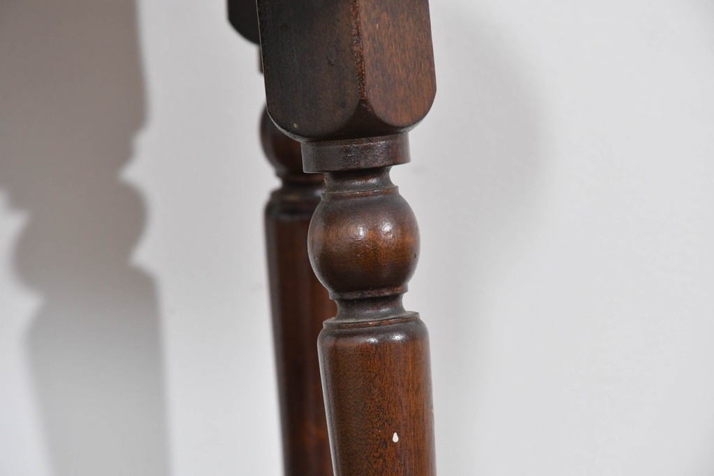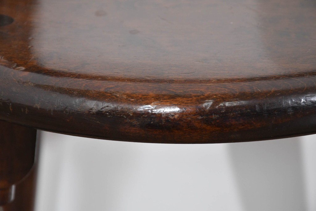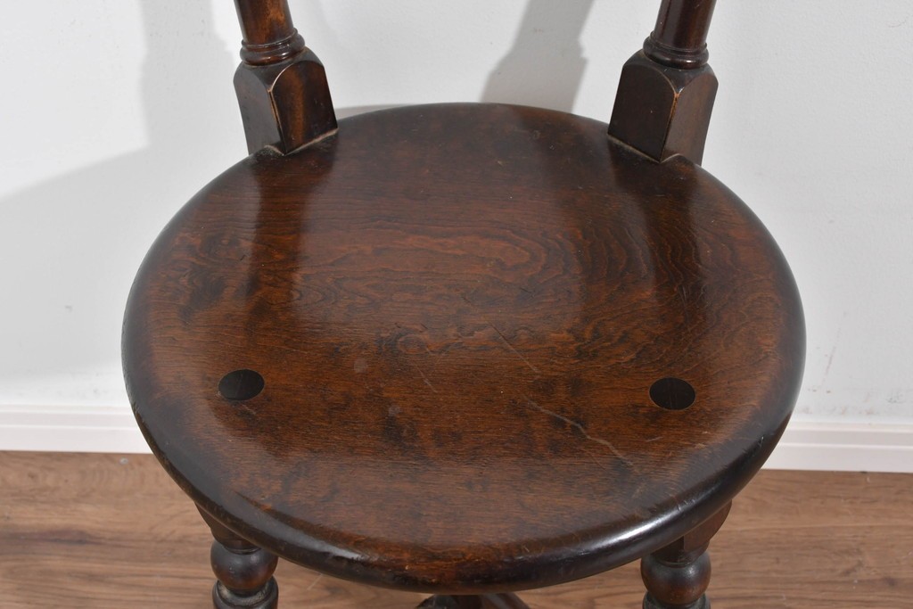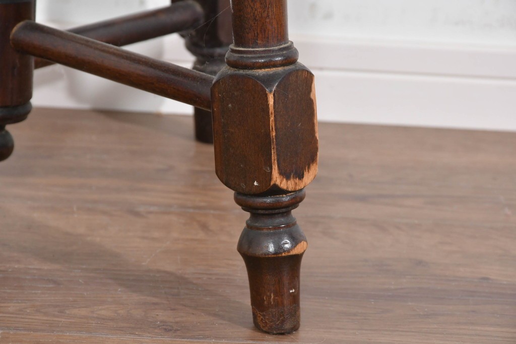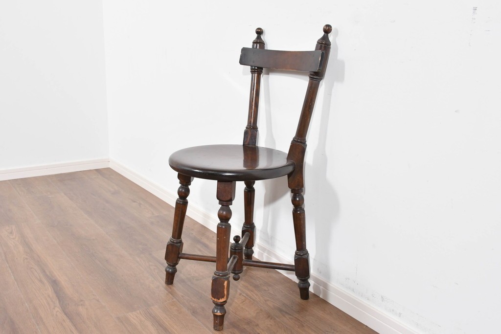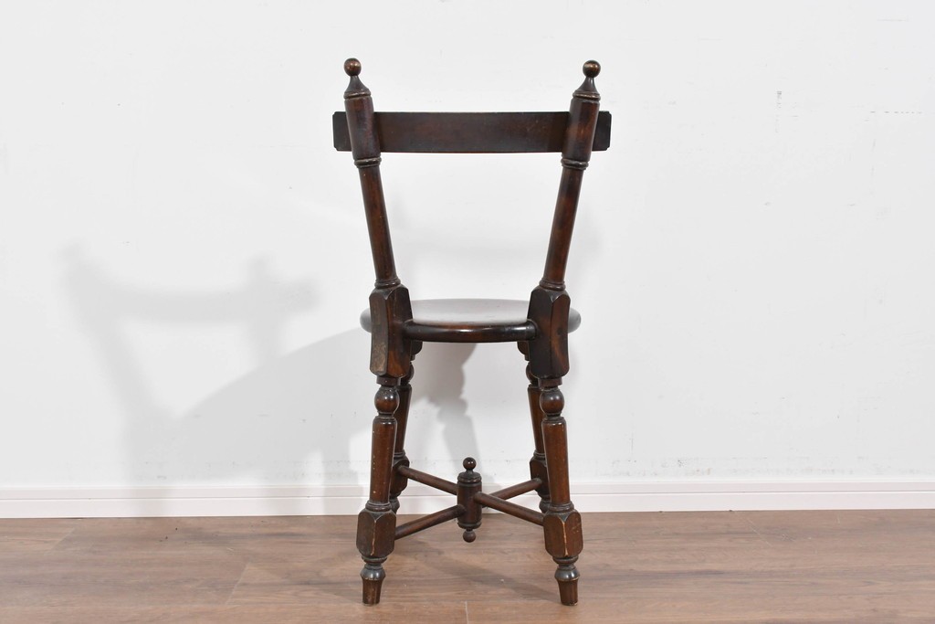 丸い座面や脚部の挽物意匠が特徴で、民芸家具らしい温かみを持つ一脚に仕上がっています。