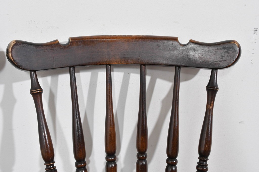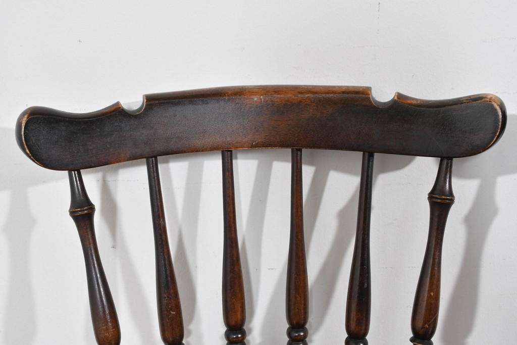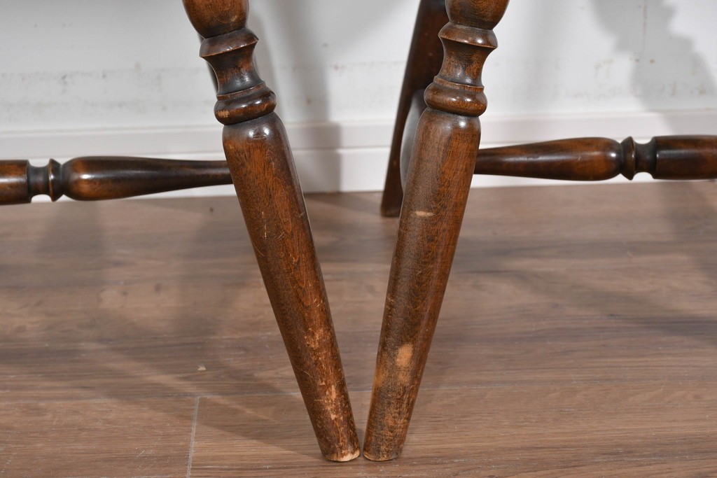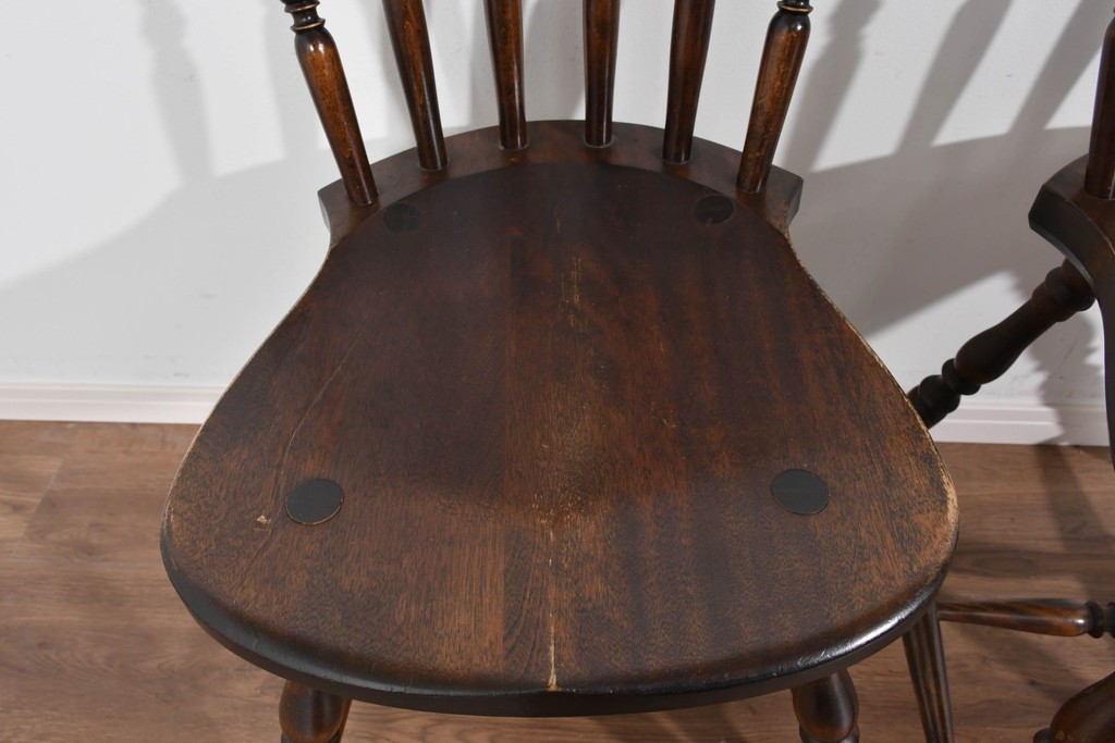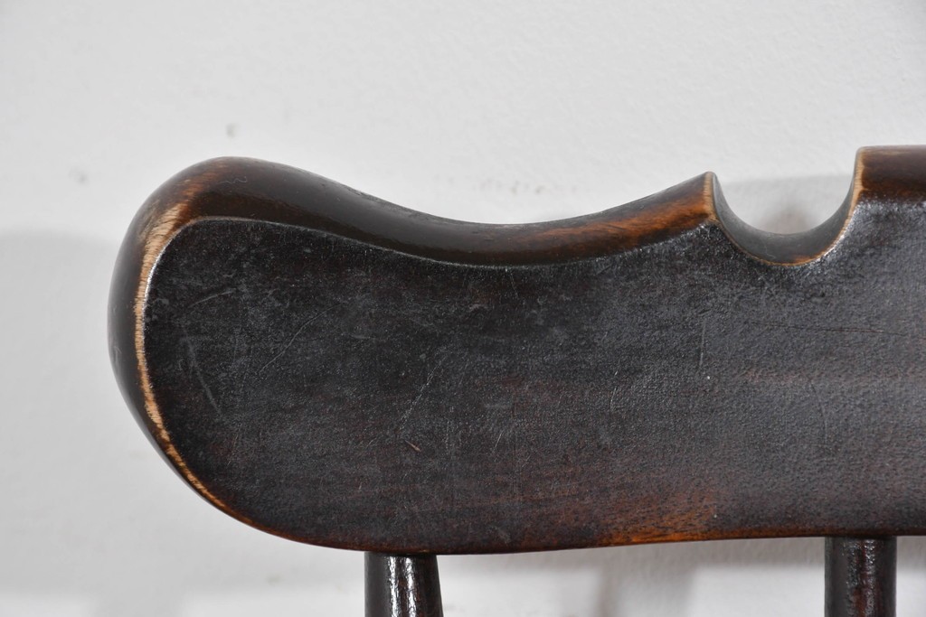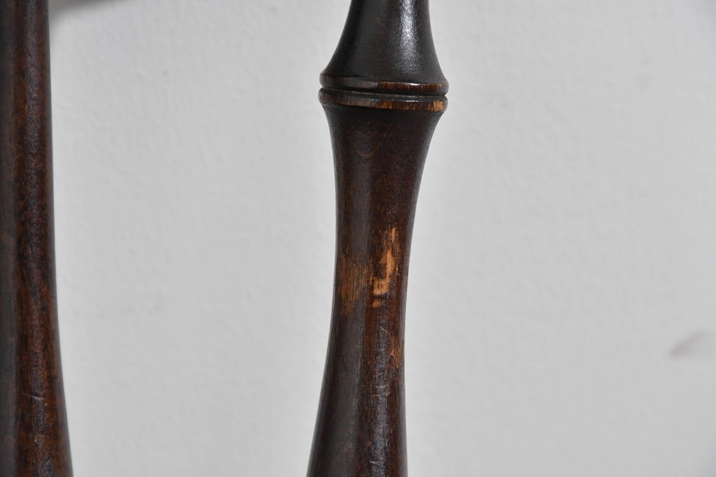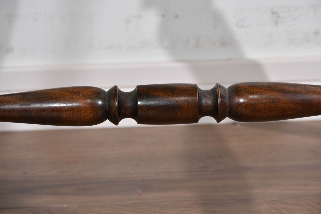 背もたれや脚部に施された挽物意匠が特徴で、民芸家具らしい温かみと存在感を感じられる一脚です。